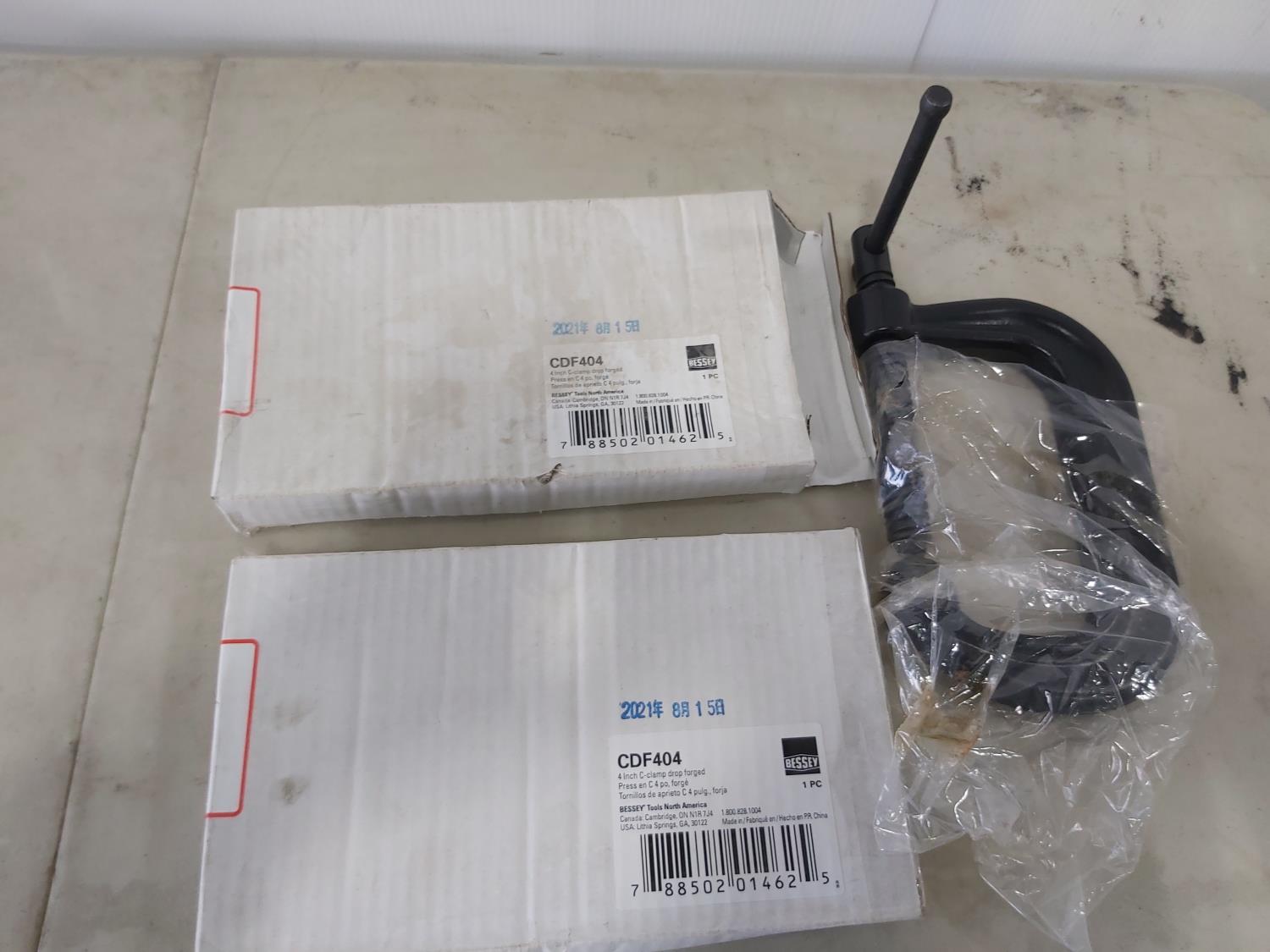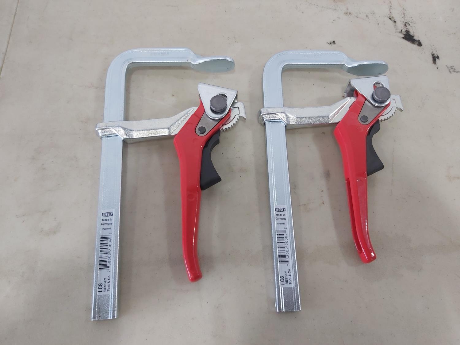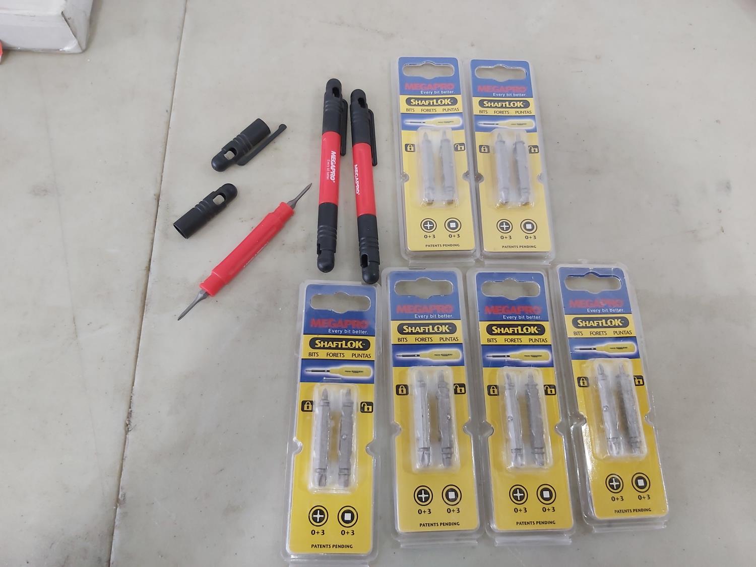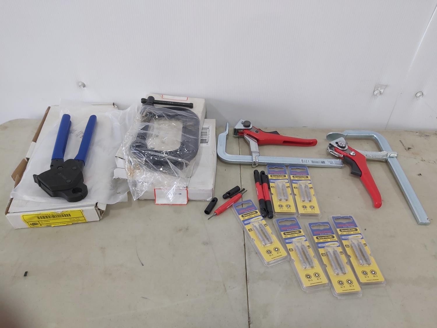 (12) hex bits, (3) pen size double screwdrivers, (2) 6 inch Bessey ratcheting clamps, (2) 4 inch C-clamps, 1/2 inch pex crimper tool
