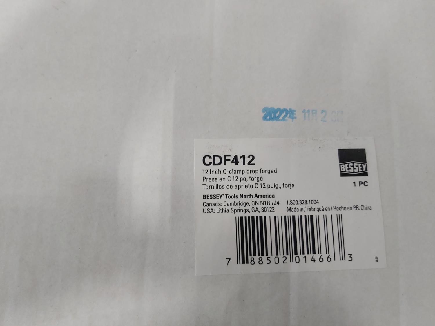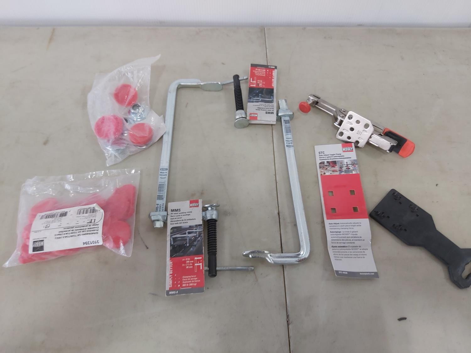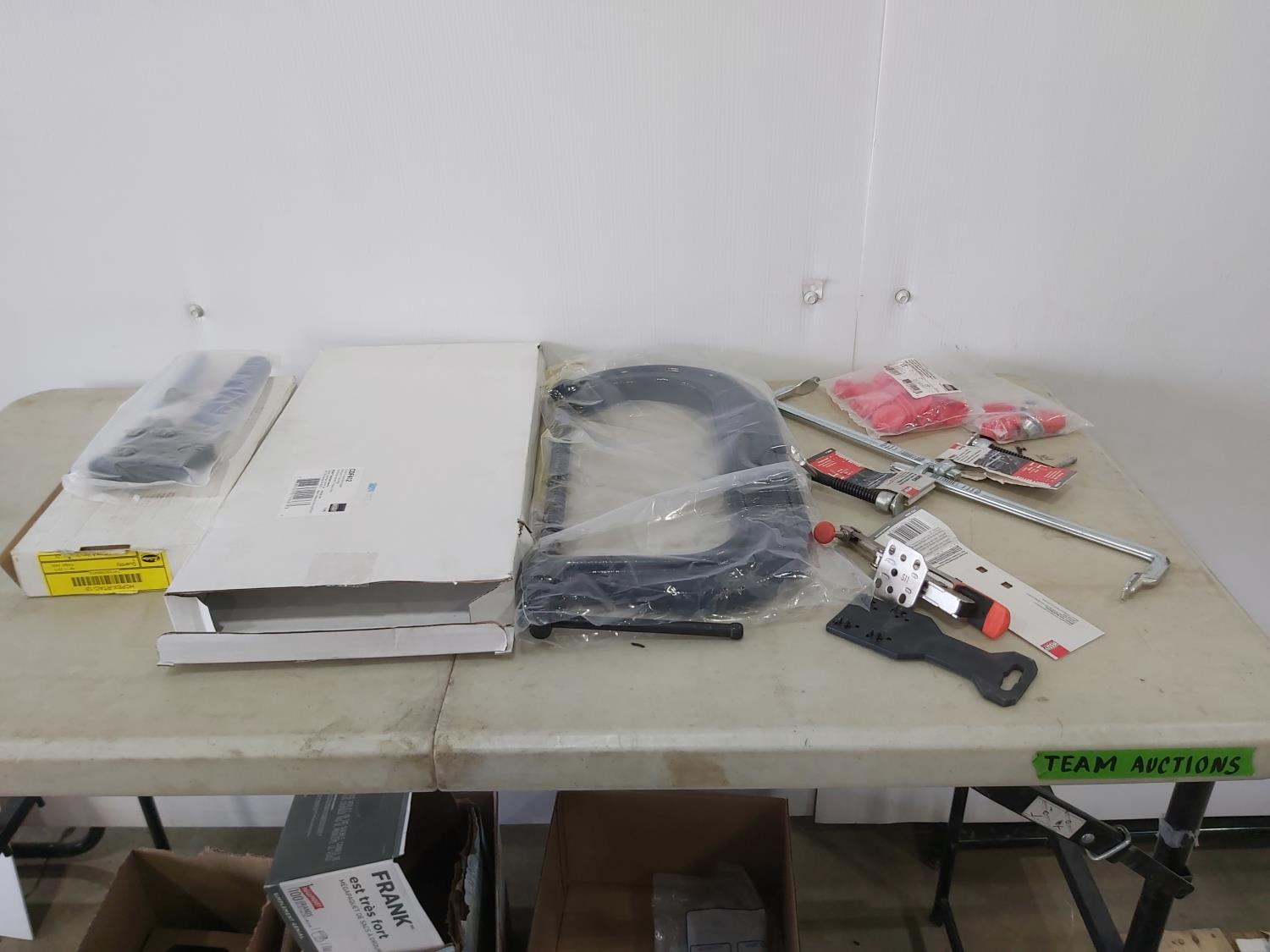 12 inch Bessey C-clamp, 1/2 inch pex crimping tool, (2) 2-1/2 inch Bessey ratcheting clamps and protectors