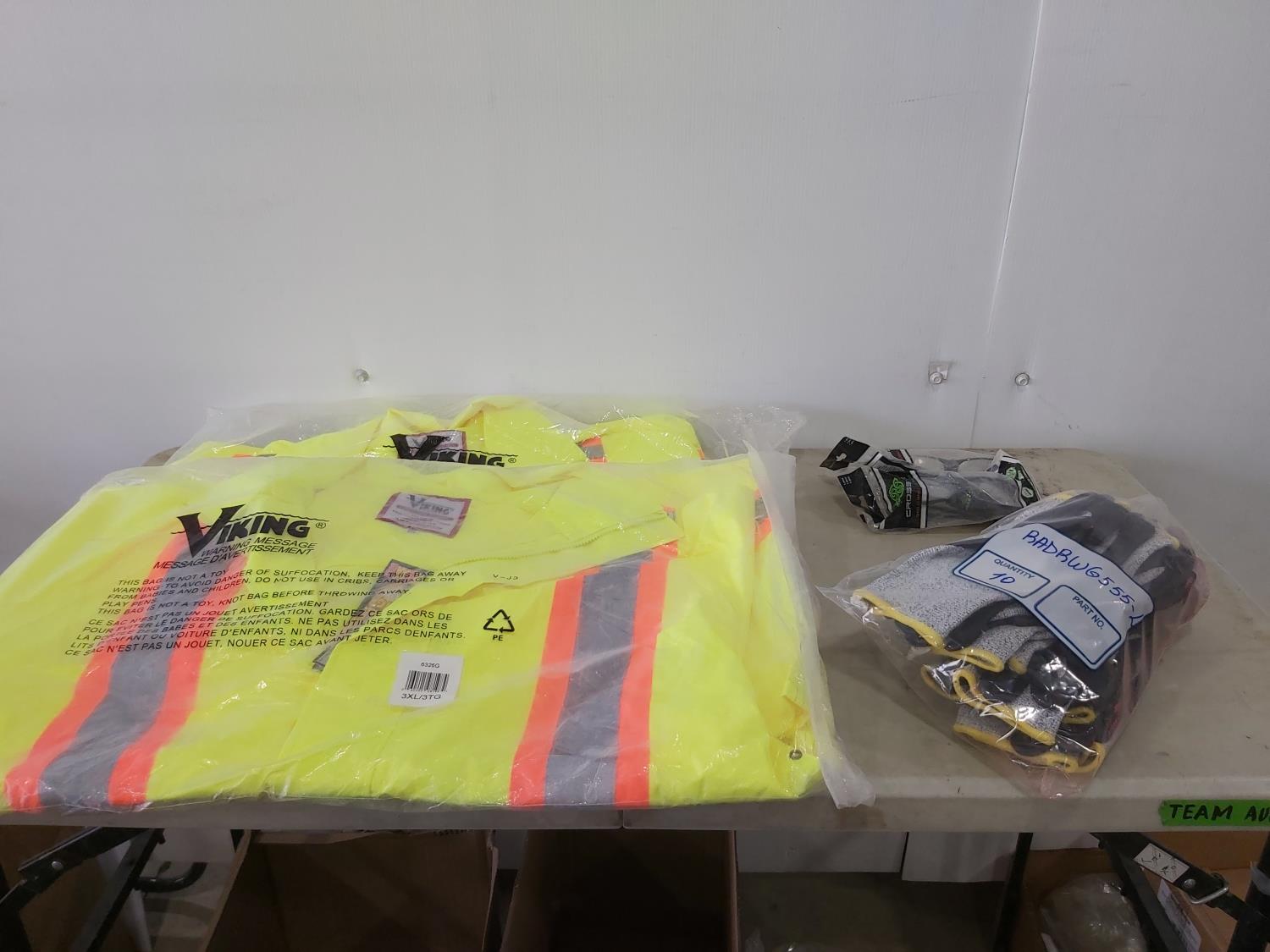 2XL Viking waterproof reflective jacket, 3XL Viking waterproof reflective jacket, (10) pairs Large gloves, (2) safety glasses