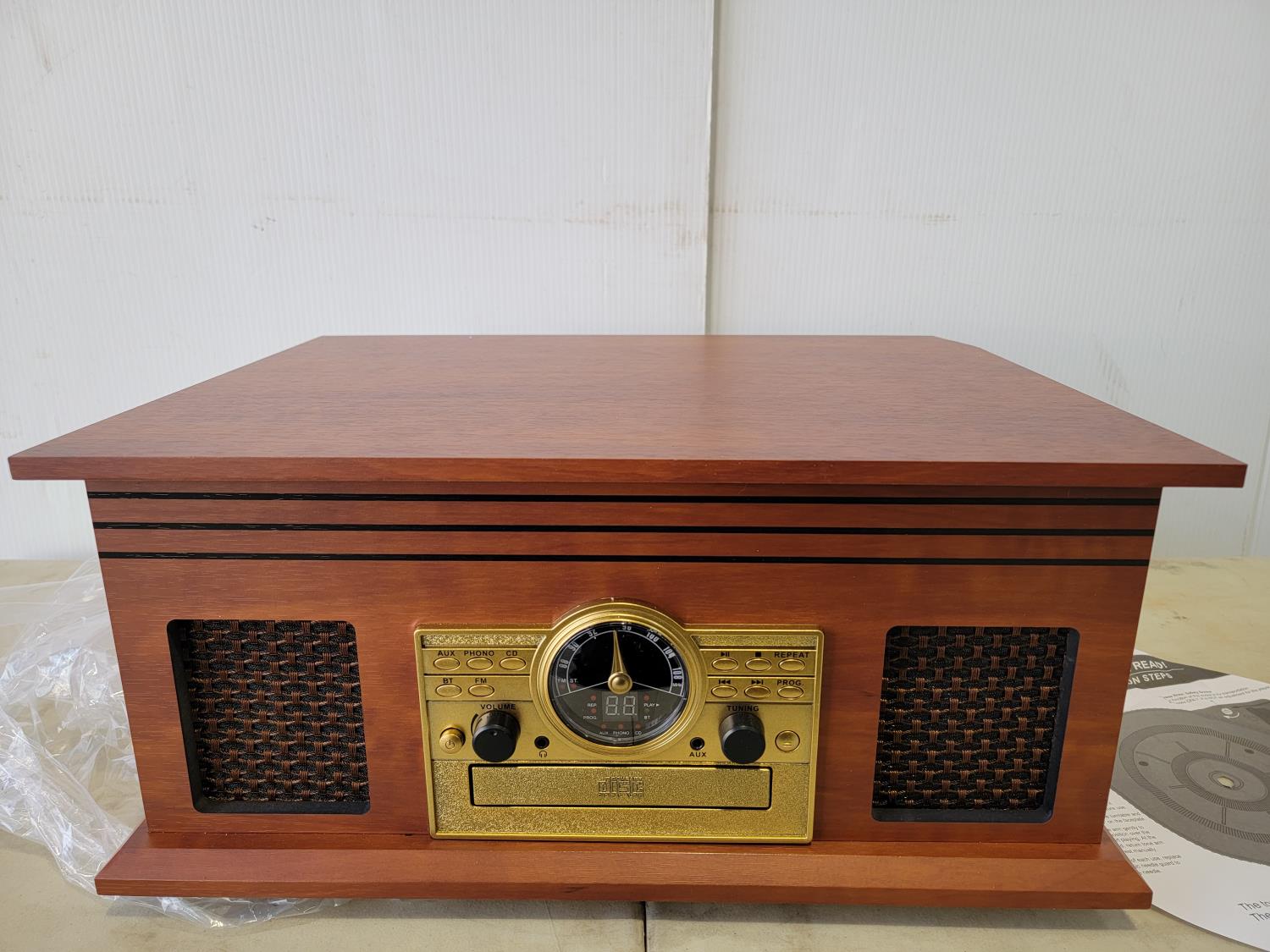 3-speed turntable, CD, Cassette, Aux, Bluetooth, FM radio