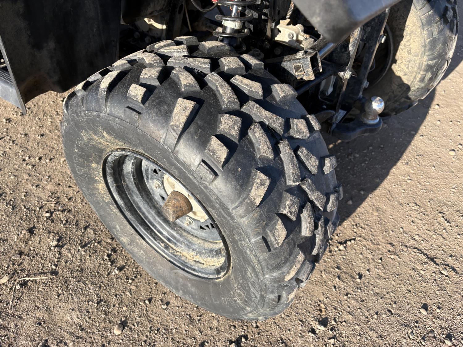 300 cc fuel injected water cooled engine, automatic transmission, Hi/Lo range, reverse, front and rear racks, front winch, alarm theft system, remote start, needs battery, 25X8-12 front tires, 25X10-12 rear tires