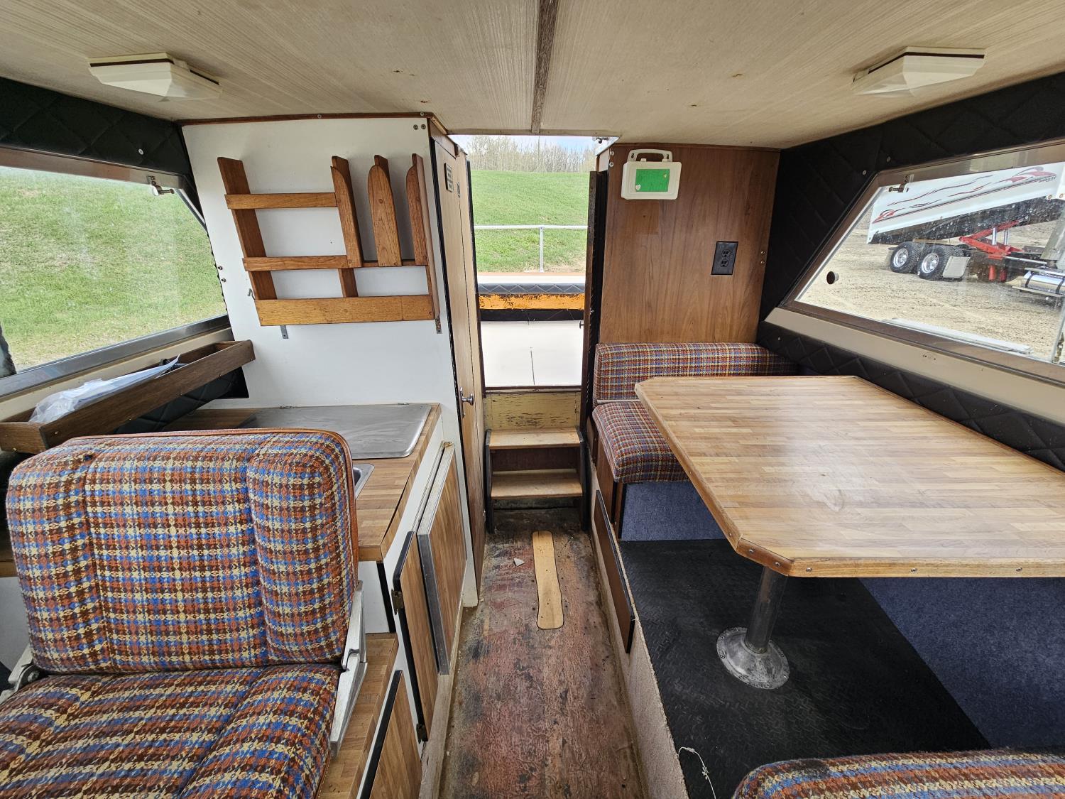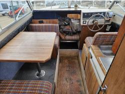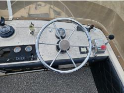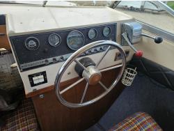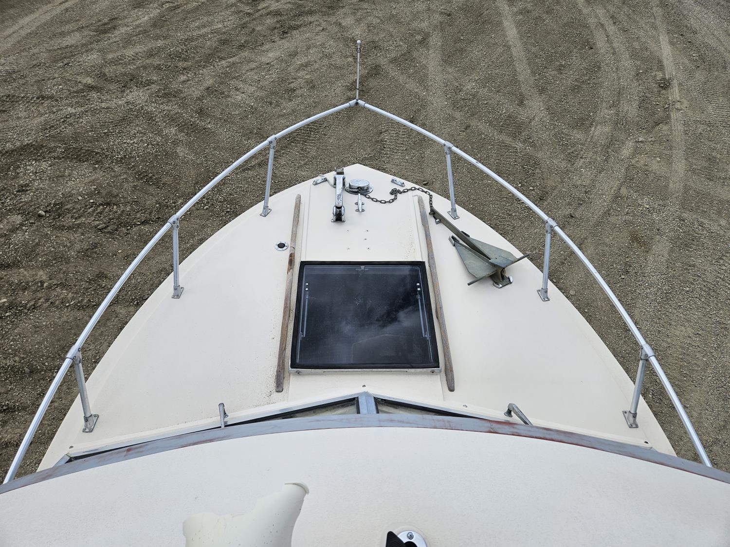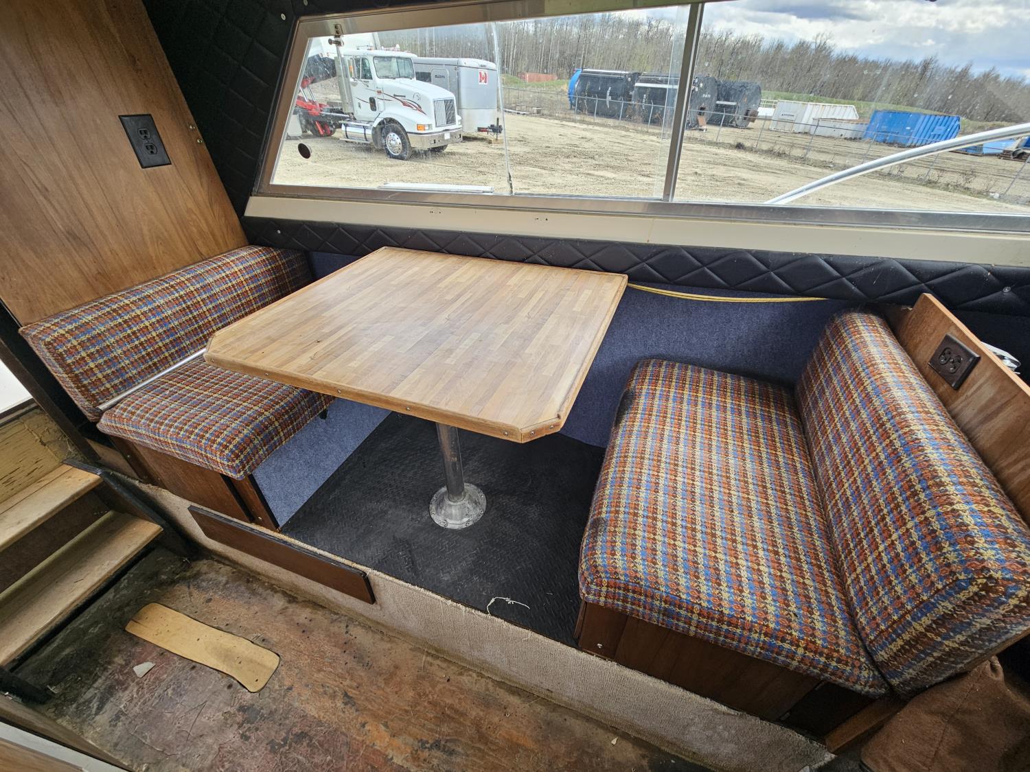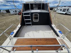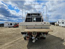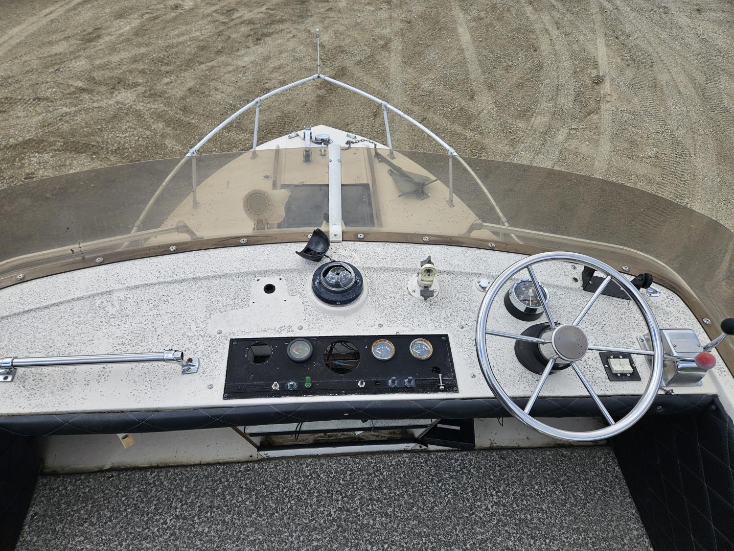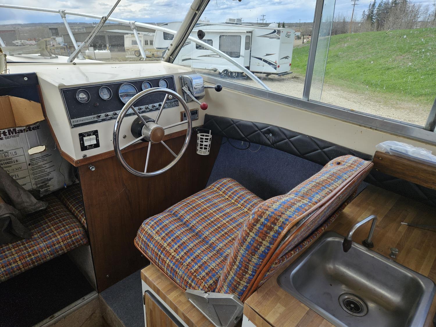 Chevrolet 350 V8 gas inboard engine, 2 steering wheels, storage compartments, toilet, dinette, sink stove top, fridge, 215/70R15 tires