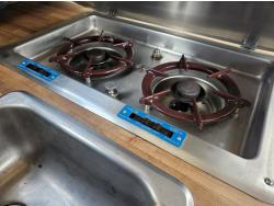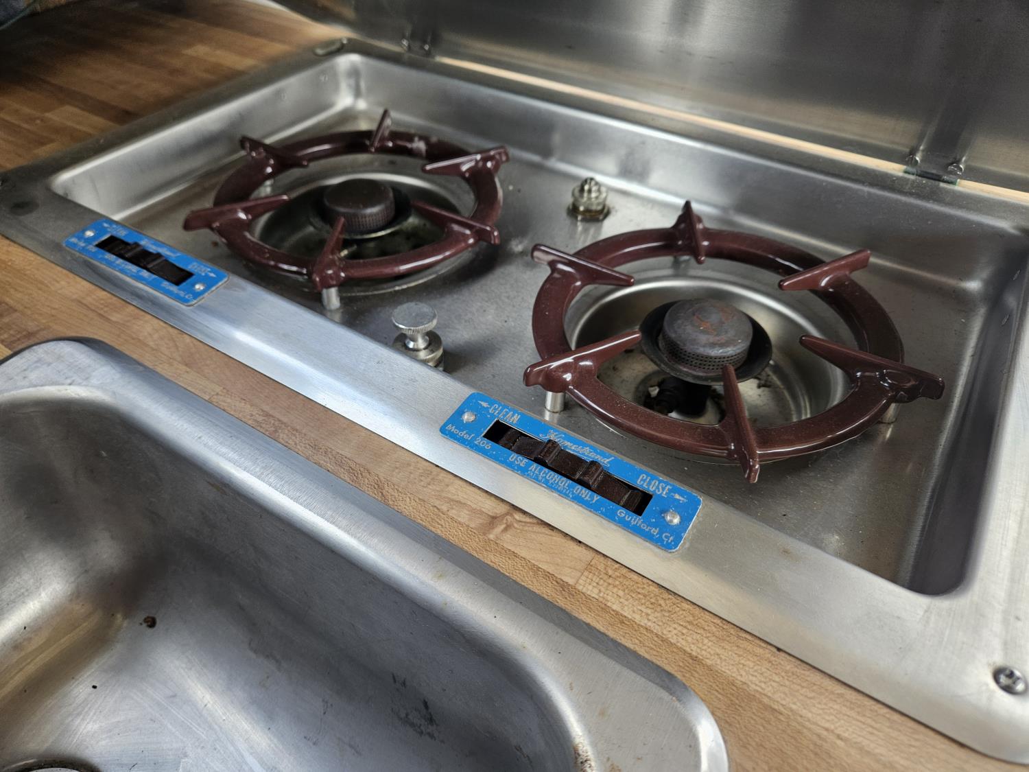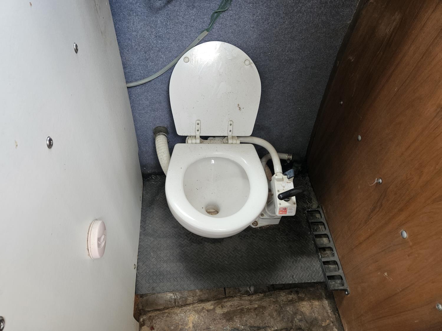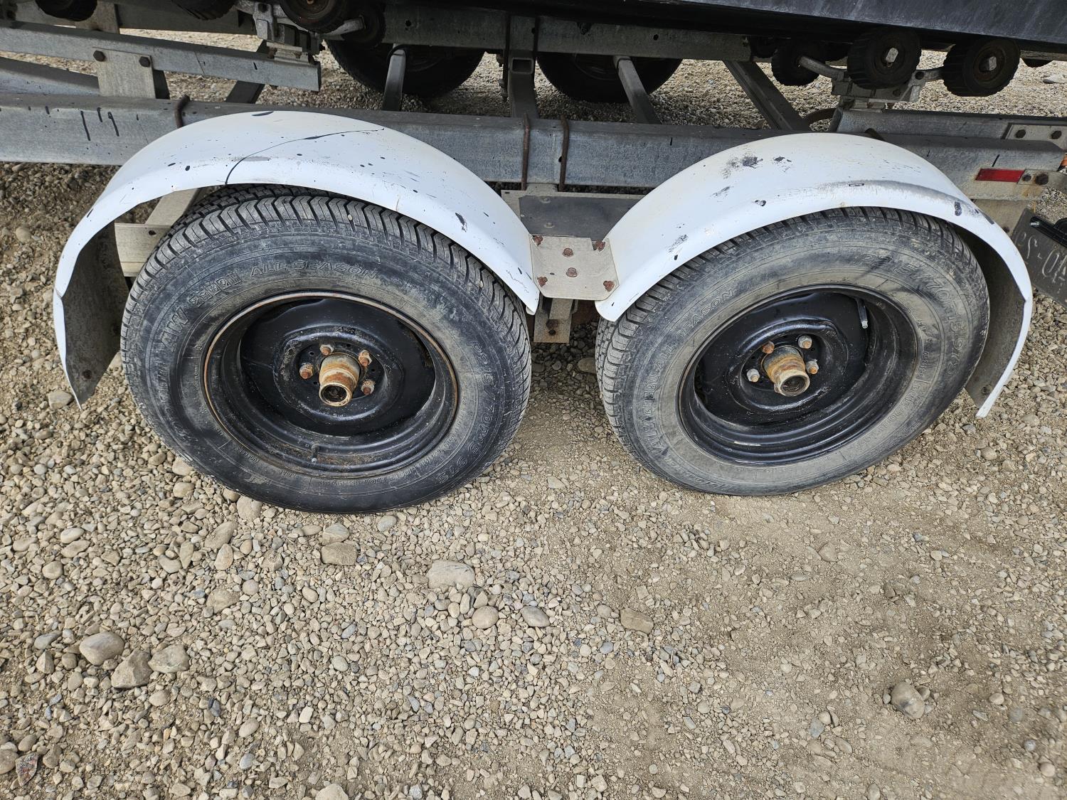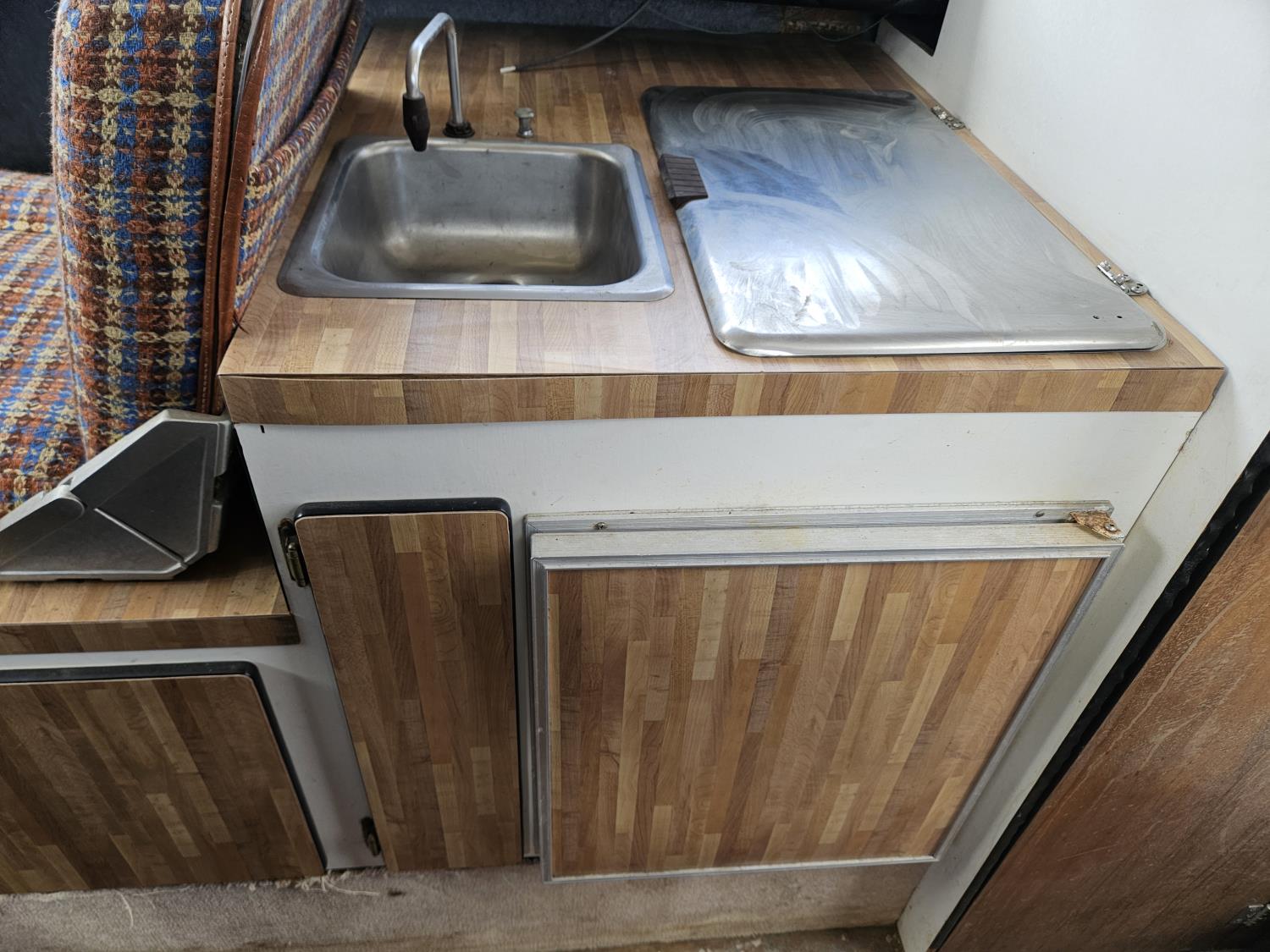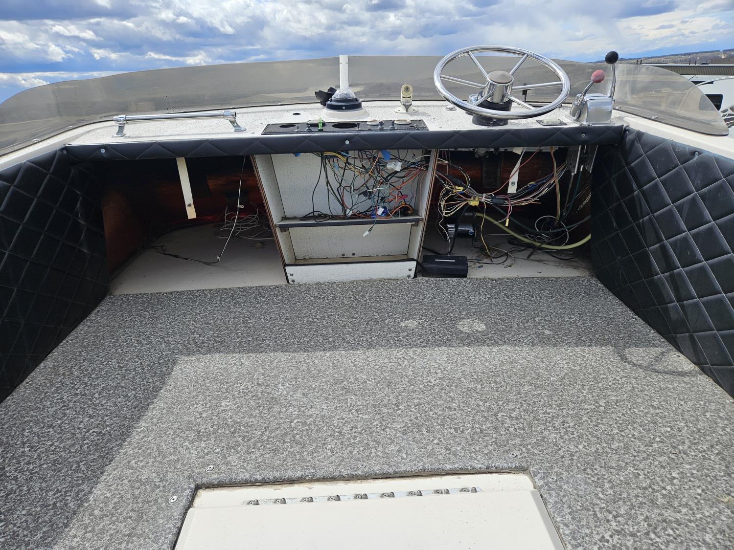 Chevrolet 350 V8 gas inboard engine, 2 steering wheels, storage compartments, toilet, dinette, sink stove top, fridge, 215/70R15 tires