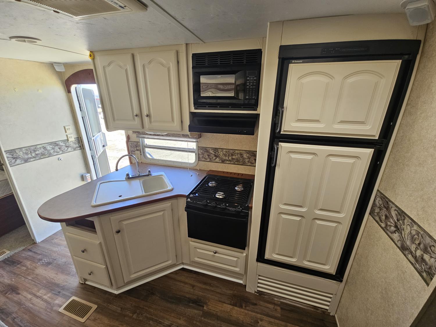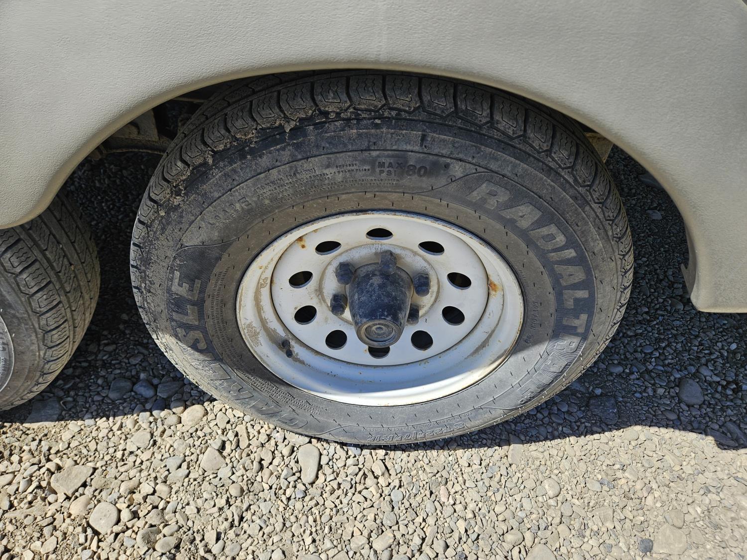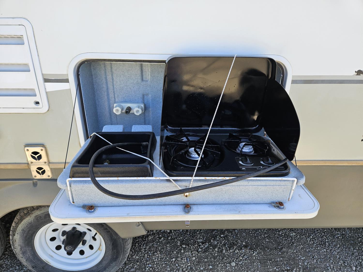 Sleeps 10, stove, fridge, microwave, full bath, A/C, outdoor kitchen, 1 slide, manual awning, spring suspension, electric brakes, quad bunks, dinette, sofa, 225/75R15 tires