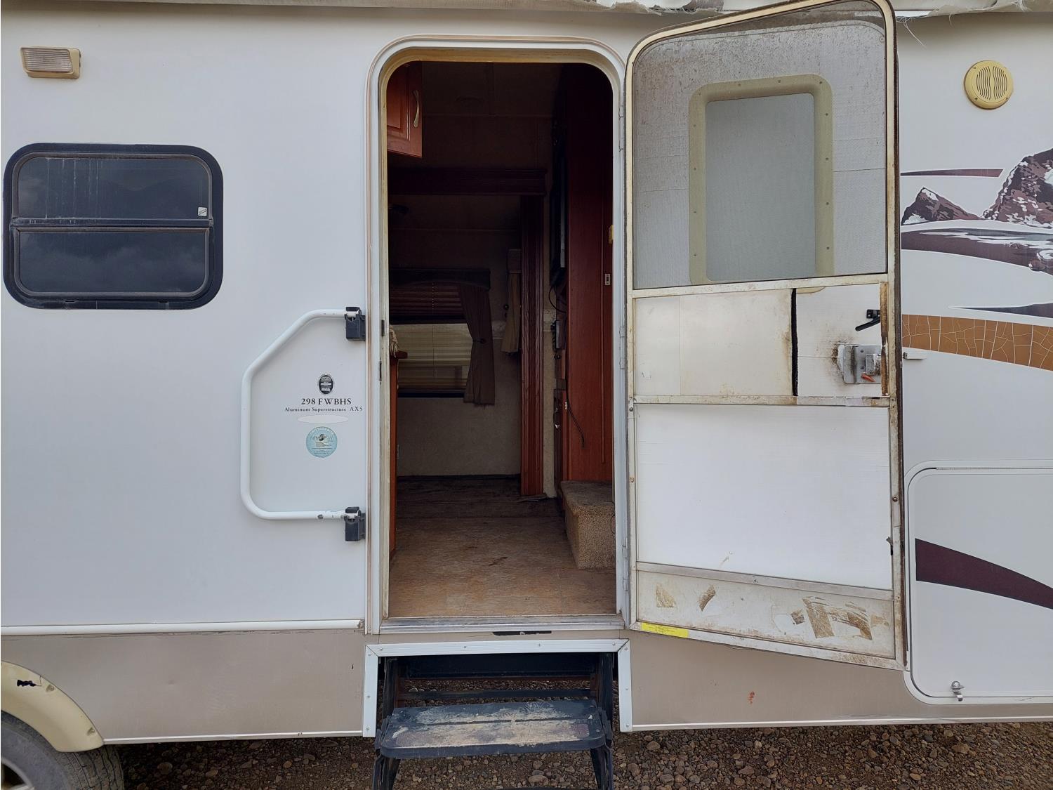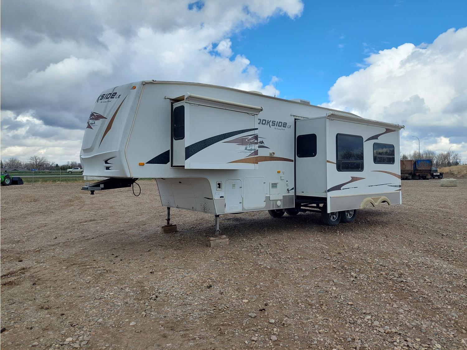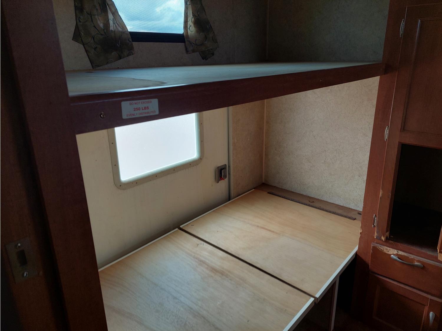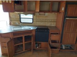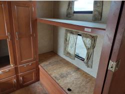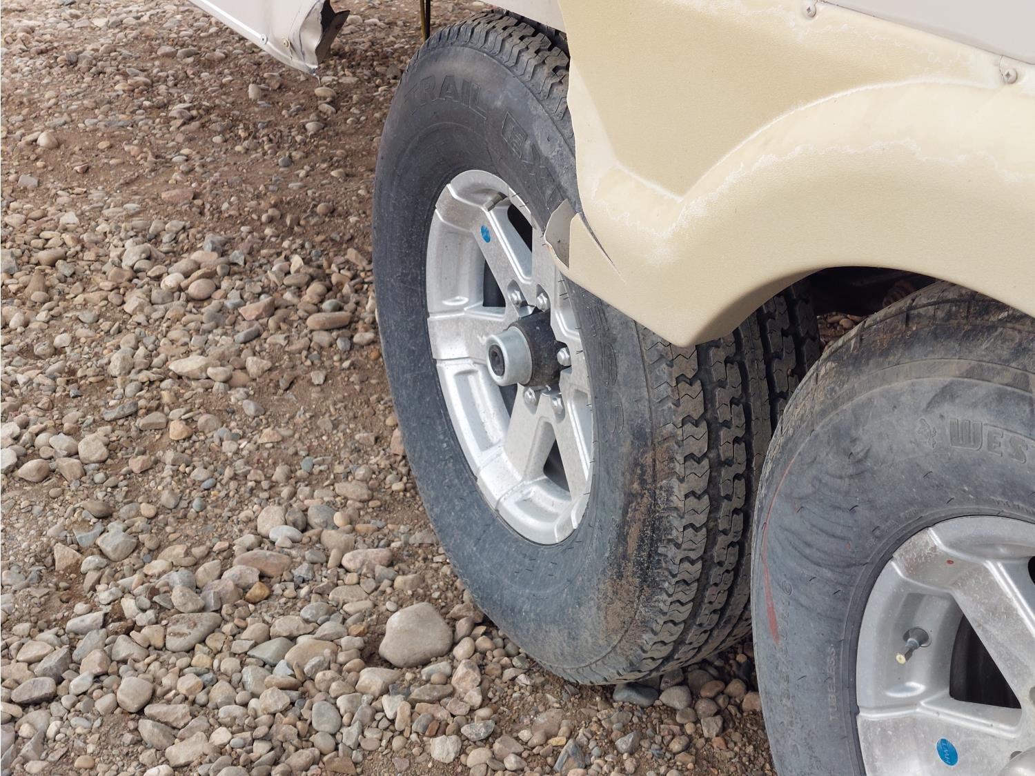Sleeps 8, stove, fridge, full bath, master bedroom, bunk beds, A/C, outdoor shower, 2 slides, manual awning, spring suspension, electric brakes, 235/80R16 tires