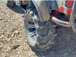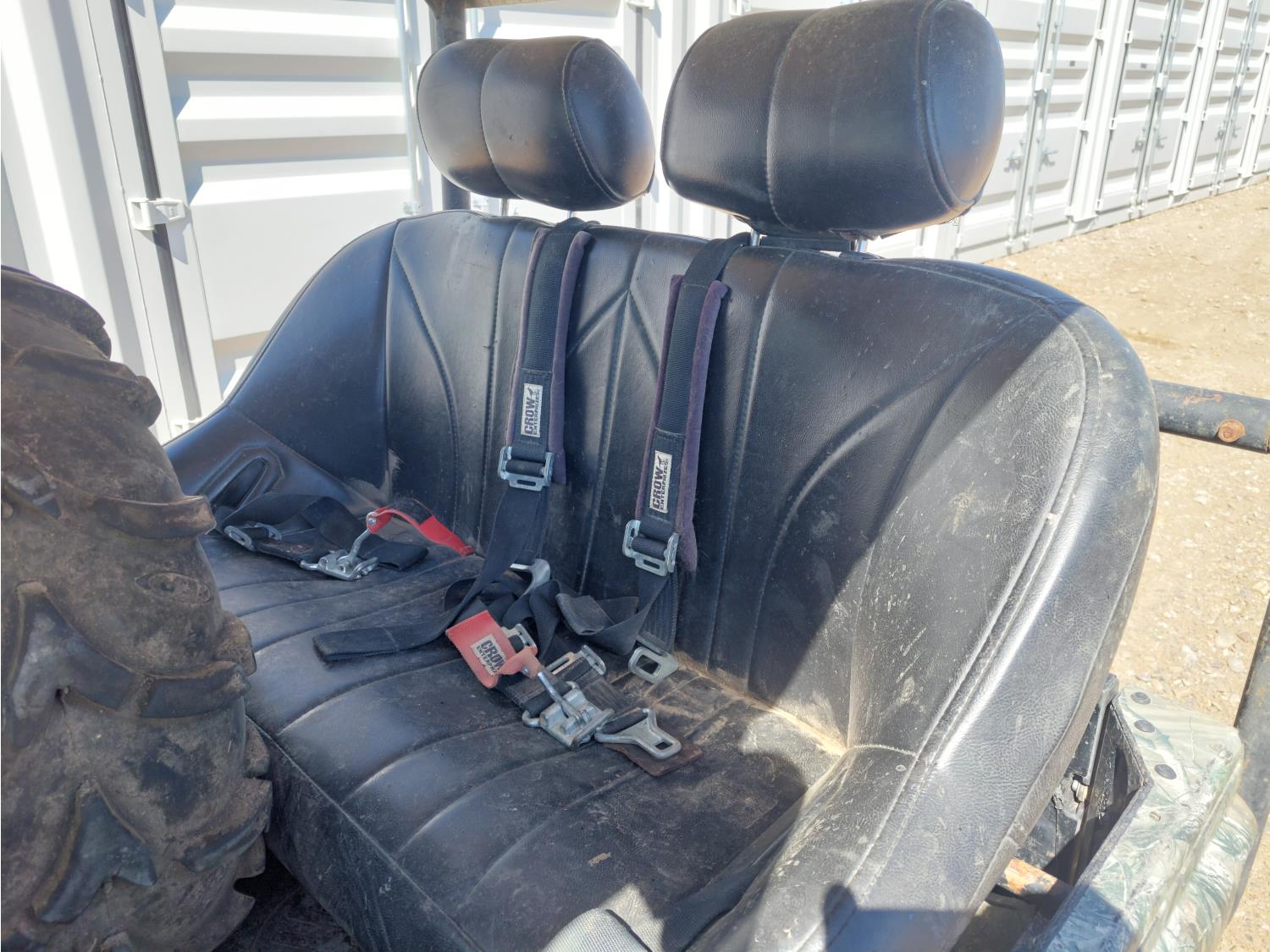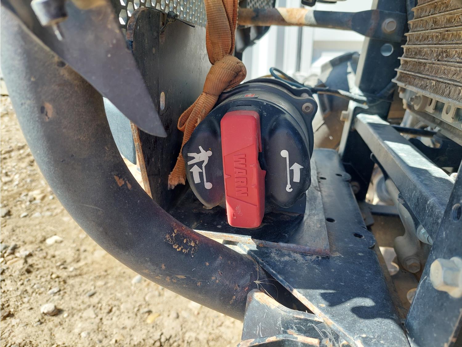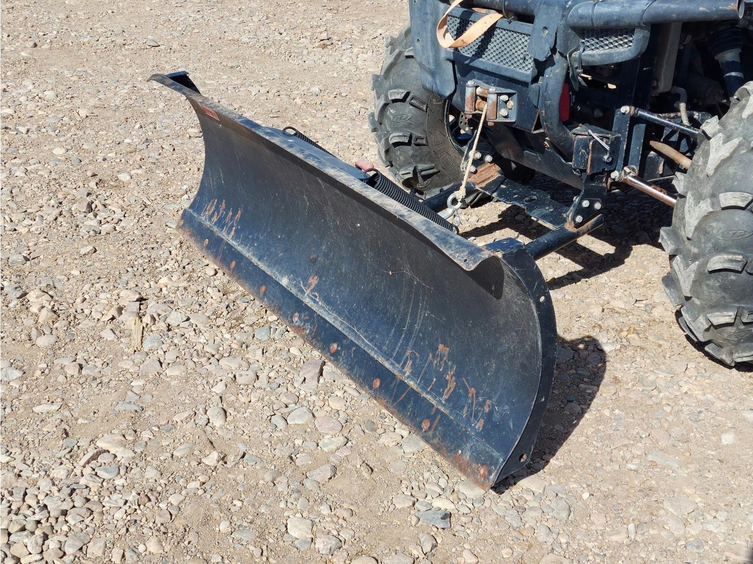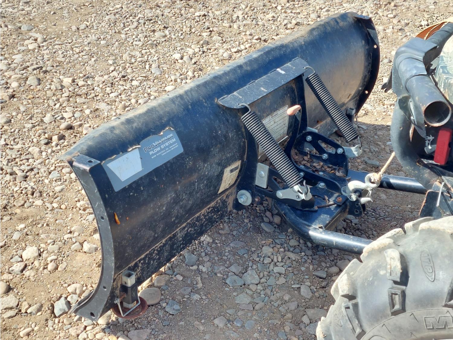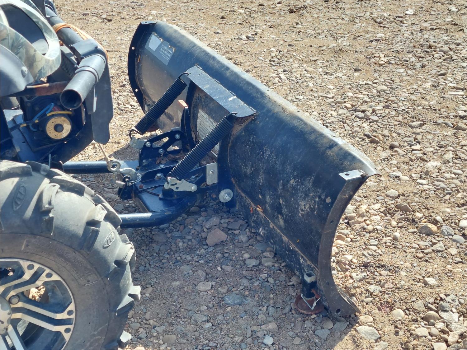 700 cc fuel injected water cooled engine, automatic transmission, Hi/Lo range, reverse, 2 door enclosed cab, heater, windshield, 60 inch front blade, front winch, hitch, independent suspension, VDP sound and light bar, LED lights, secondary seat, extended roof, spare 26x12.00-12 tire on rim, aluminum wheels, 26X10.00-12 front tires, 26X12.00-12 rear tires