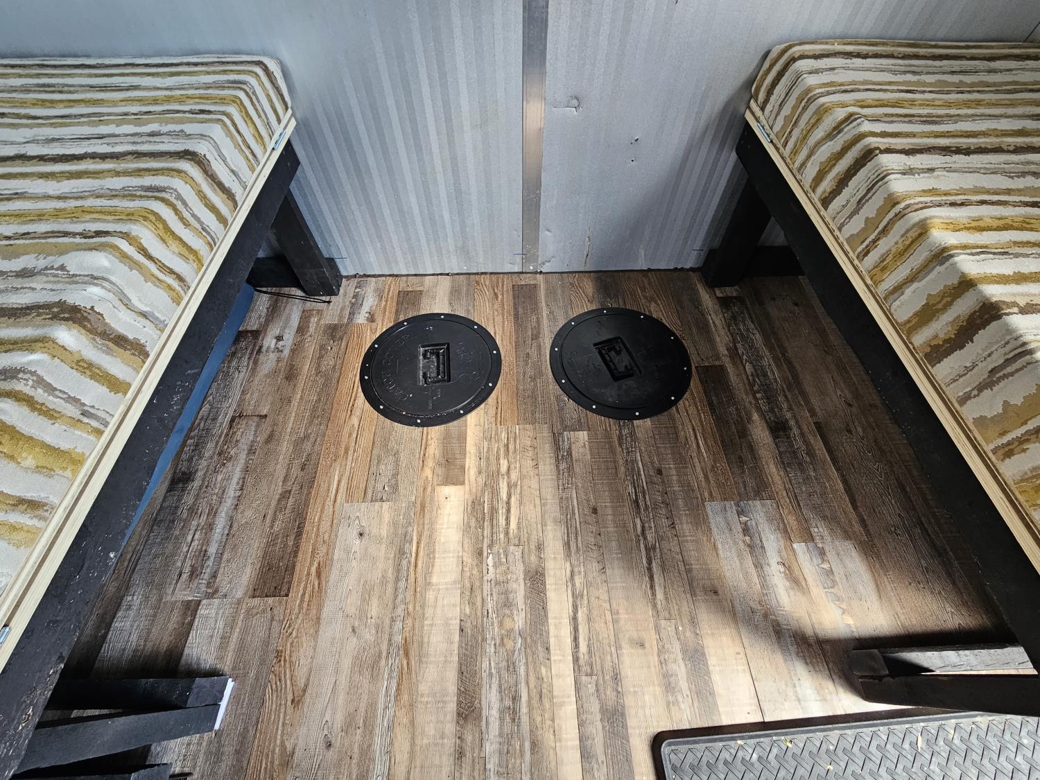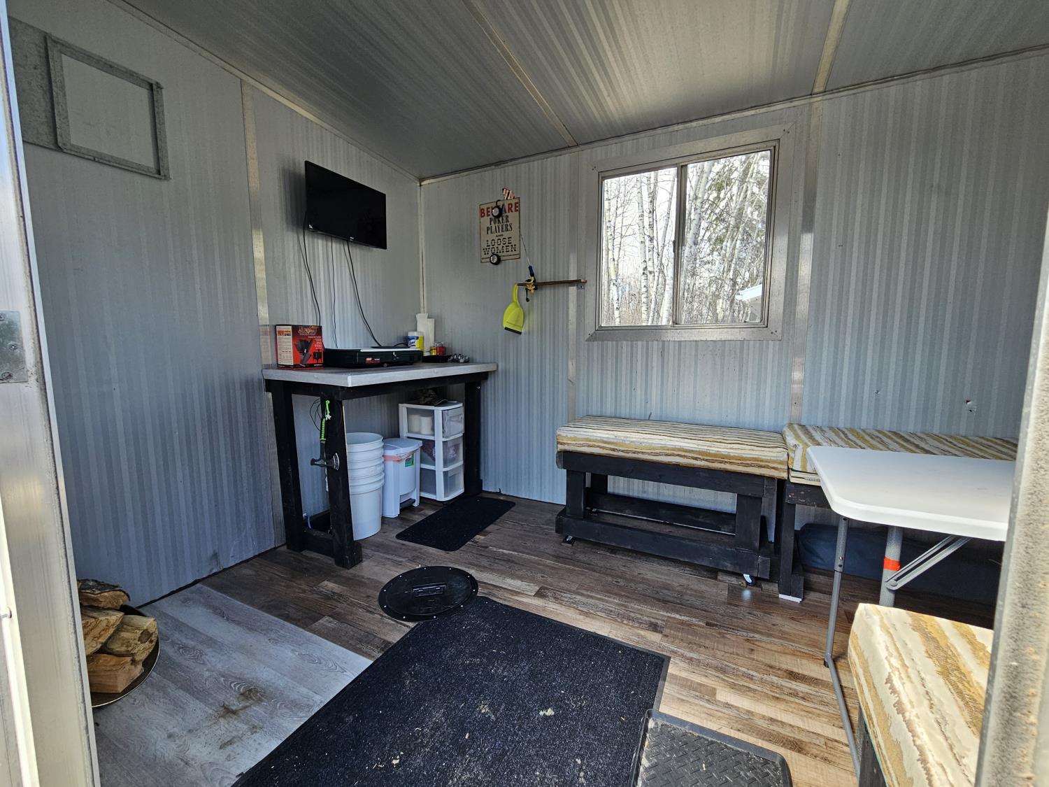TV, hot plate, 3 holes with covers, rigged up for generator and wood stove.