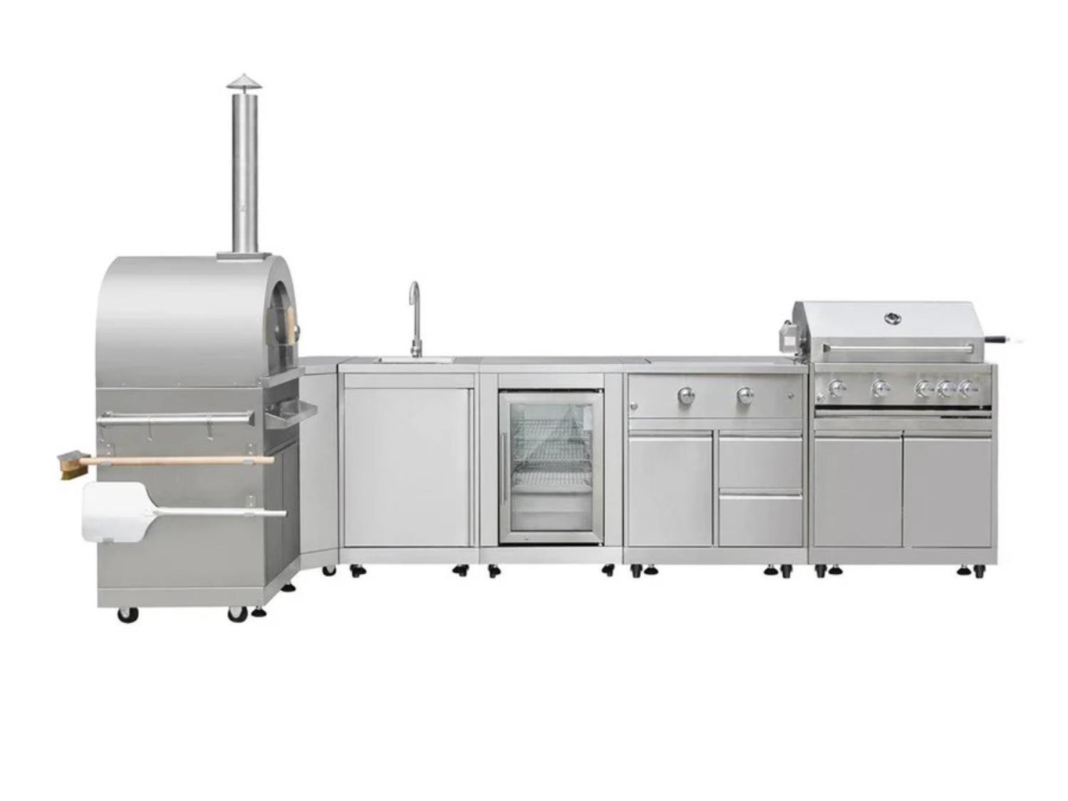 35 inch refrigerator cabinet, 32 inch BBQ, 4-burner gas grill, sink, side burner, corner cabinet, pizza oven