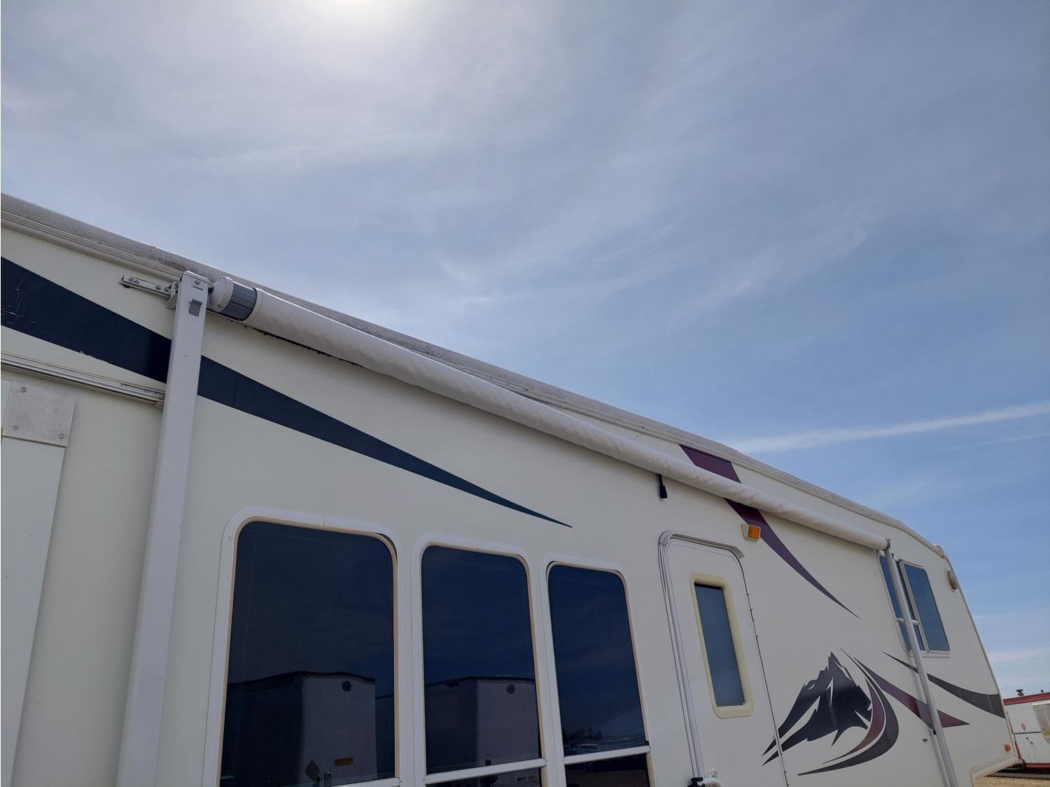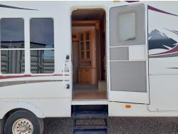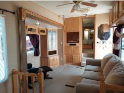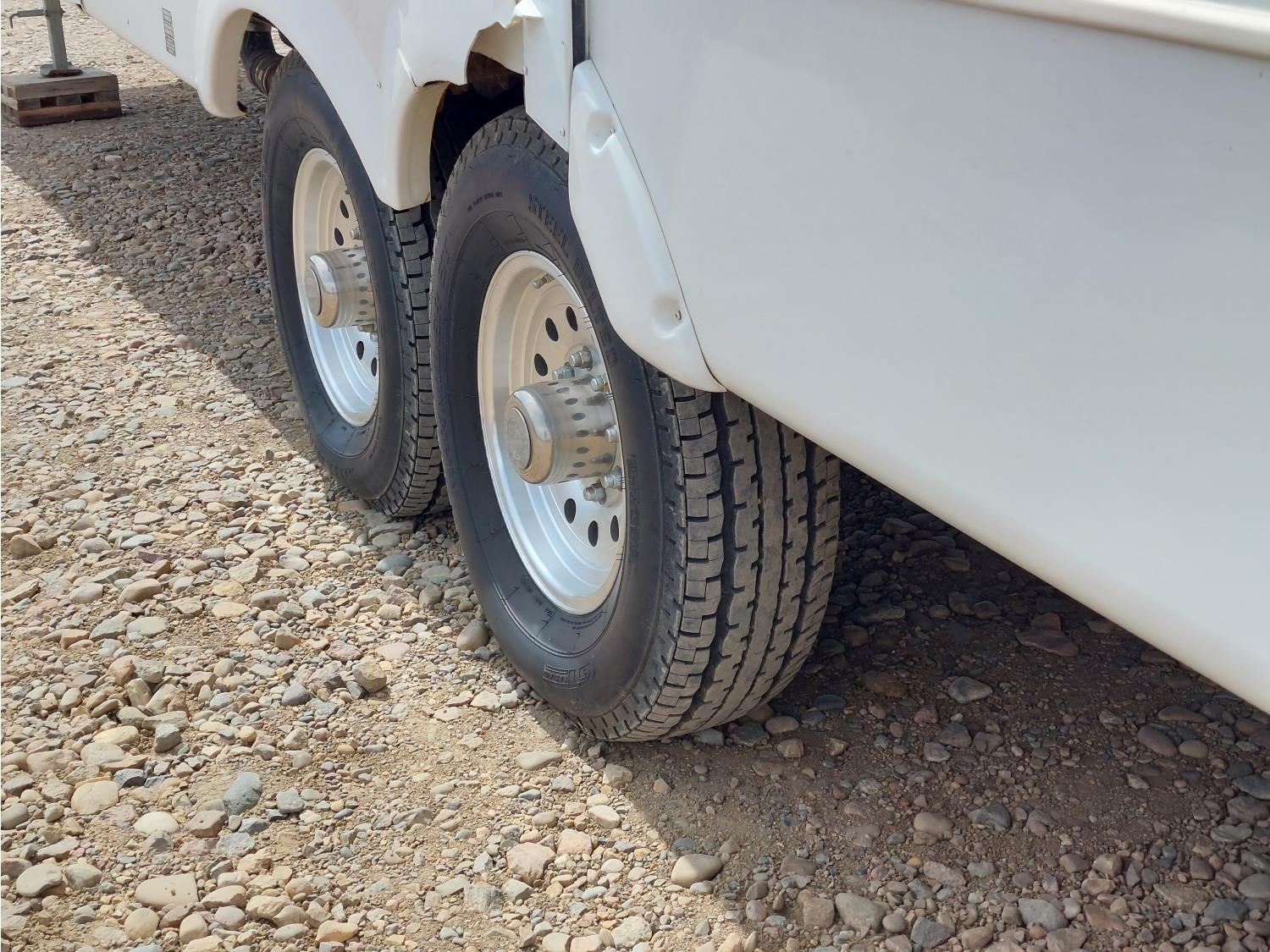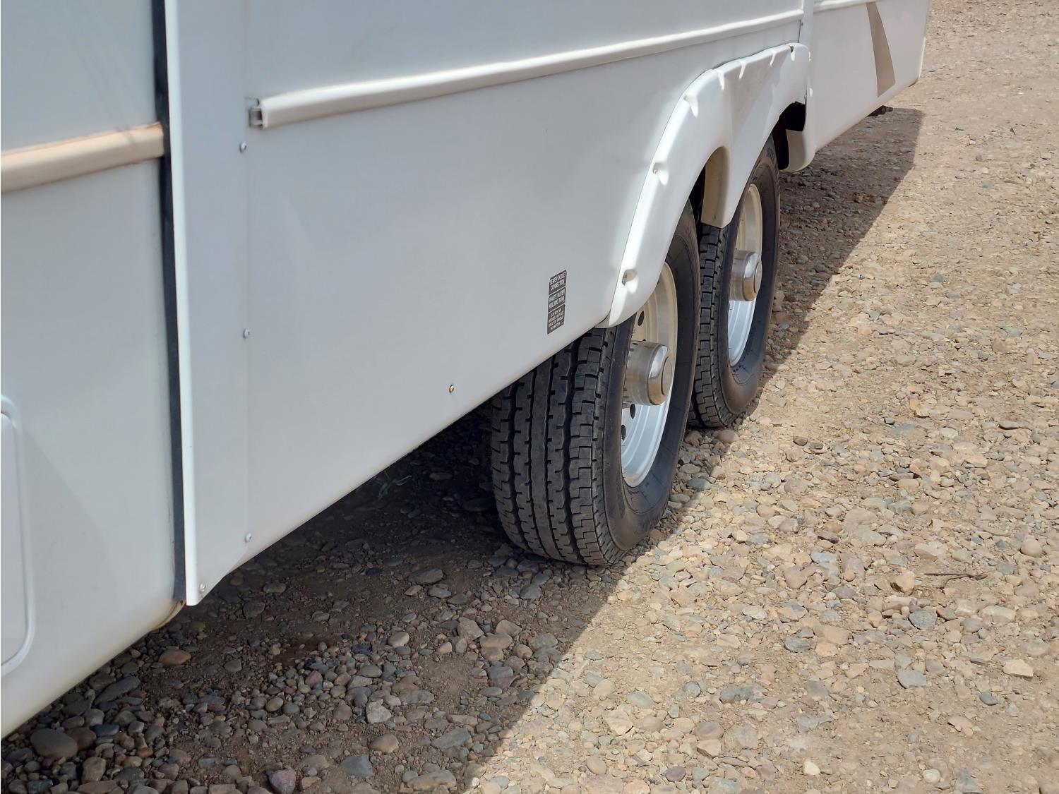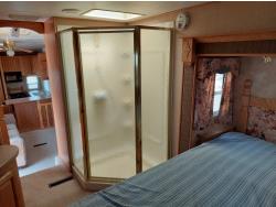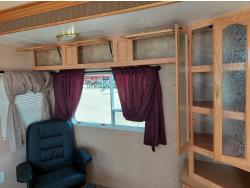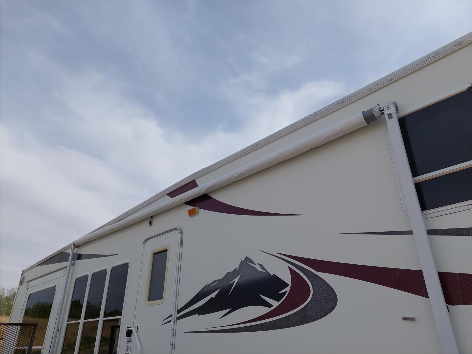 Sleeps 4, stove, fridge, microwave, master bedroom, A/C, outdoor shower, 3 slides, manual awning, power levelling jacks, spring suspension, electric brakes, 235/80R18 tires