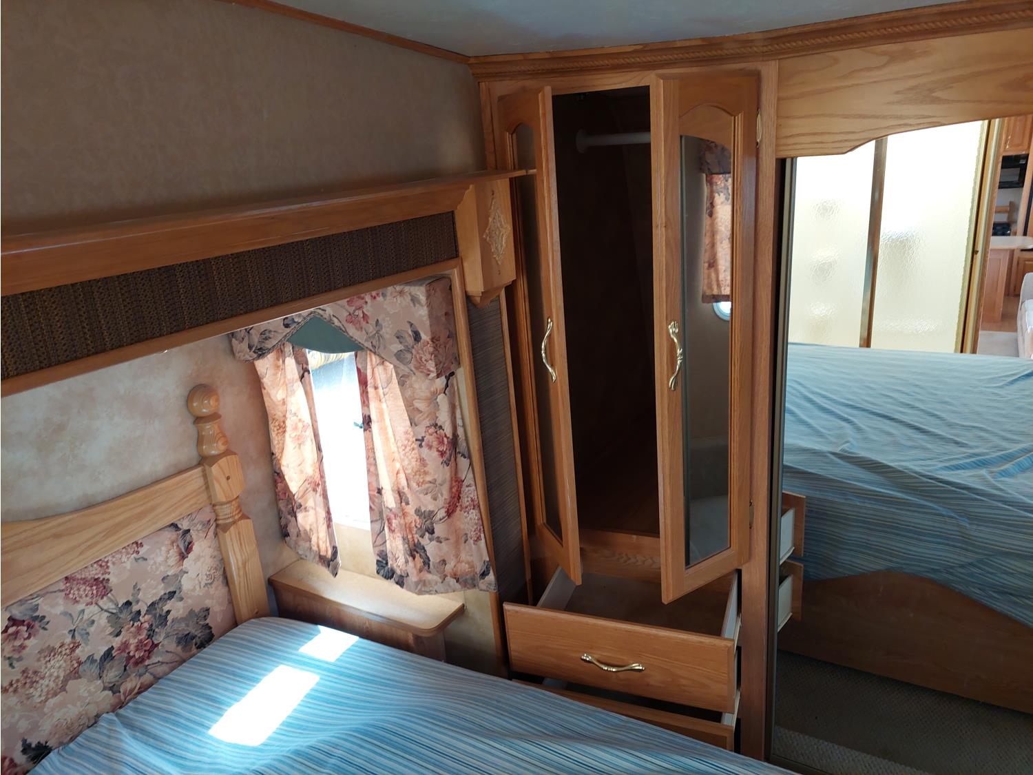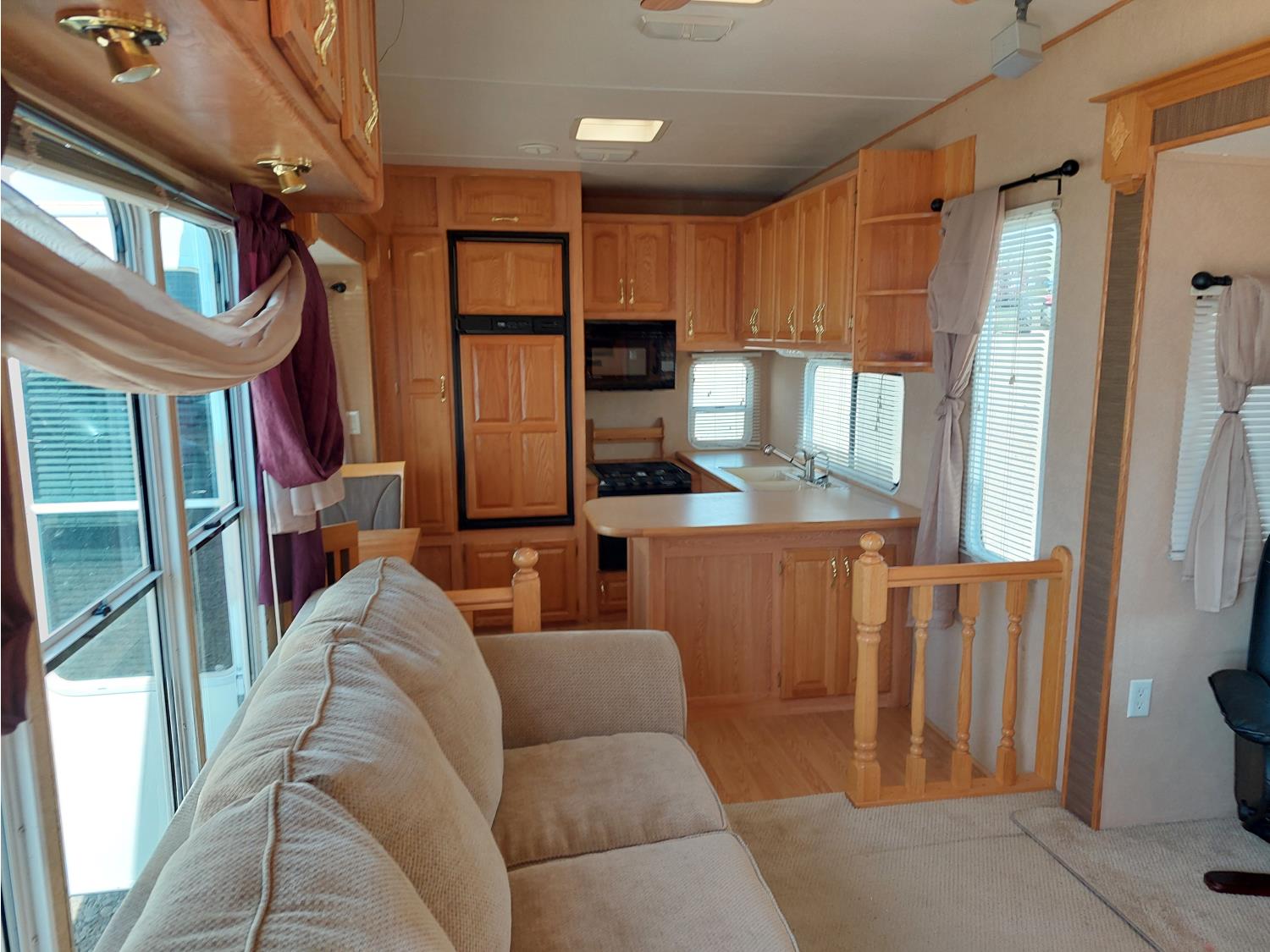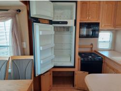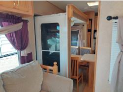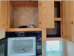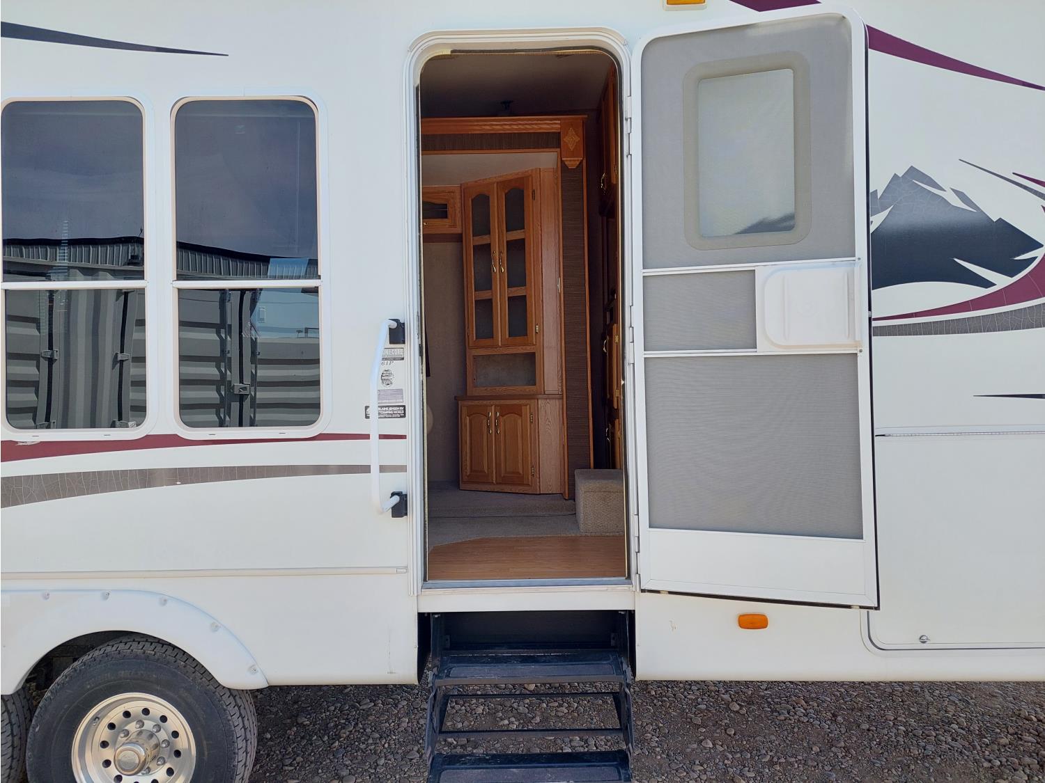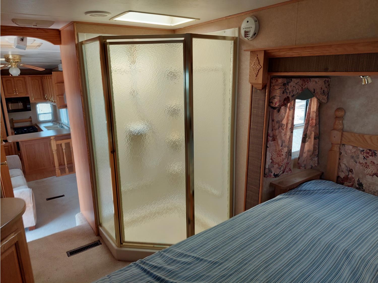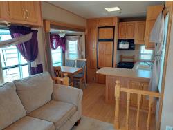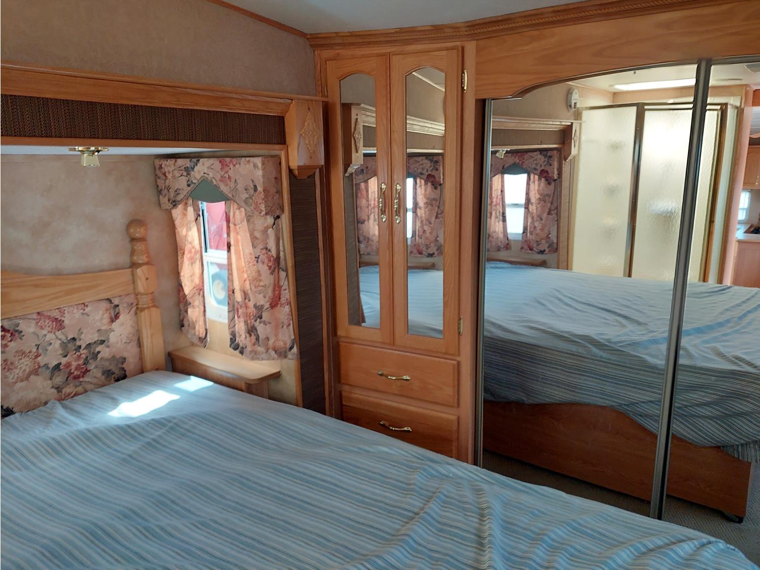 Sleeps 4, stove, fridge, microwave, master bedroom, A/C, outdoor shower, 3 slides, manual awning, power levelling jacks, spring suspension, electric brakes, 235/80R18 tires