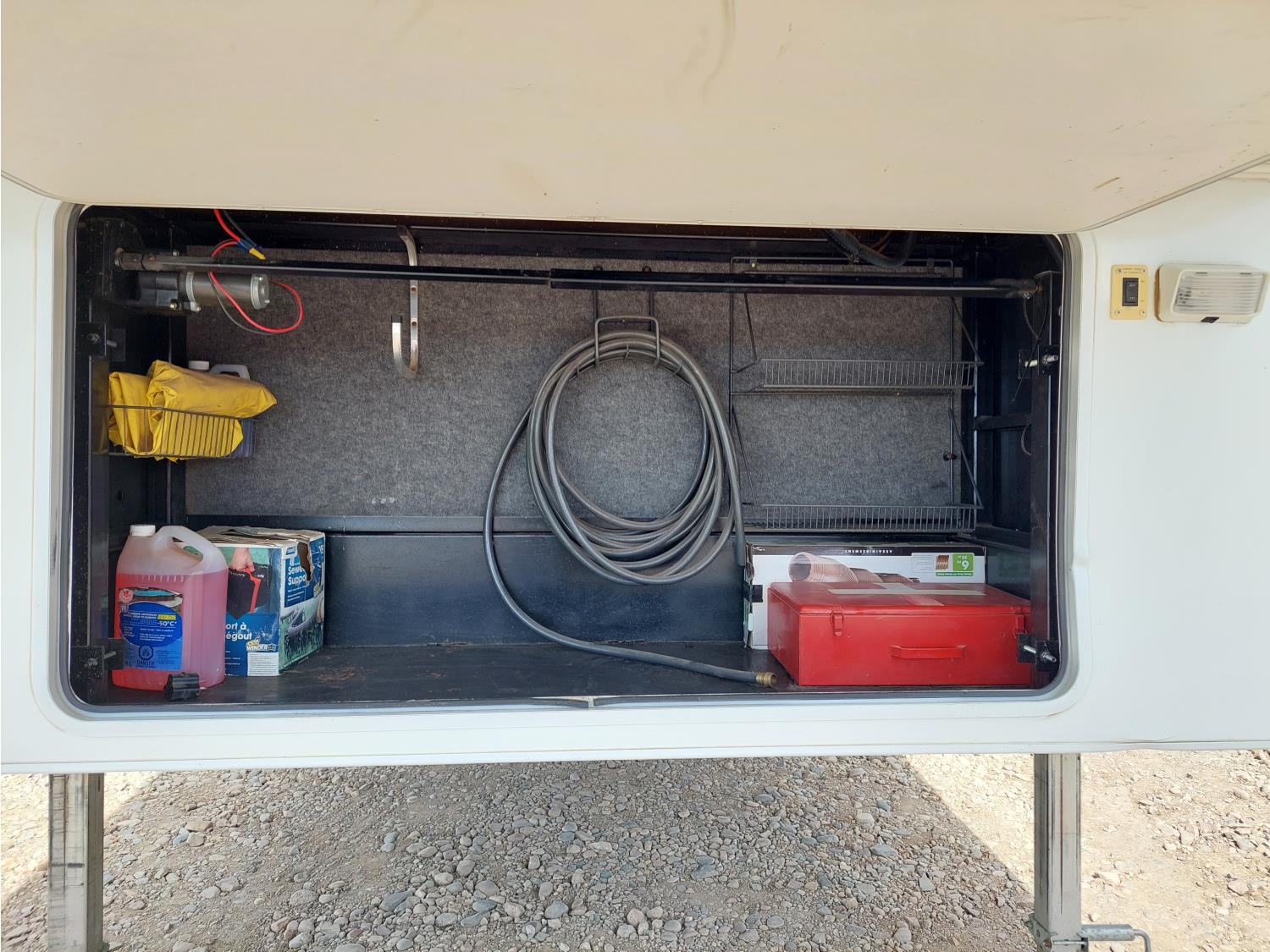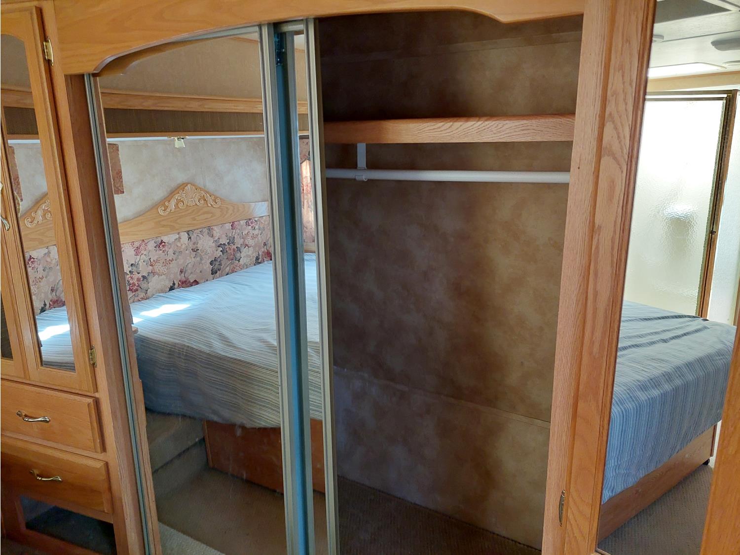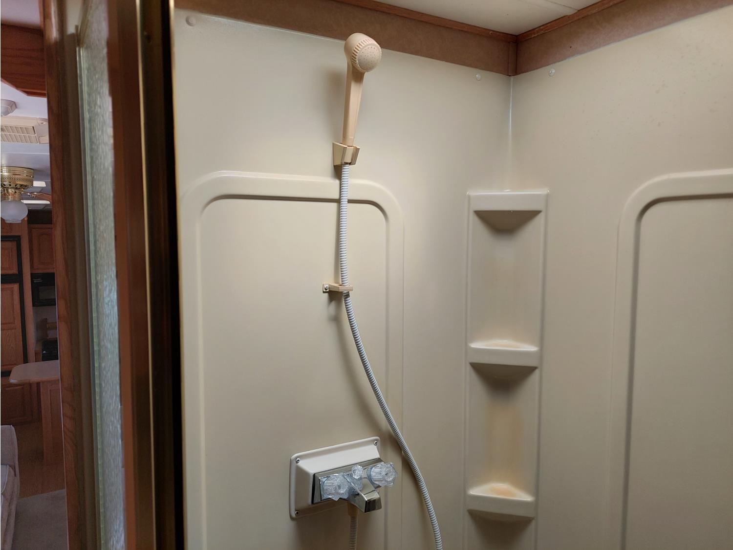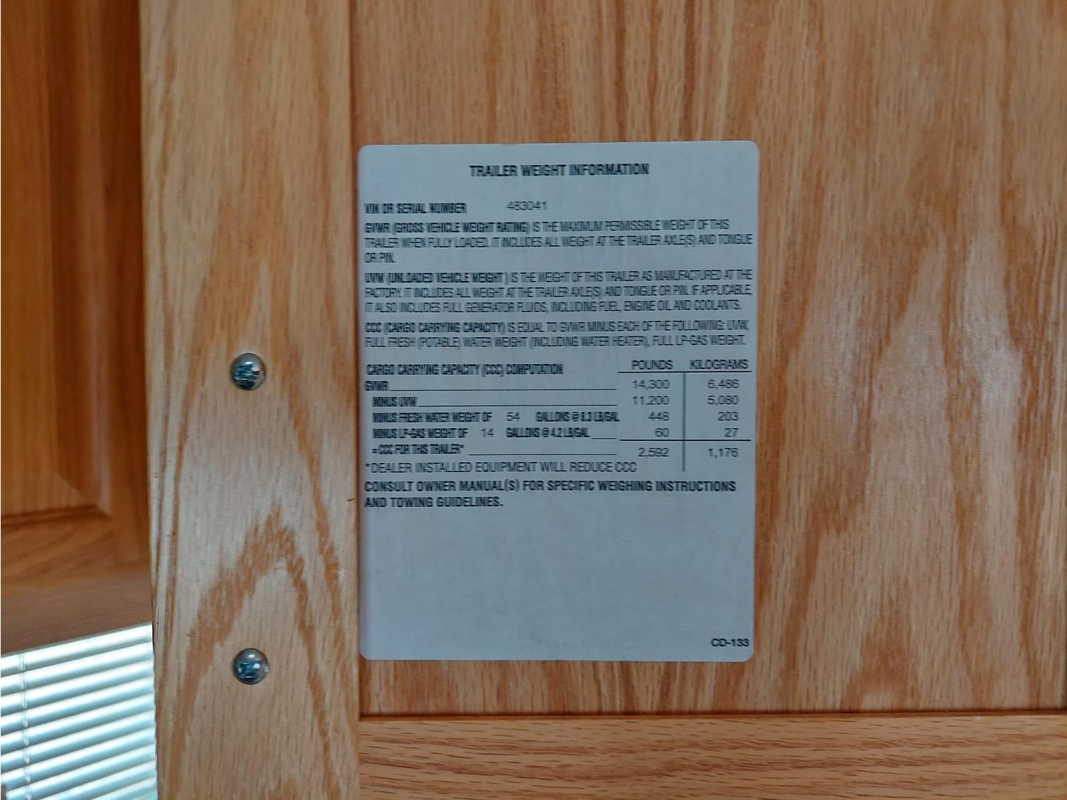 Sleeps 4, stove, fridge, microwave, master bedroom, A/C, outdoor shower, 3 slides, manual awning, power levelling jacks, spring suspension, electric brakes, 235/80R18 tires