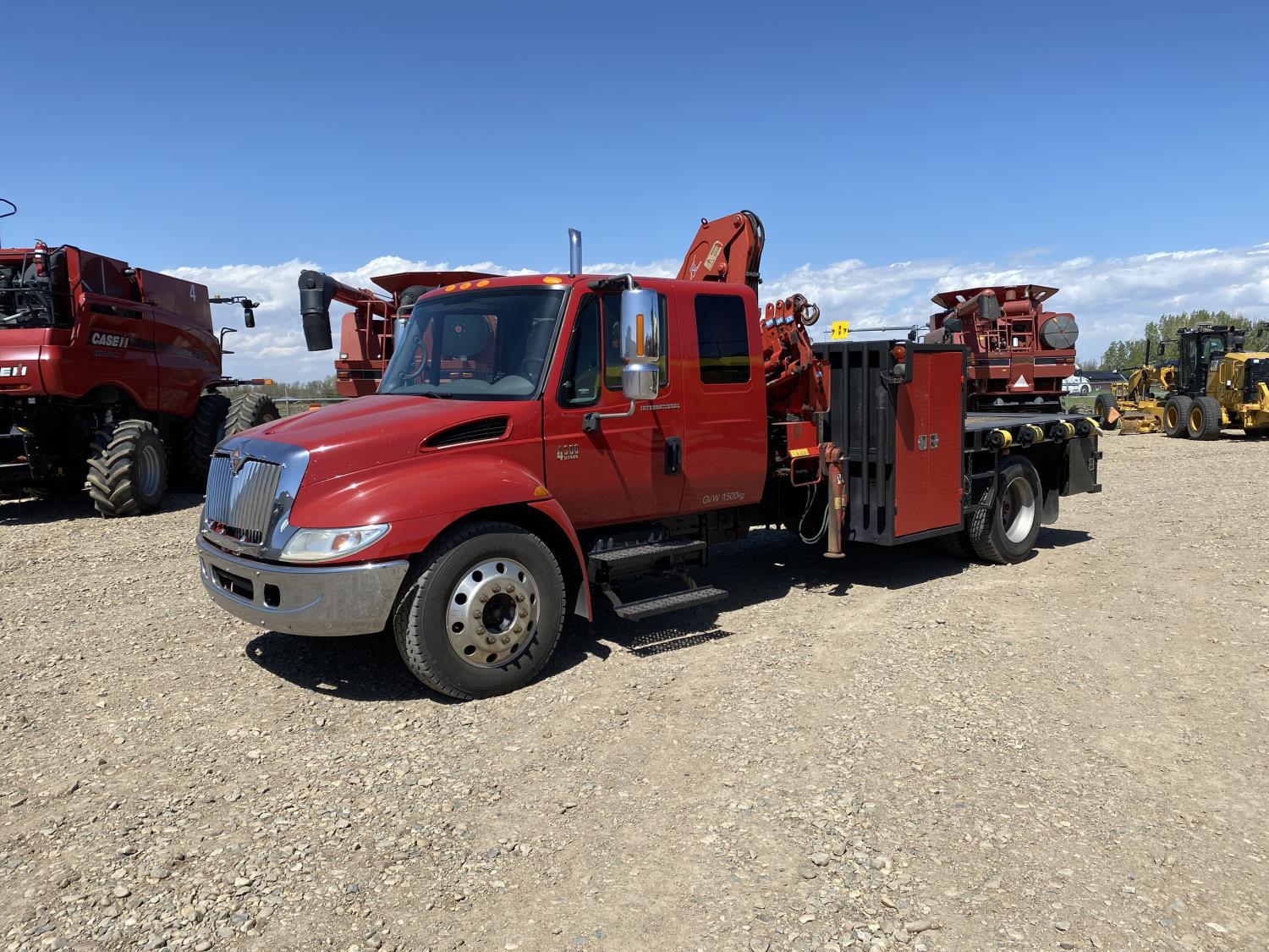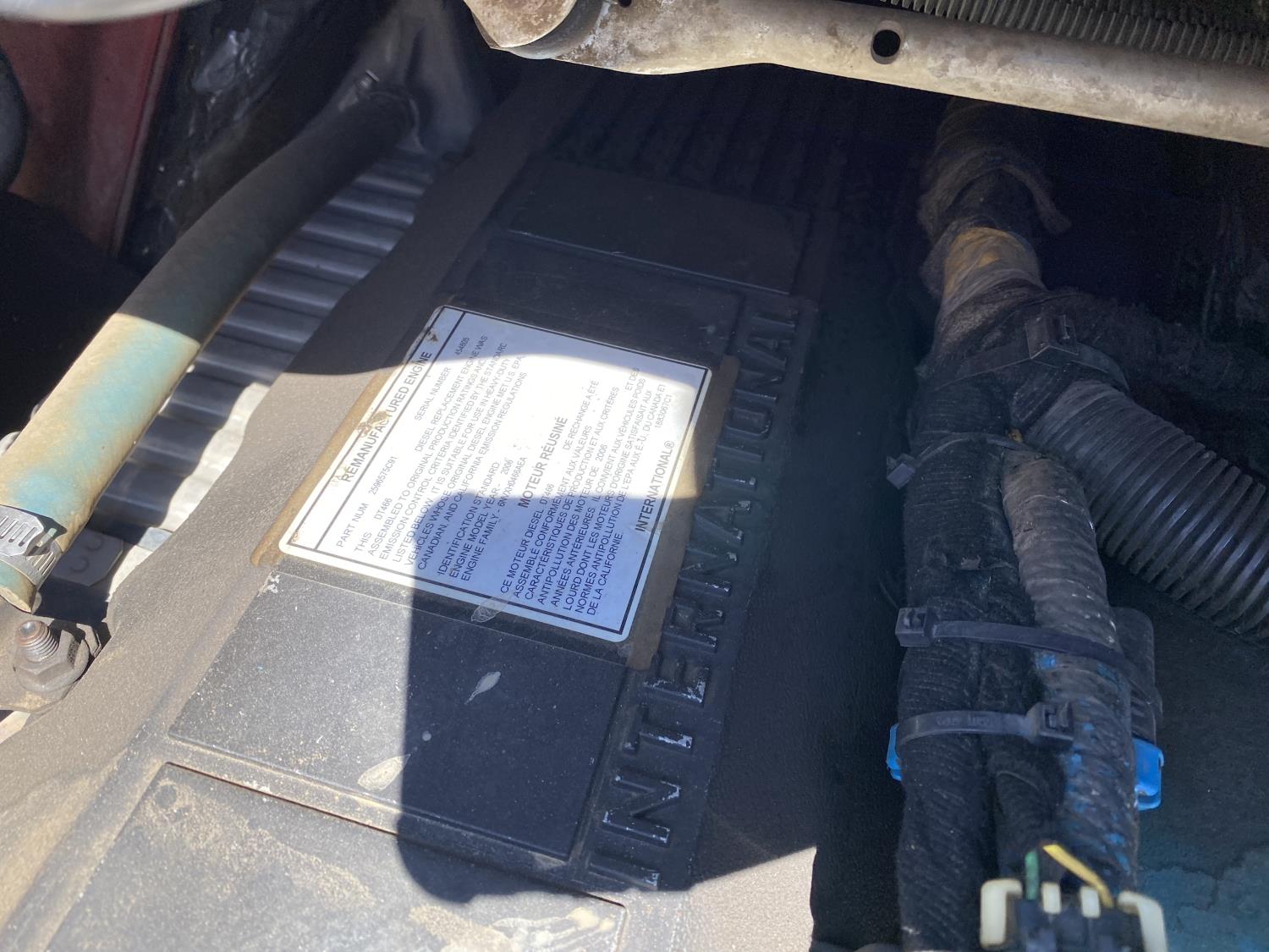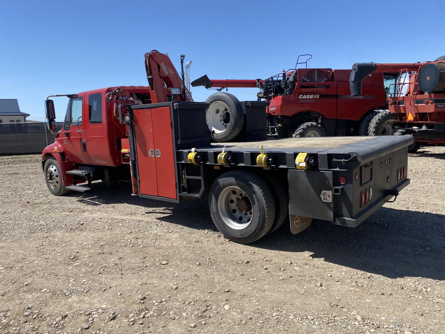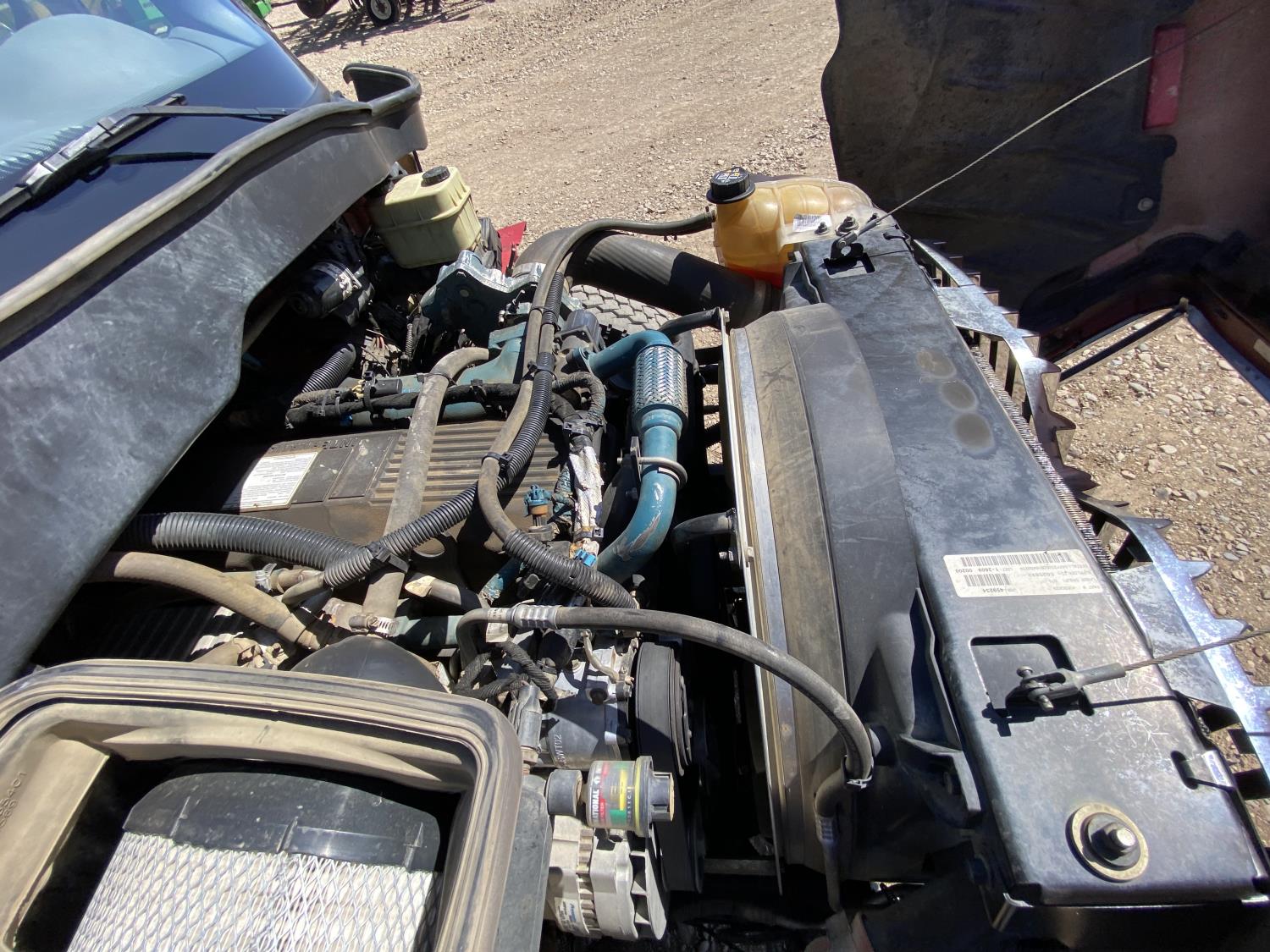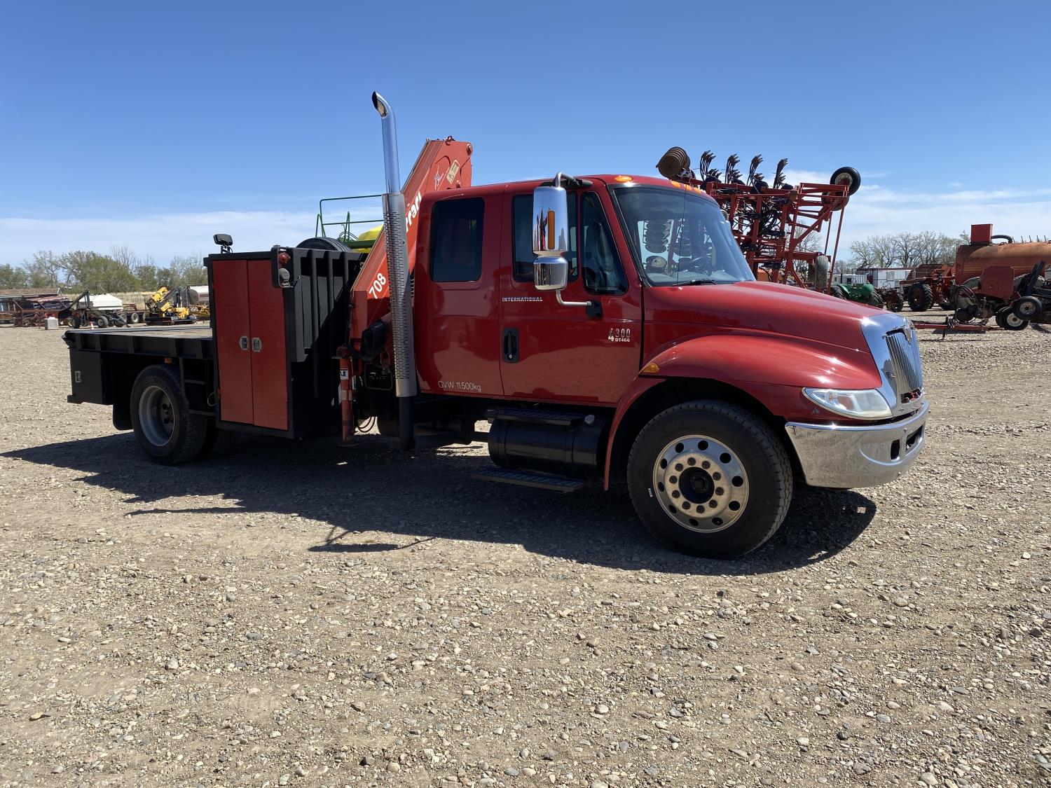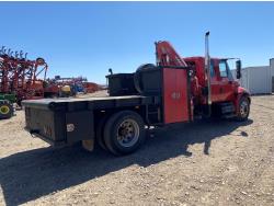 International DT466 7.6 L 6 cylinder diesel engine, automatic transmission, A/C, P/W, P/L, leather interior, air ride seats, stereo, 60 inch T x 40 inch W x 26 inch D steel tool boxes, 8 ft 4 inch x 12 ft deck, chain holders, PTO pump, Ferrari 708 3 section 24 ft knuckle crane, outriggers, air ride suspension, 14,000 lb rear axles, diff lock, 217 inch WB, all aluminum wheels, 275/70R22.5 front tires, 10R22.5 rear tires