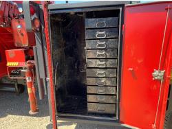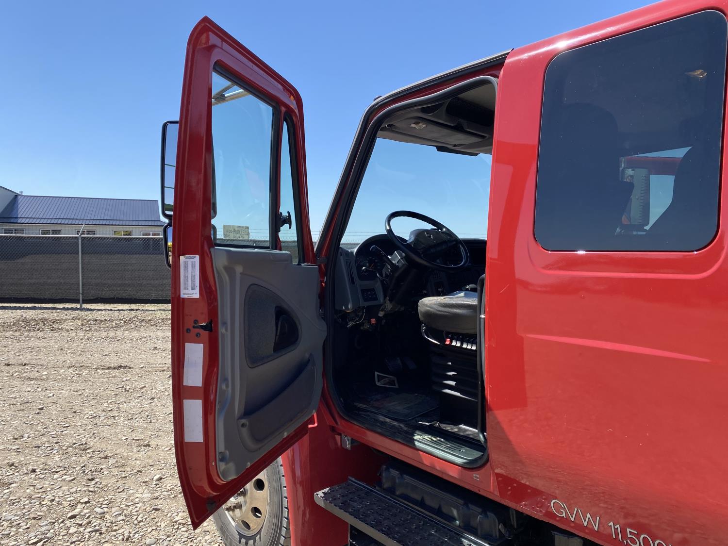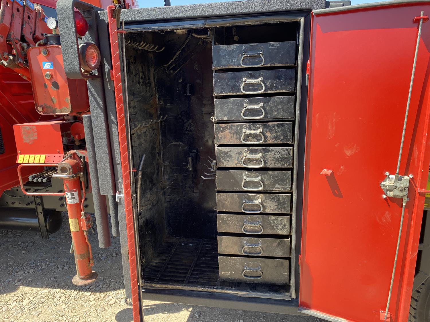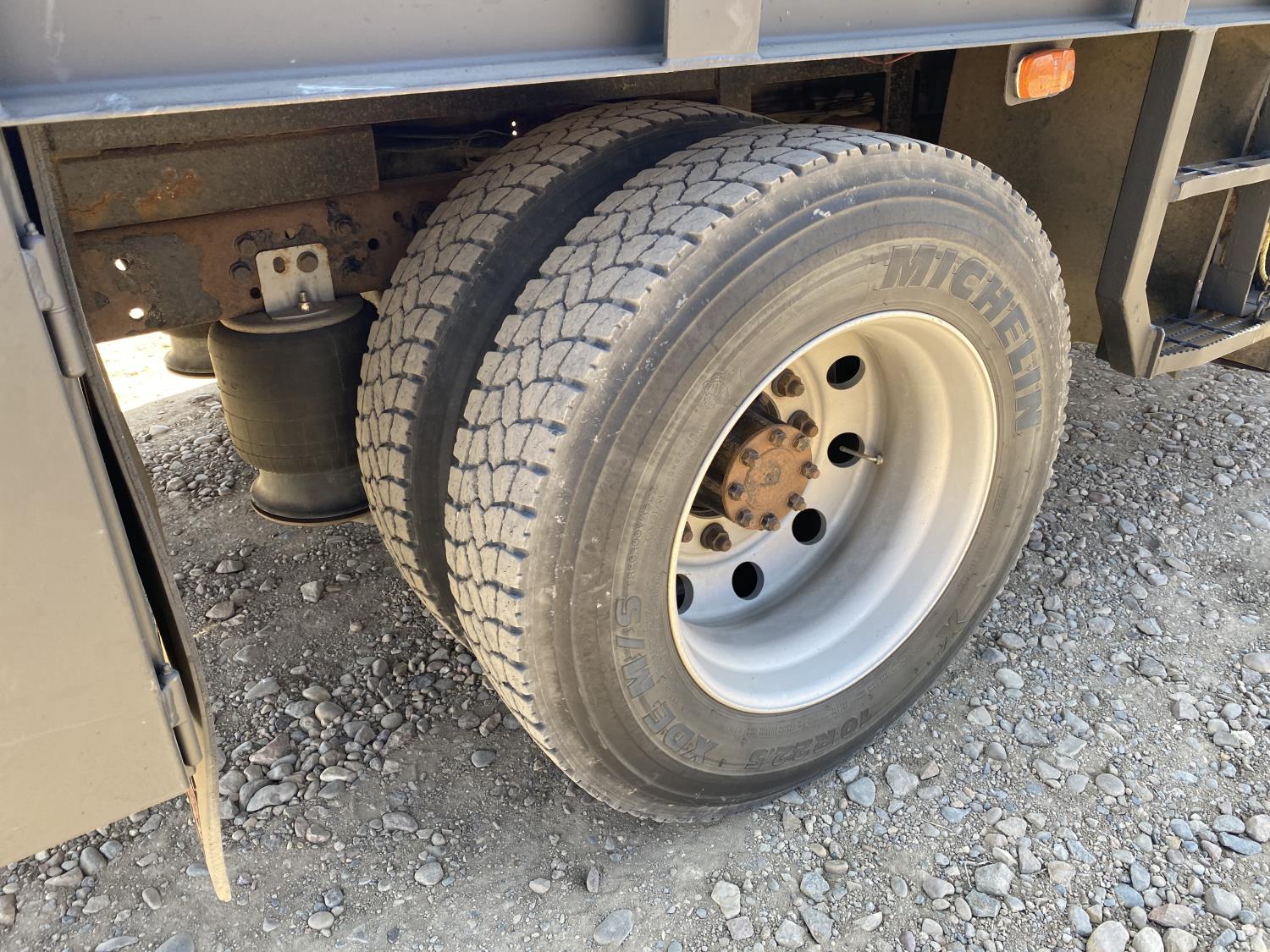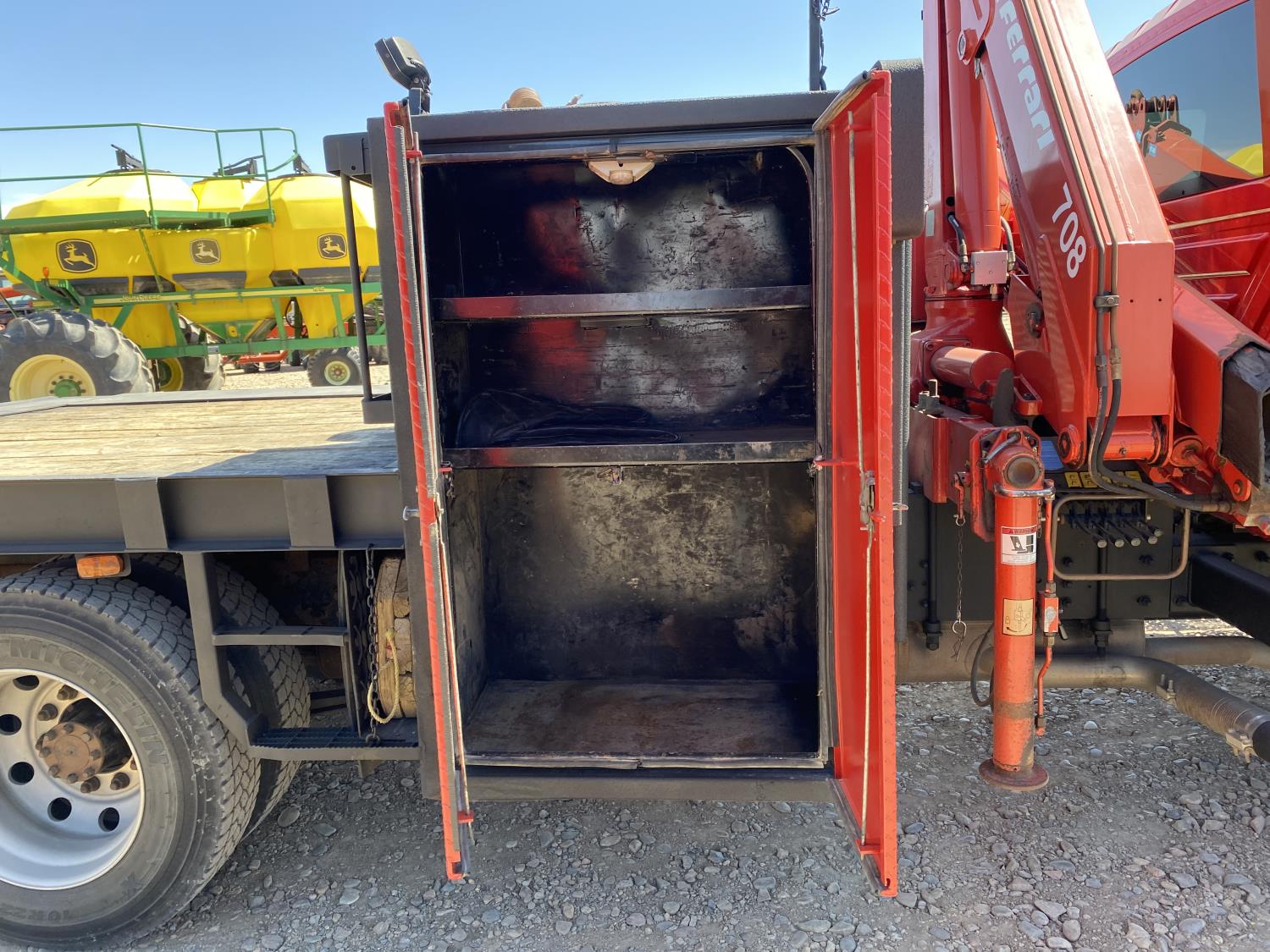 International DT466 7.6 L 6 cylinder diesel engine, automatic transmission, A/C, P/W, P/L, leather interior, air ride seats, stereo, 60 inch T x 40 inch W x 26 inch D steel tool boxes, 8 ft 4 inch x 12 ft deck, chain holders, PTO pump, Ferrari 708 3 section 24 ft knuckle crane, outriggers, air ride suspension, 14,000 lb rear axles, diff lock, 217 inch WB, all aluminum wheels, 275/70R22.5 front tires, 10R22.5 rear tires