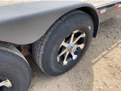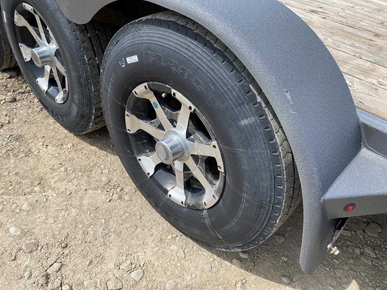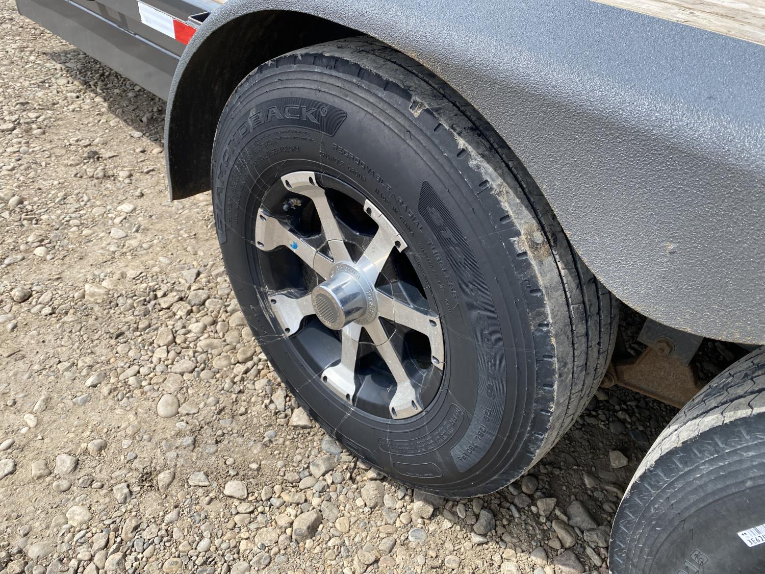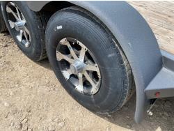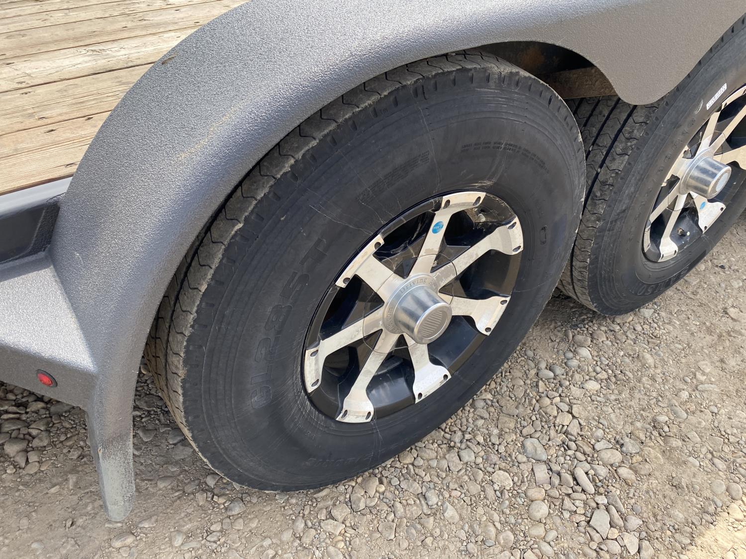 81 inch wide deck, 36 inch beaver tails, wood deck, flip over ramps, electric brakes, spring suspension, ball hitch, tool / storage box, rub rails, 7000 lb axles, 235/80R16 tires