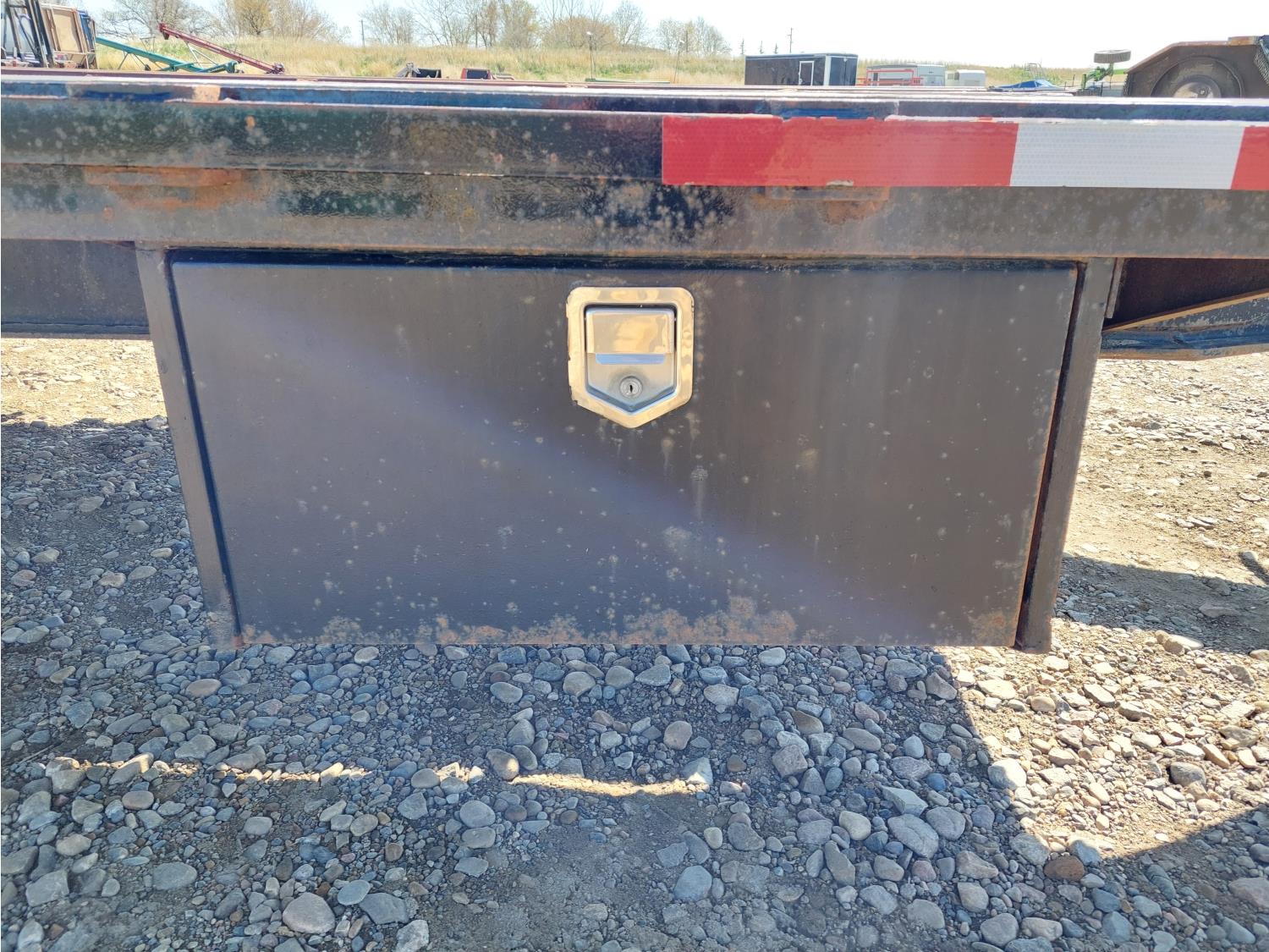 101 inch wide deck, 72 inch beaver tails, wood deck, flip over ramps, electric brakes, spring suspension, rub rails, stake pockets, steel tool box, pintle hitch, 10000 lb axles, 235/85R16 tires