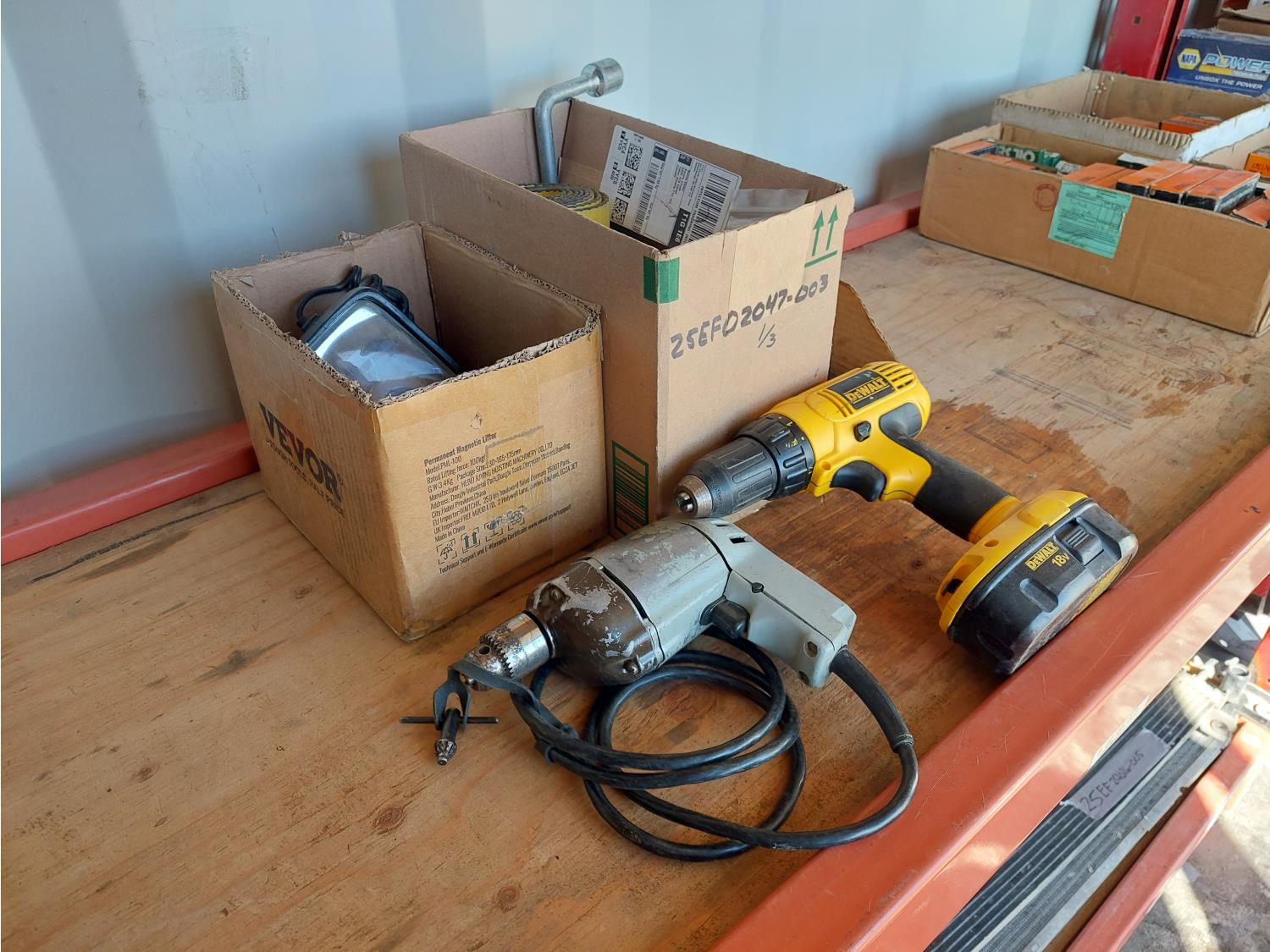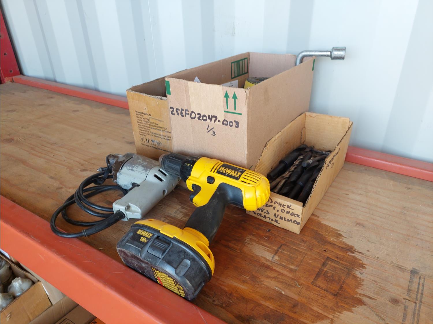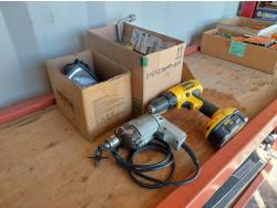 includes 120v drill, 12V spot light, 2 inch straps, and miscellaneous drill bits