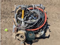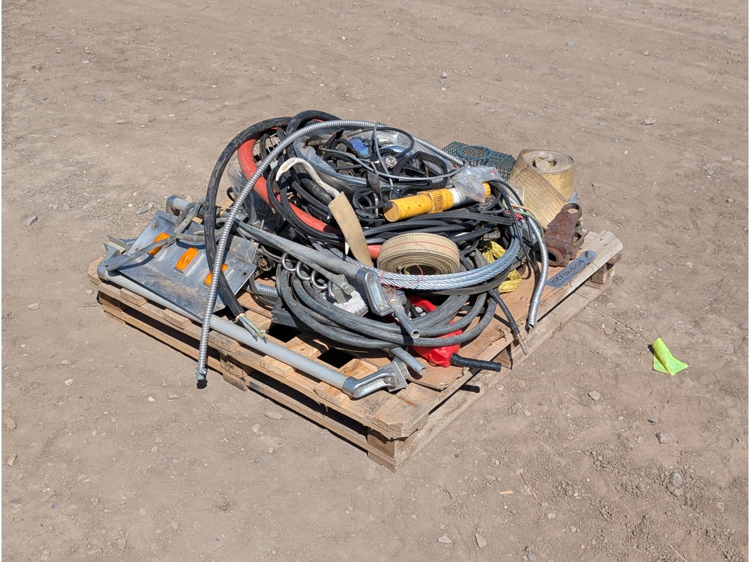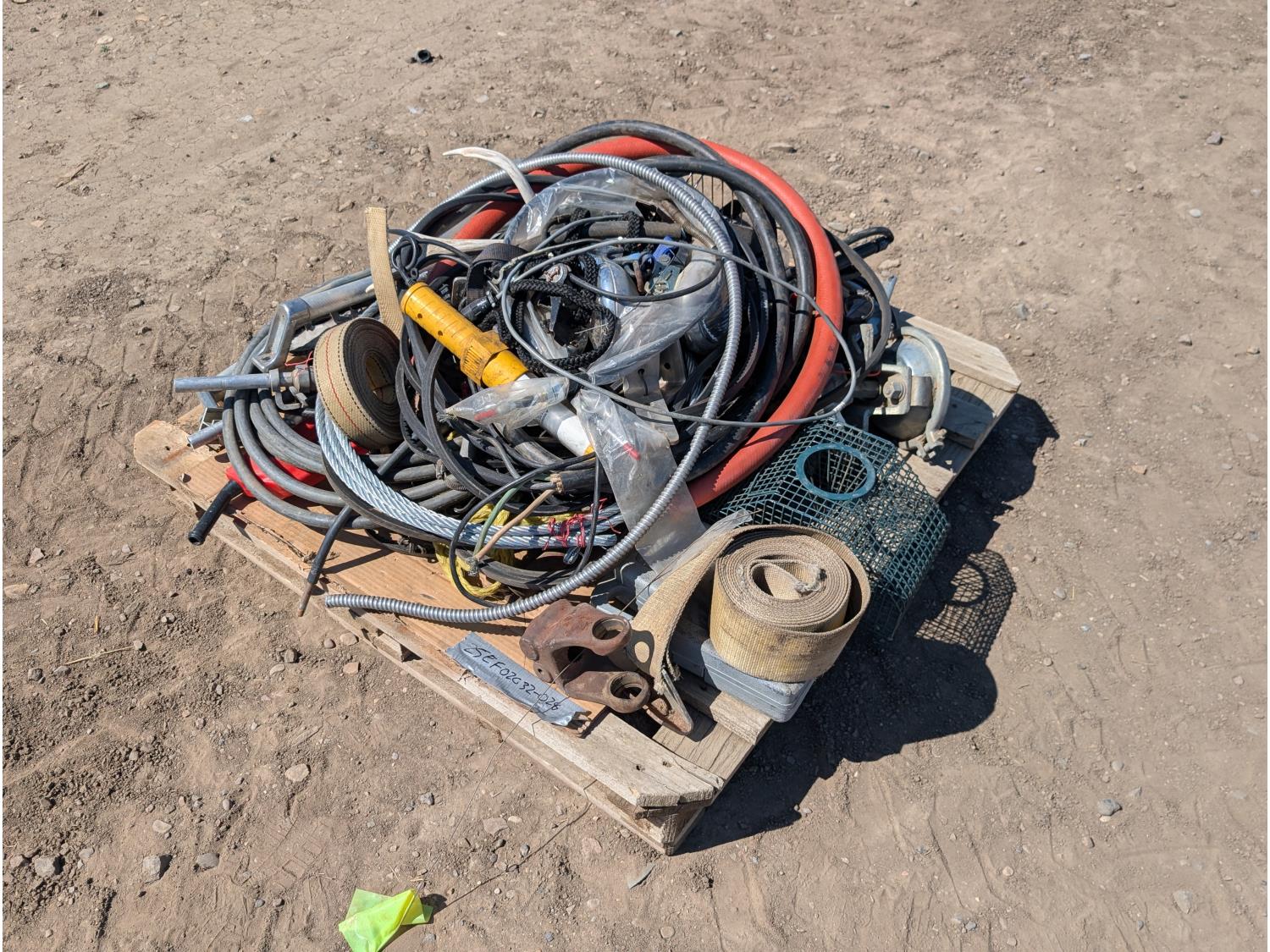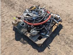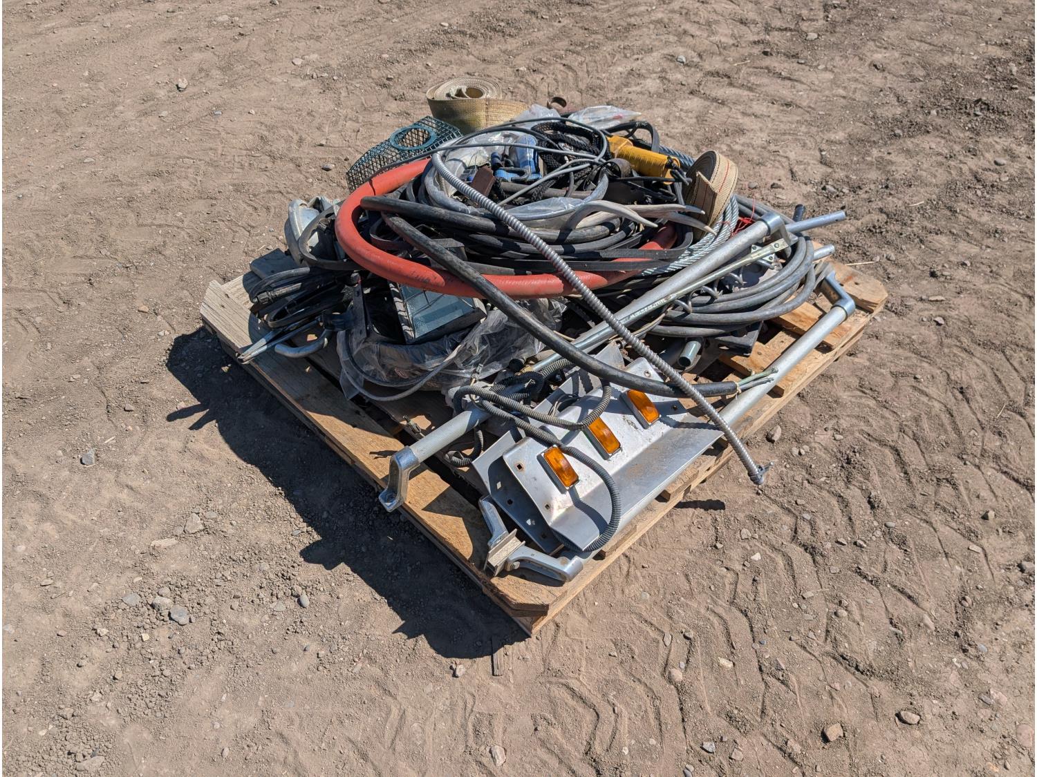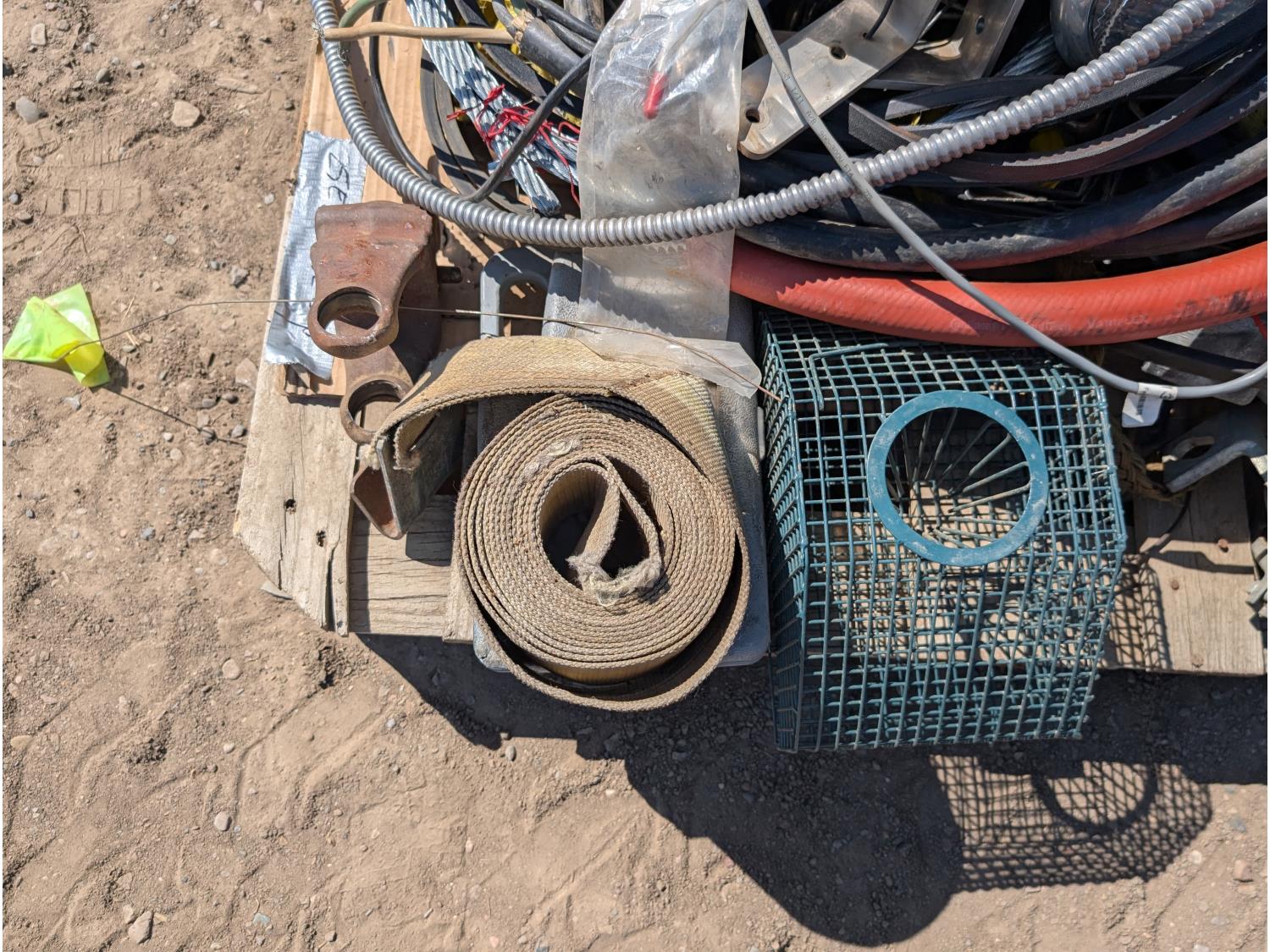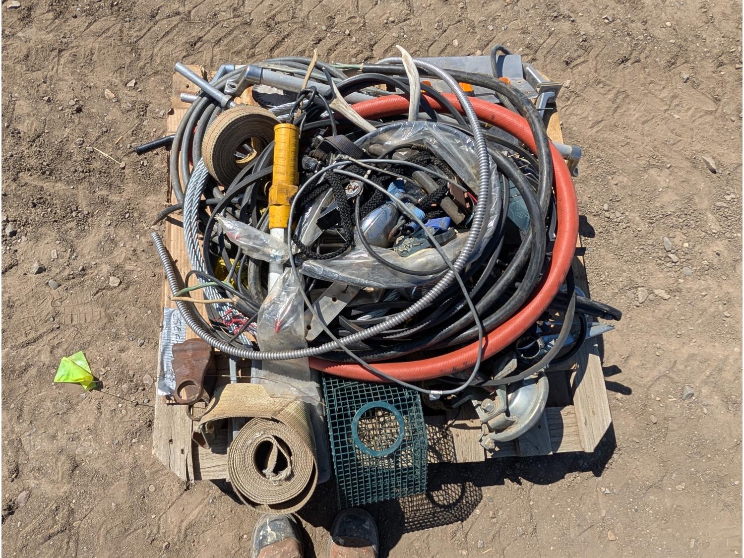 (2) trailer straps, (2) marker light panels, steel braided cable, fuel transfer nozzle, Qty of miscellaneous belts, wire and hose.