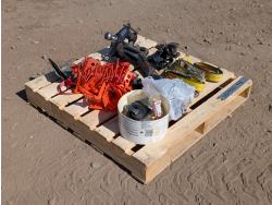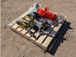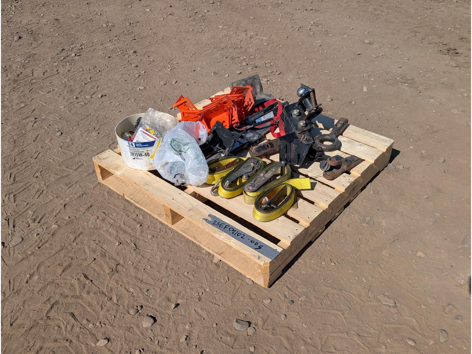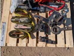 Qty of (4) rachet straps, Qty of (1) hitch assembly w/ ball, pintle, and pin attachments. Qty of edge protectors, Qty of miscellaneous headlights
