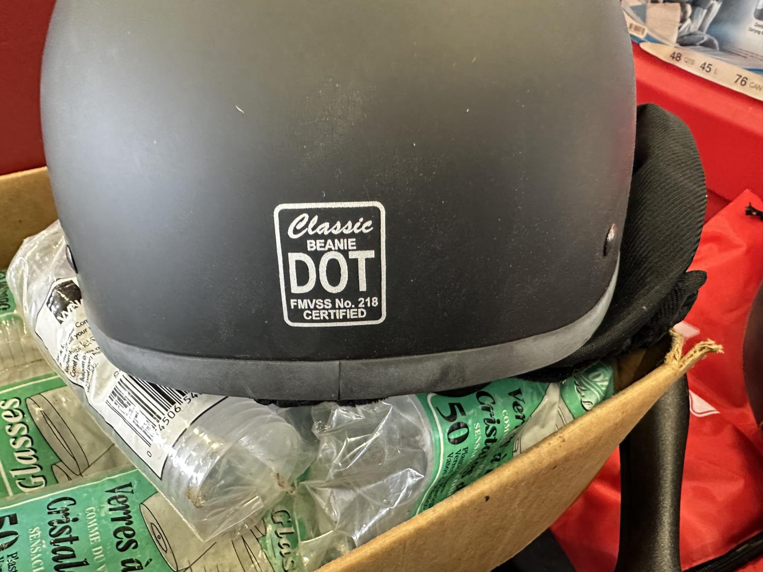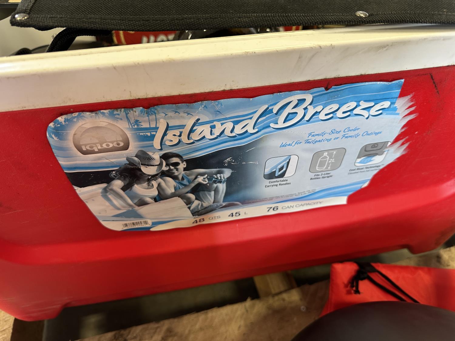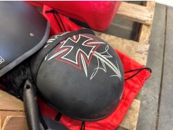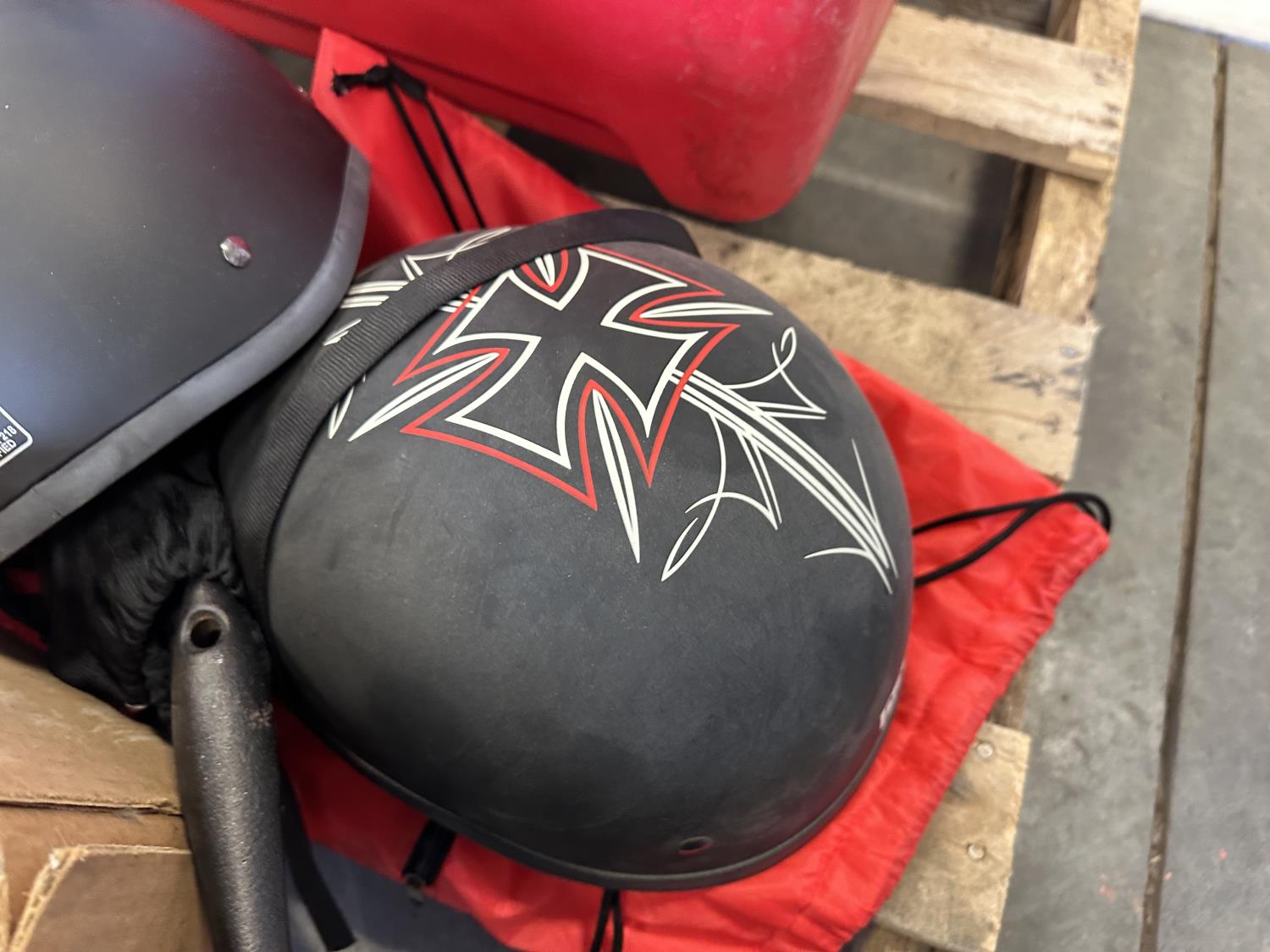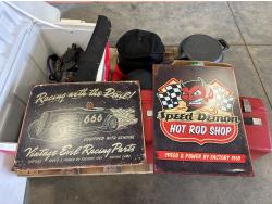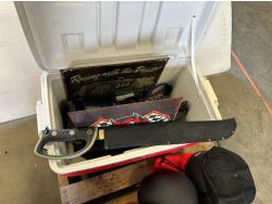Cooler, cast iron pan, sewing machine, (2) motorcycle helmets sizes large and XL