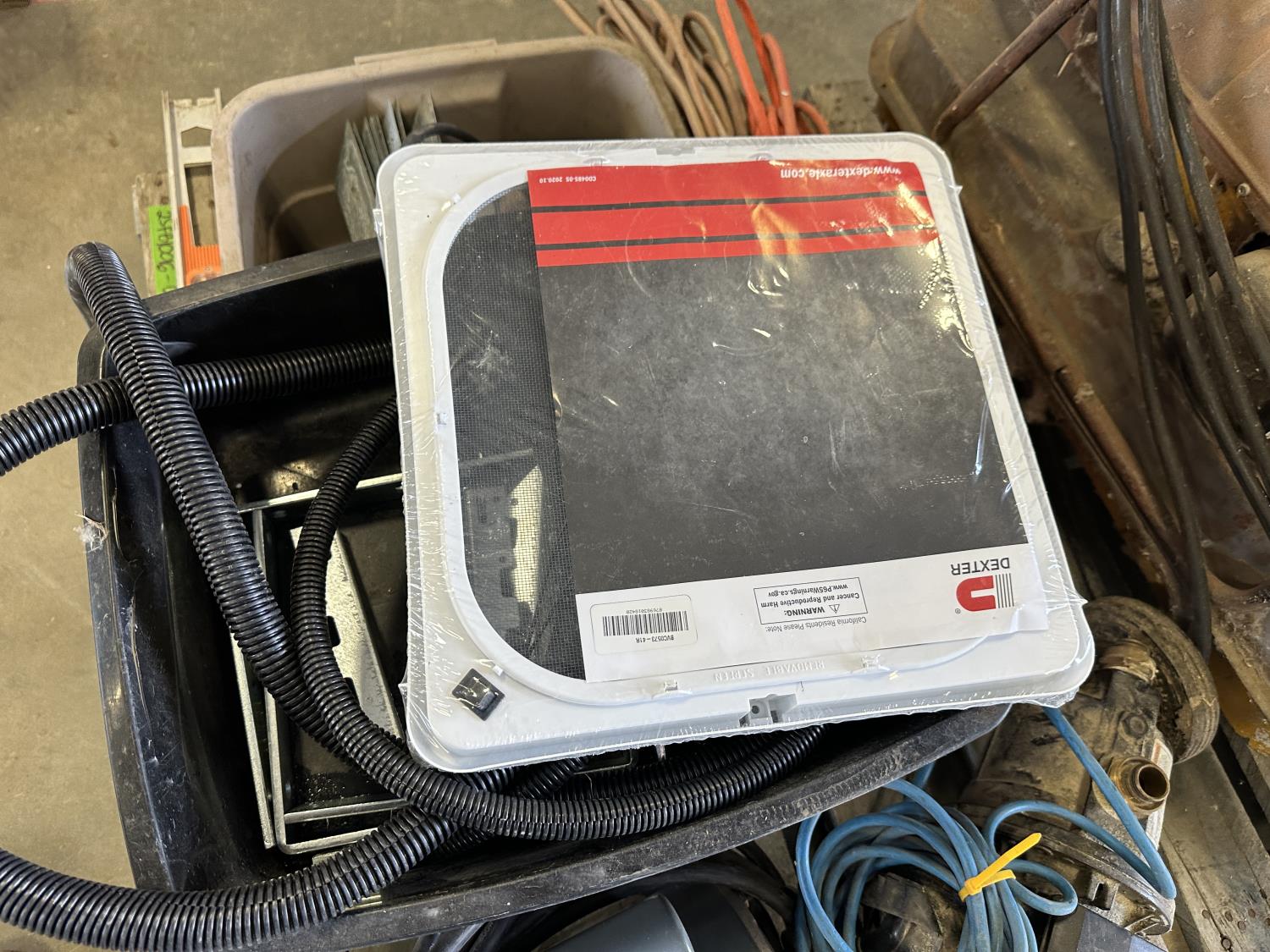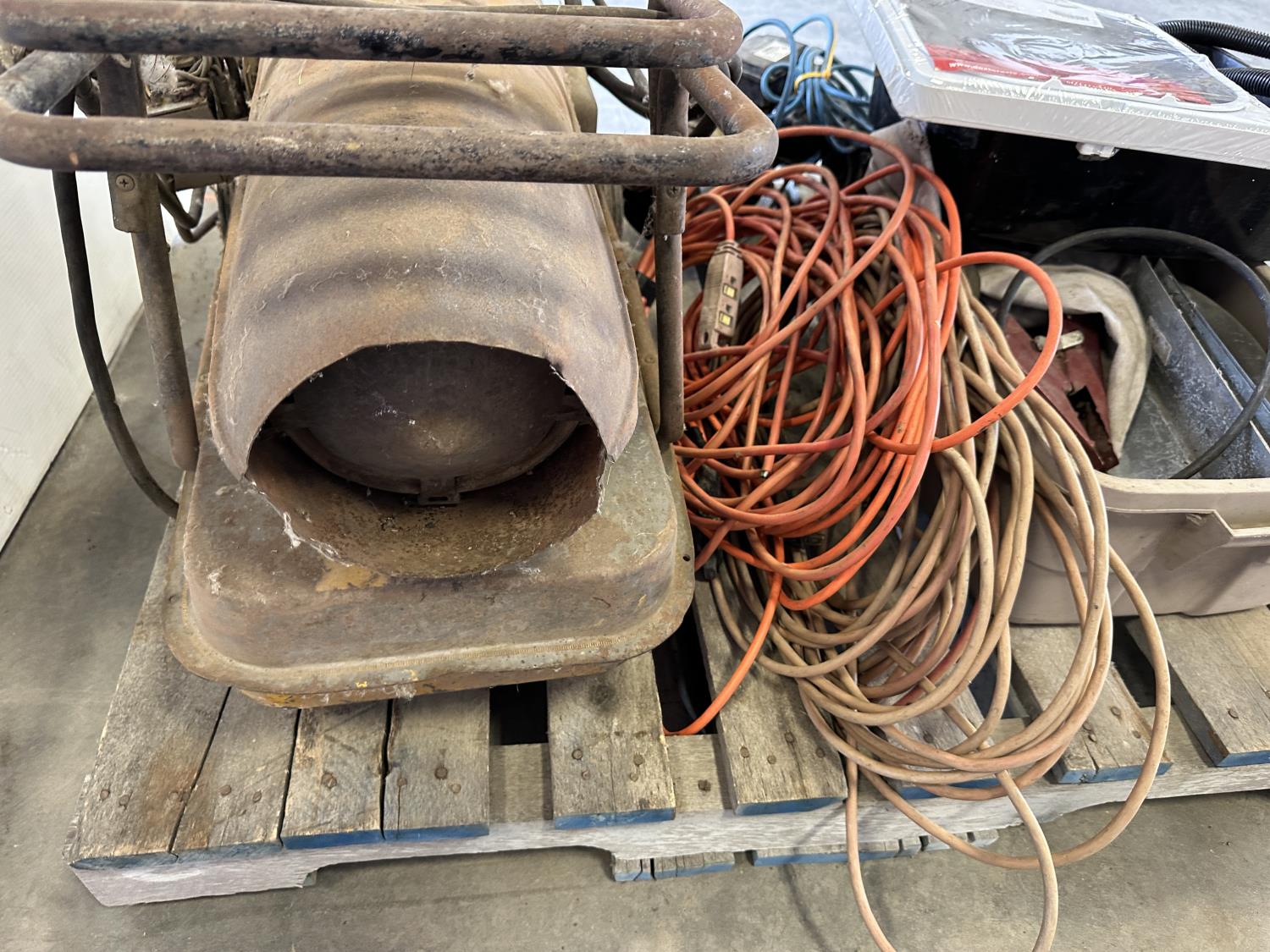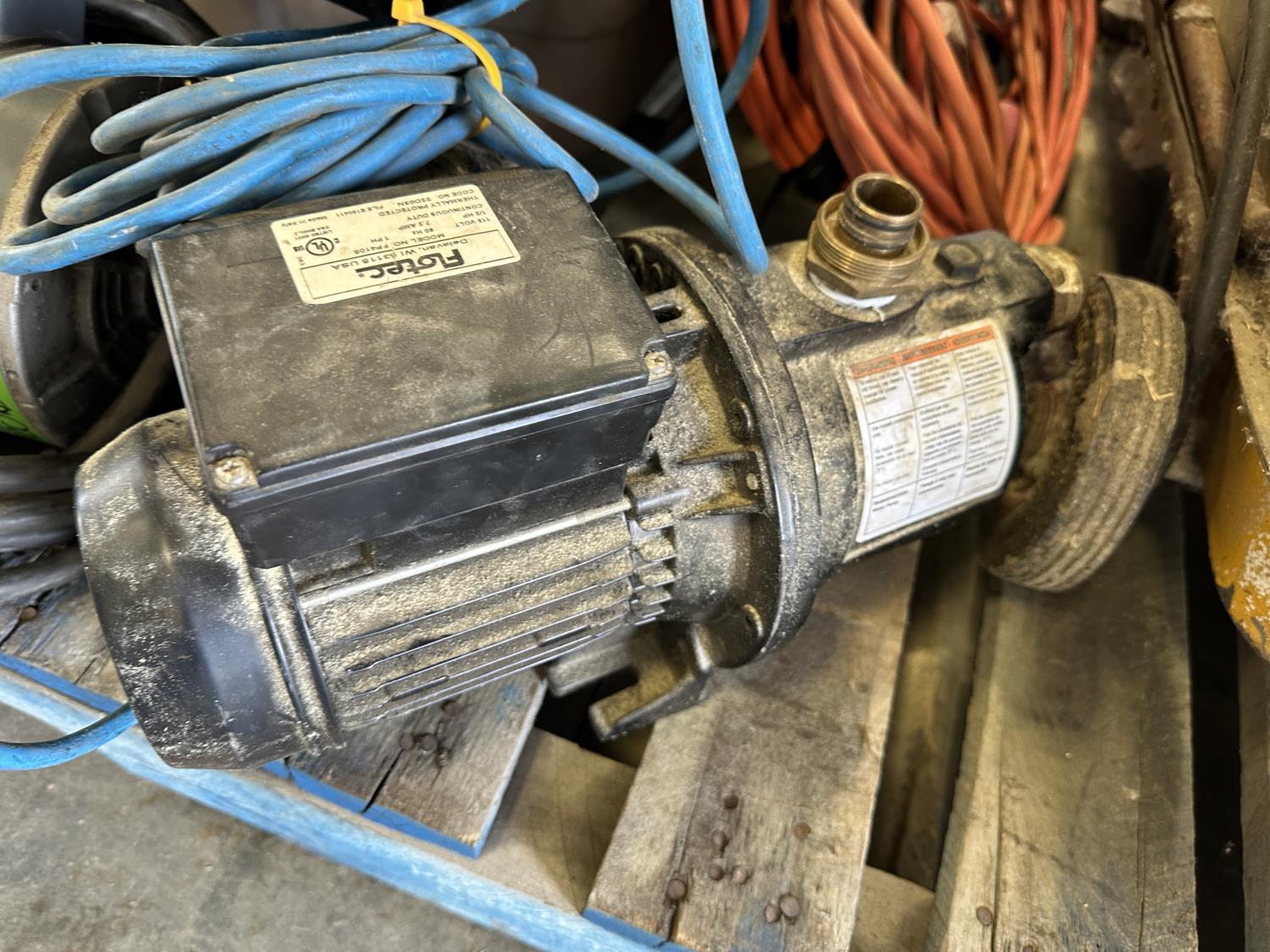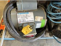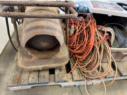Antique Master Heater 25,000 BTU heater (inoperable), Flotec 1 inch water pump, Marathon 3/4 HP 115V motor, extension cords, miscellaneous hardware