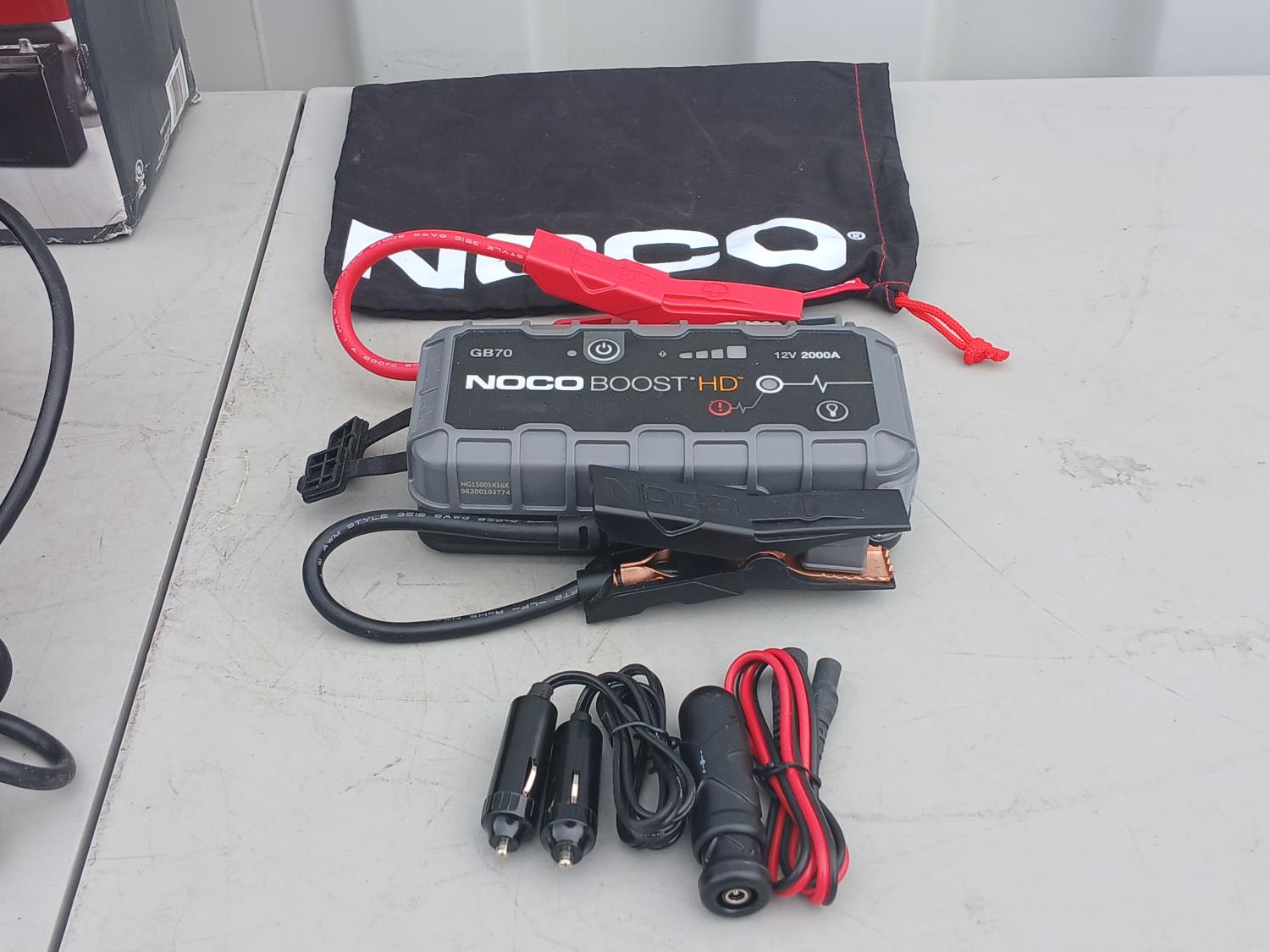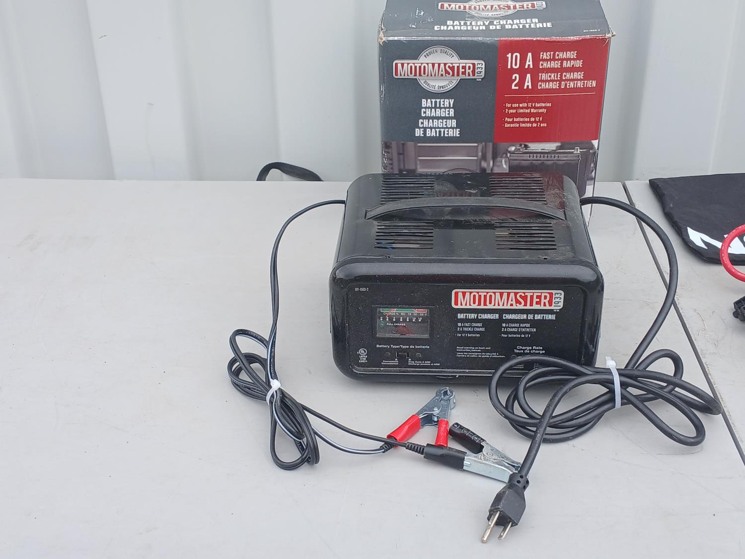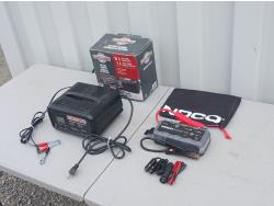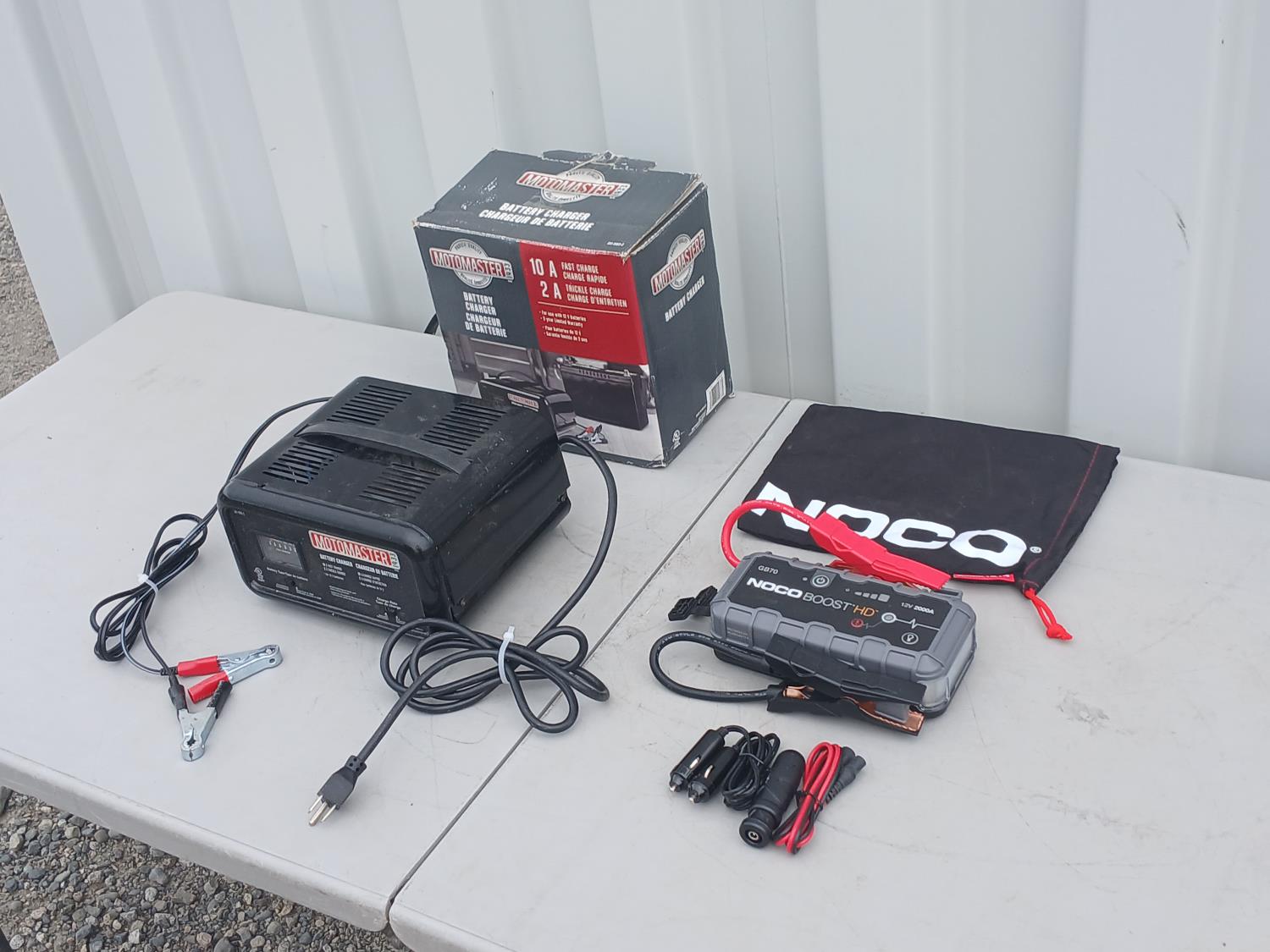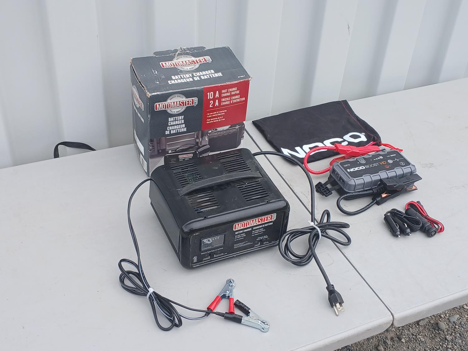 (1) Motomaster Battery charger, (1) Noco Boost HD 12 volt battery booster, model GB70.