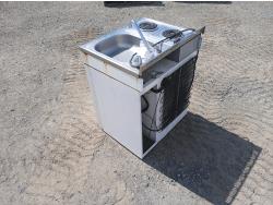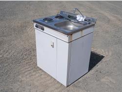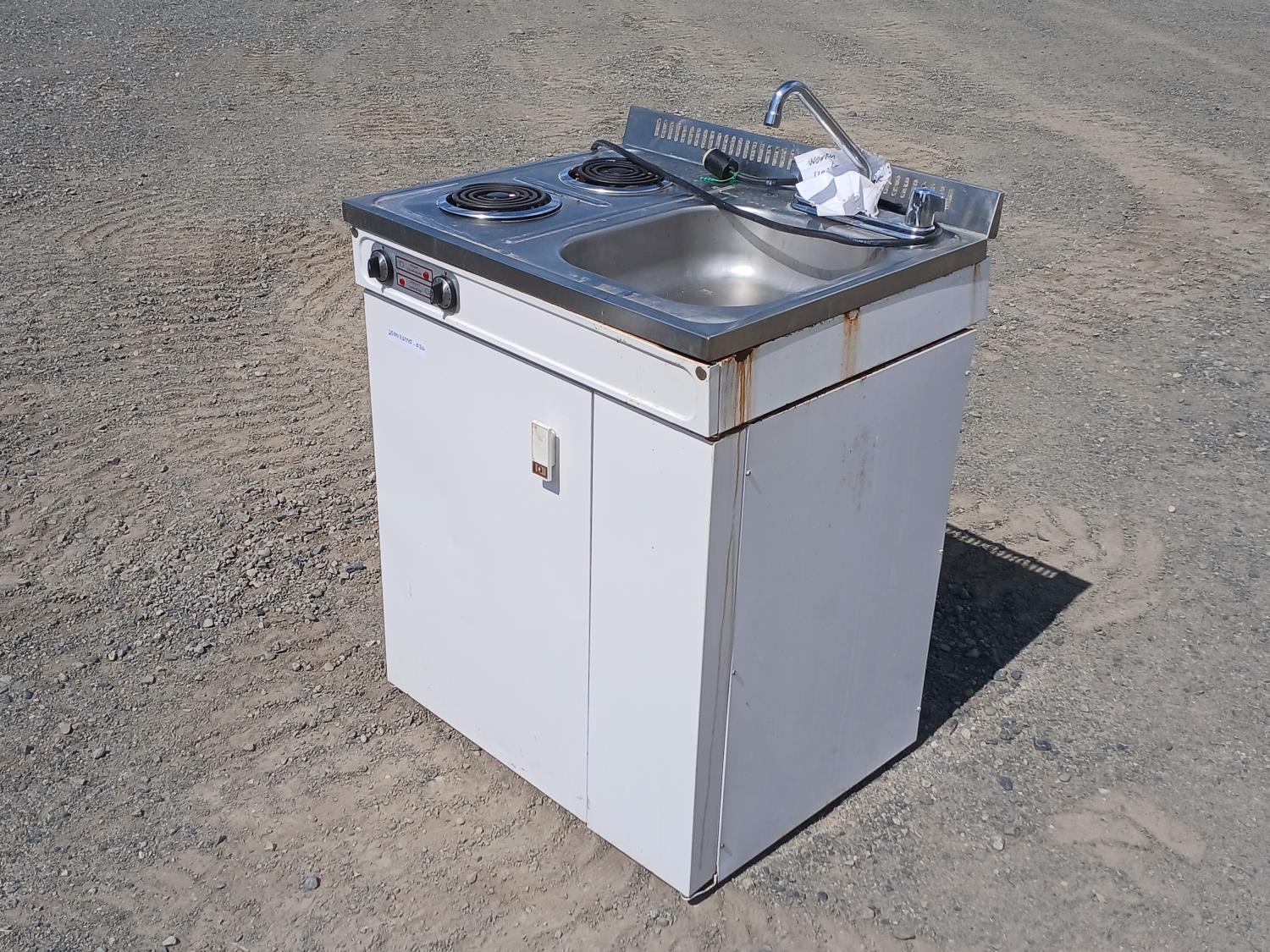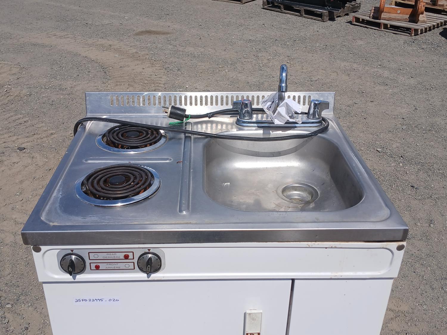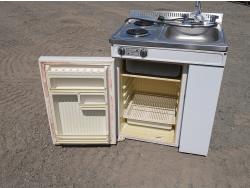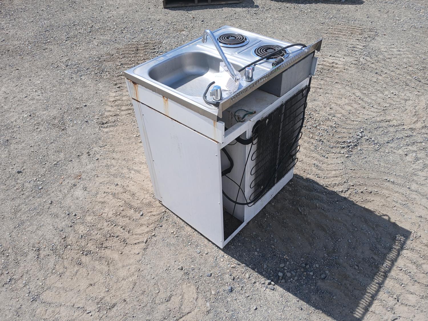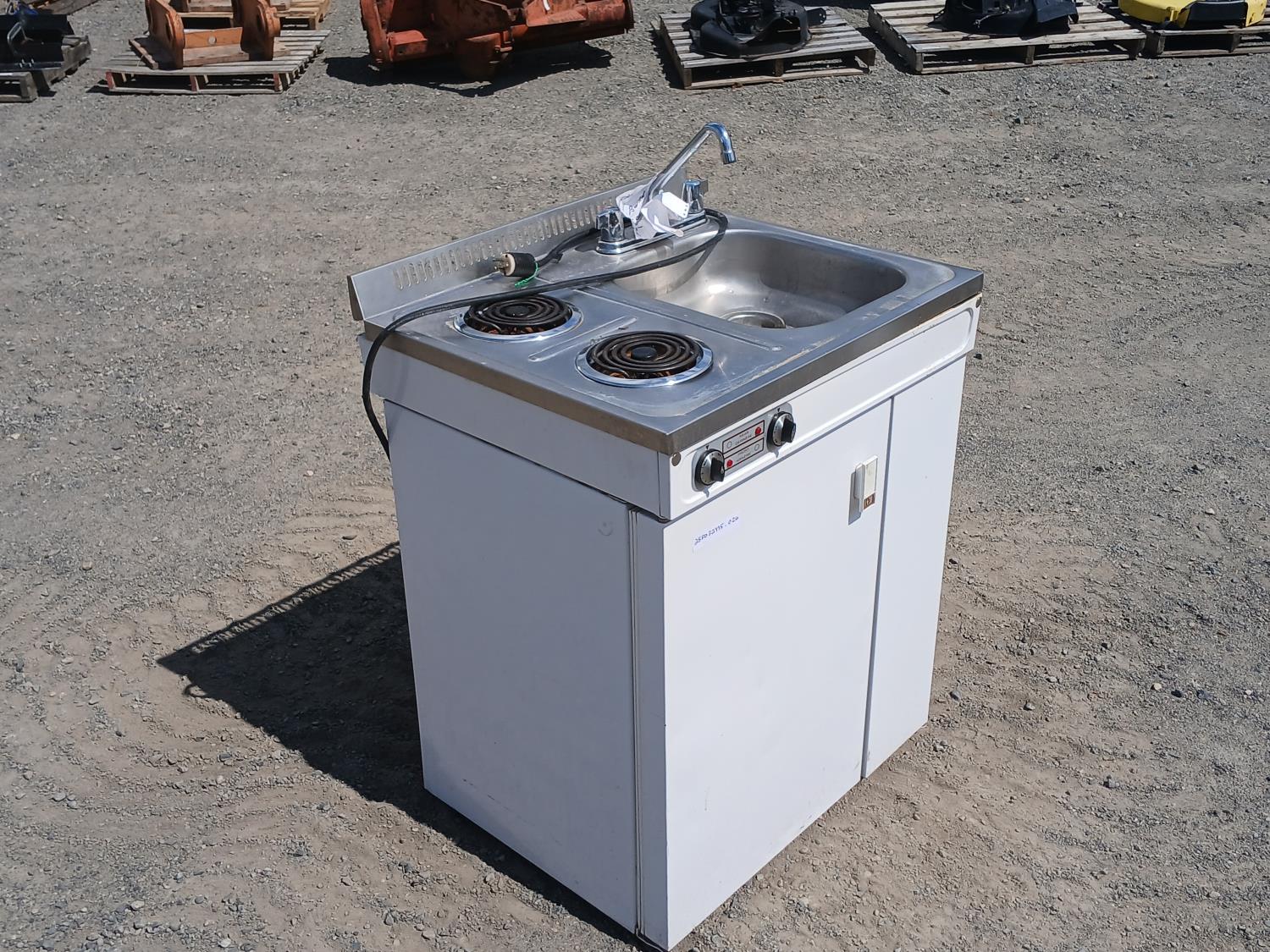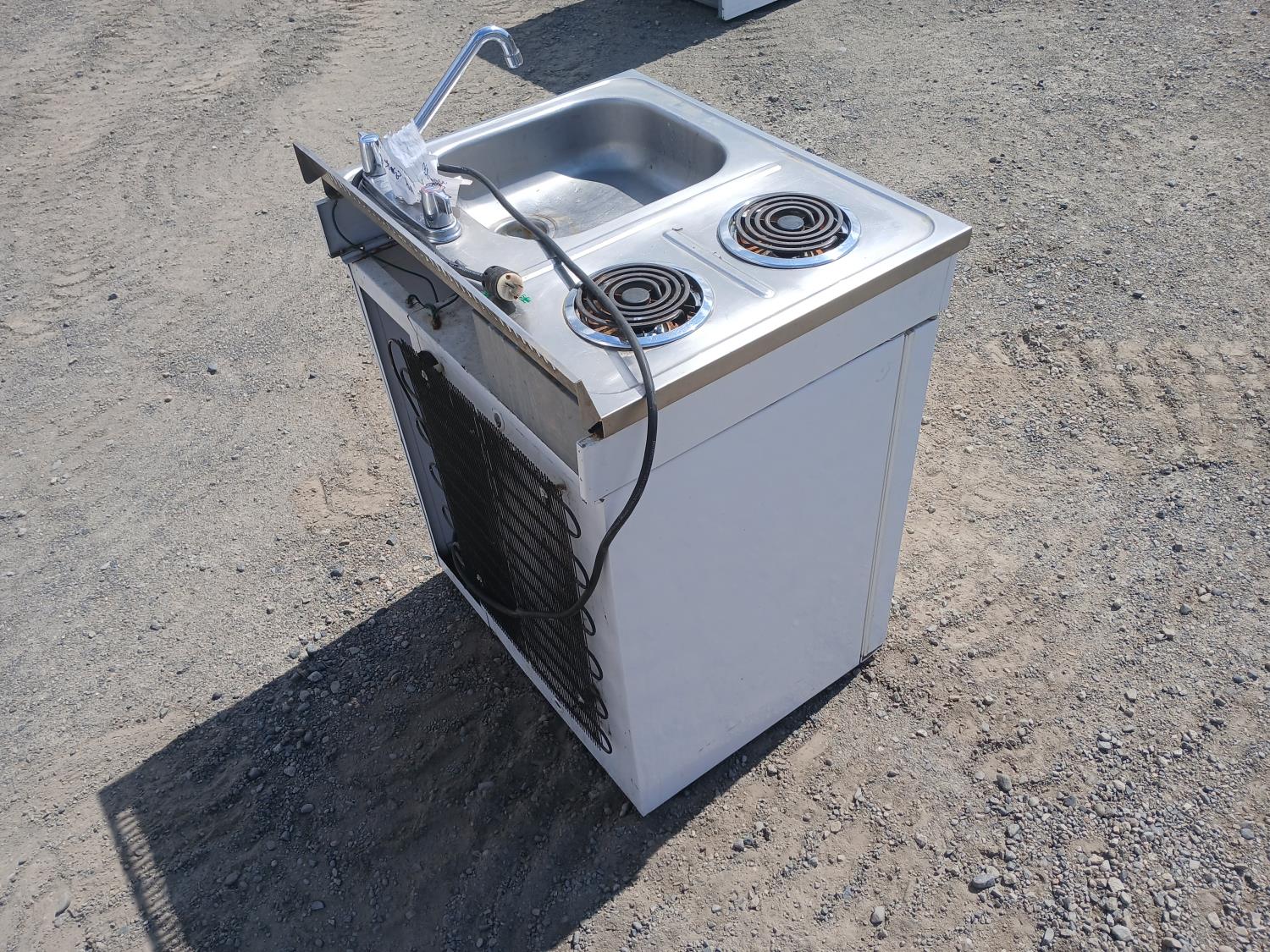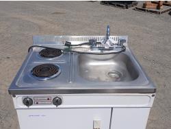 (2) Burner electric cook top stove, single sink with faucets, and fridge with small freezer space.