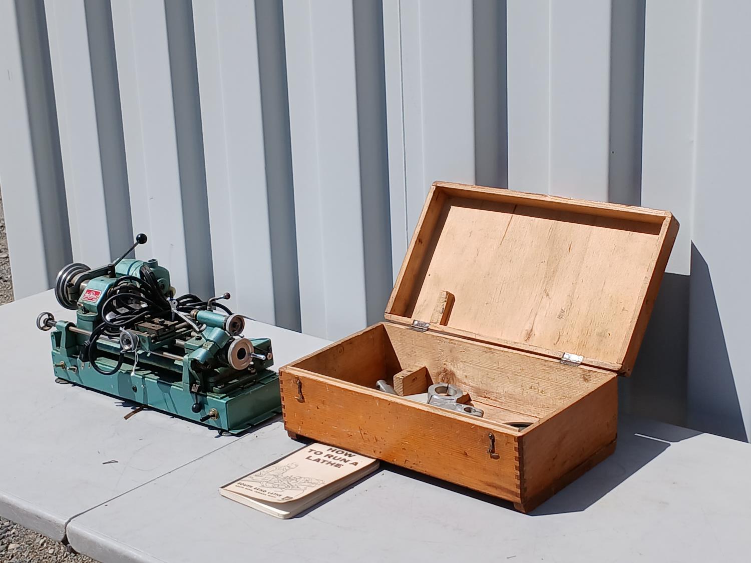 110 volt, 70 watt lathe, learning manual, and accessories included with original wood case