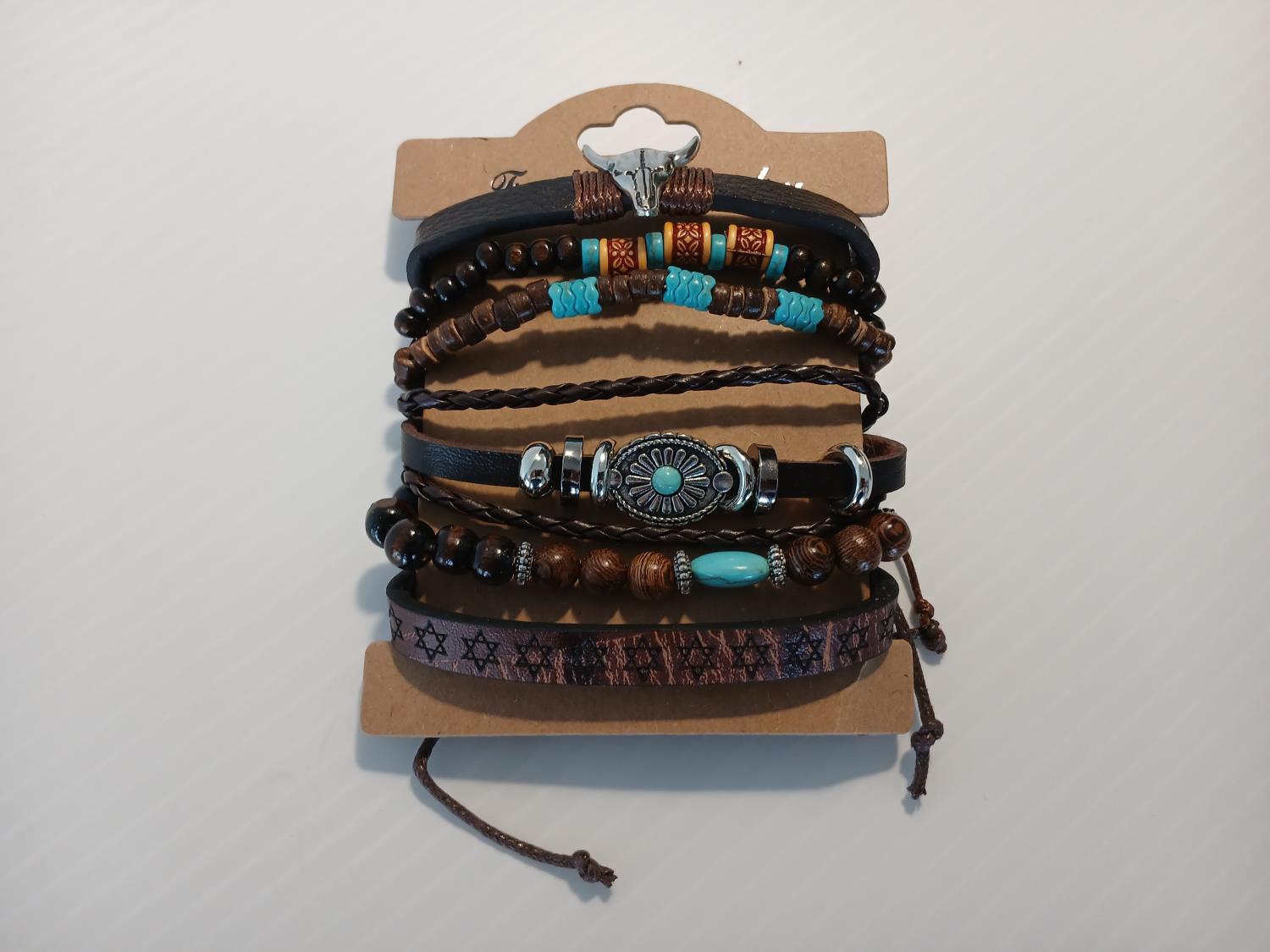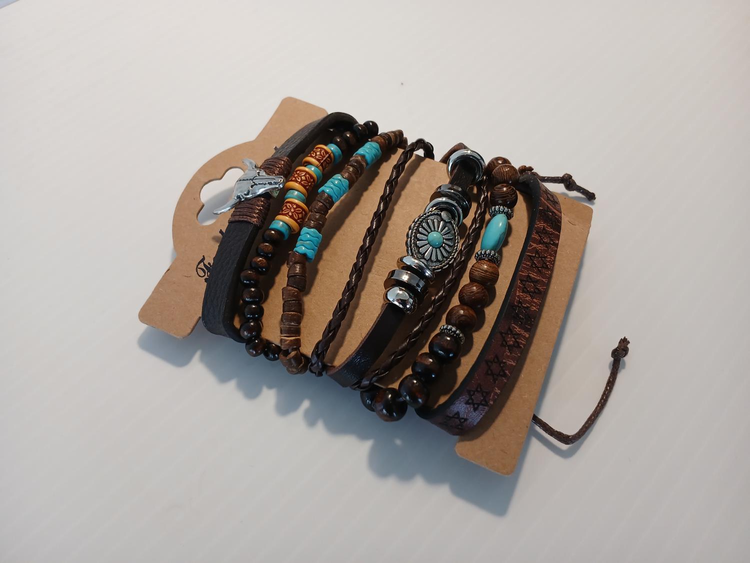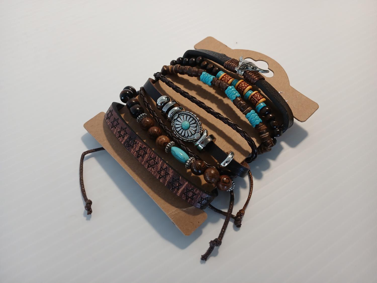 (6) Varied leather bracelets, with silver tone, wood, and Turquoise tone accents.