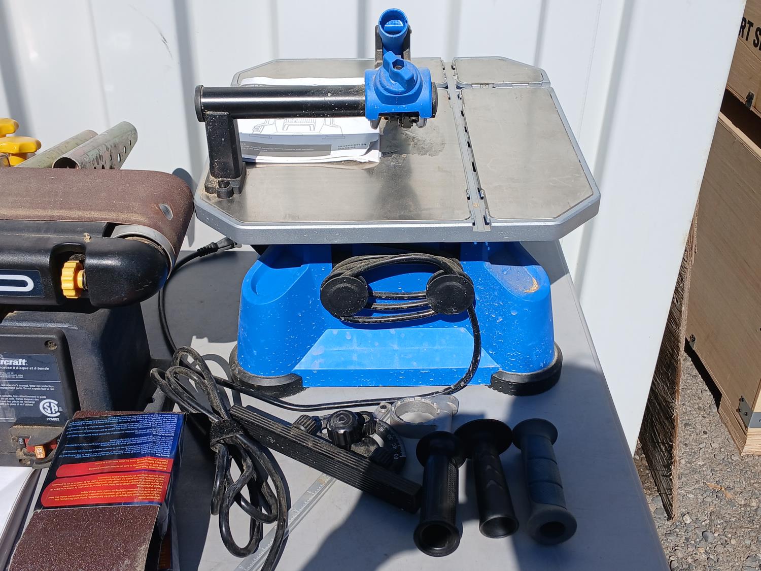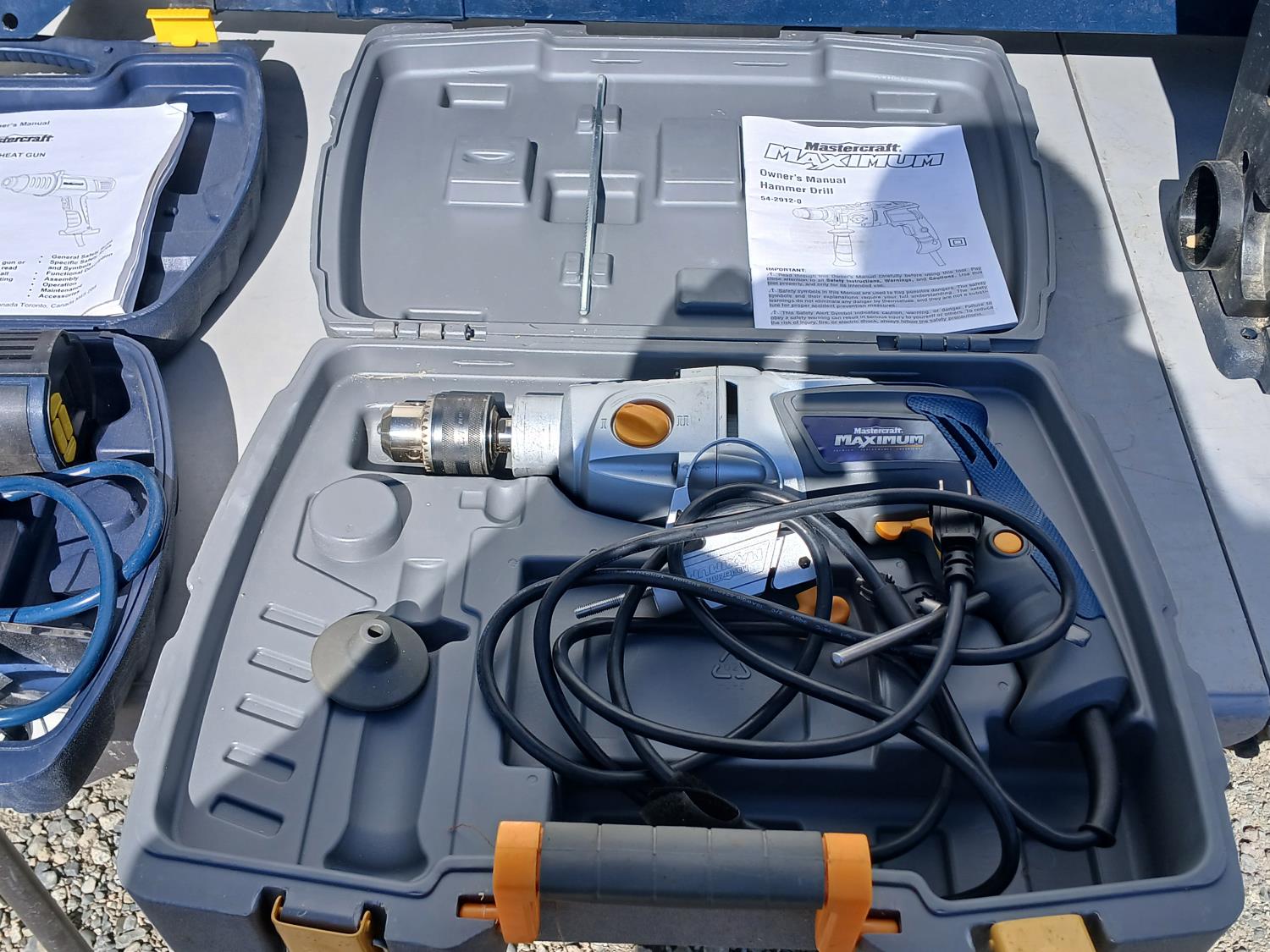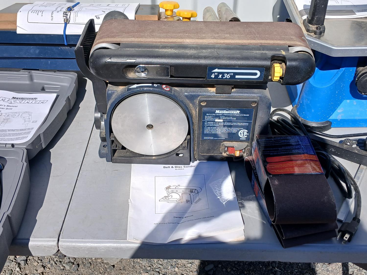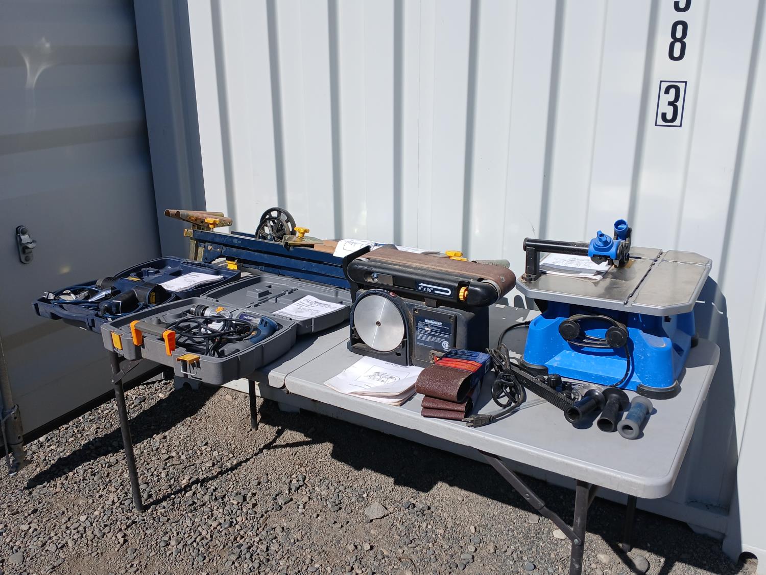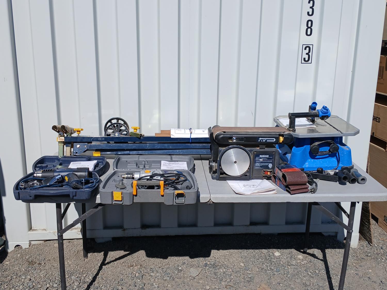 (1) Versa saw, (1) Hammer drill, (1) Miter saw stand, (1) 6 inch Belt/disc sander, (1)12.5 amp Heat gun.