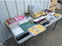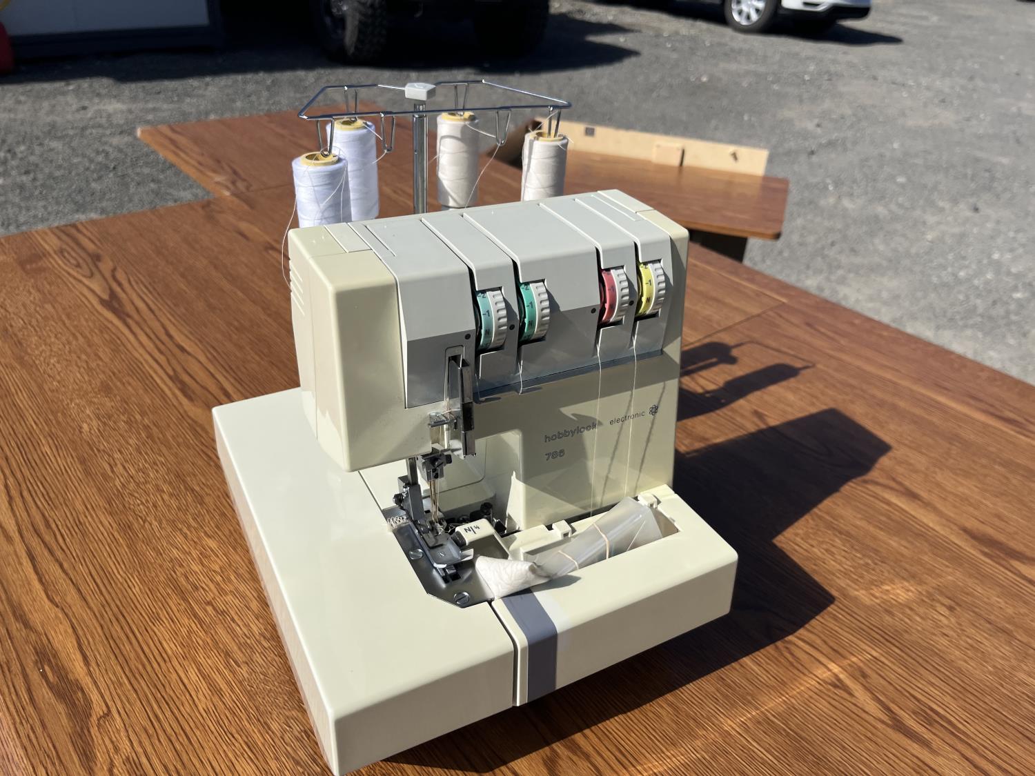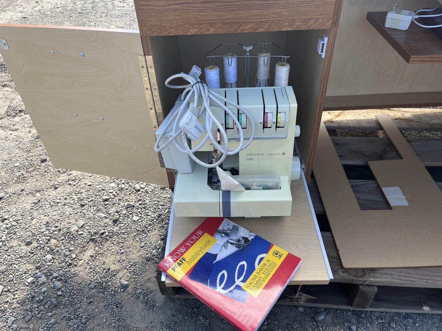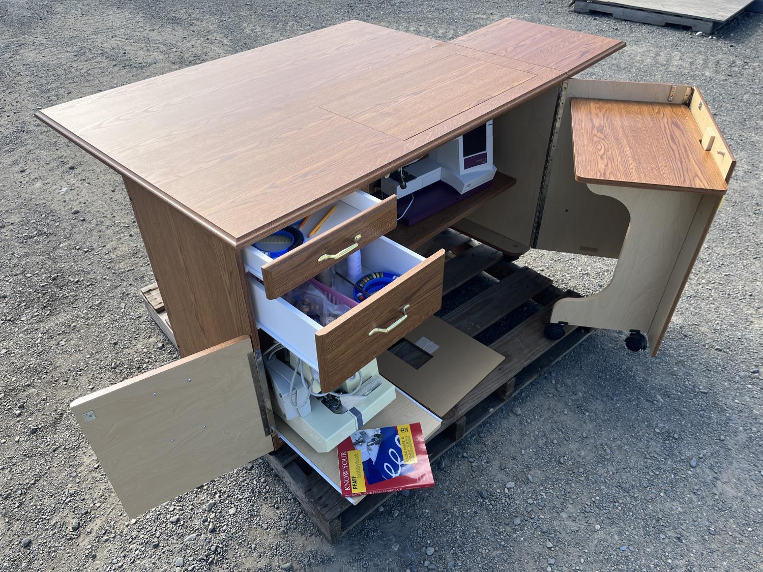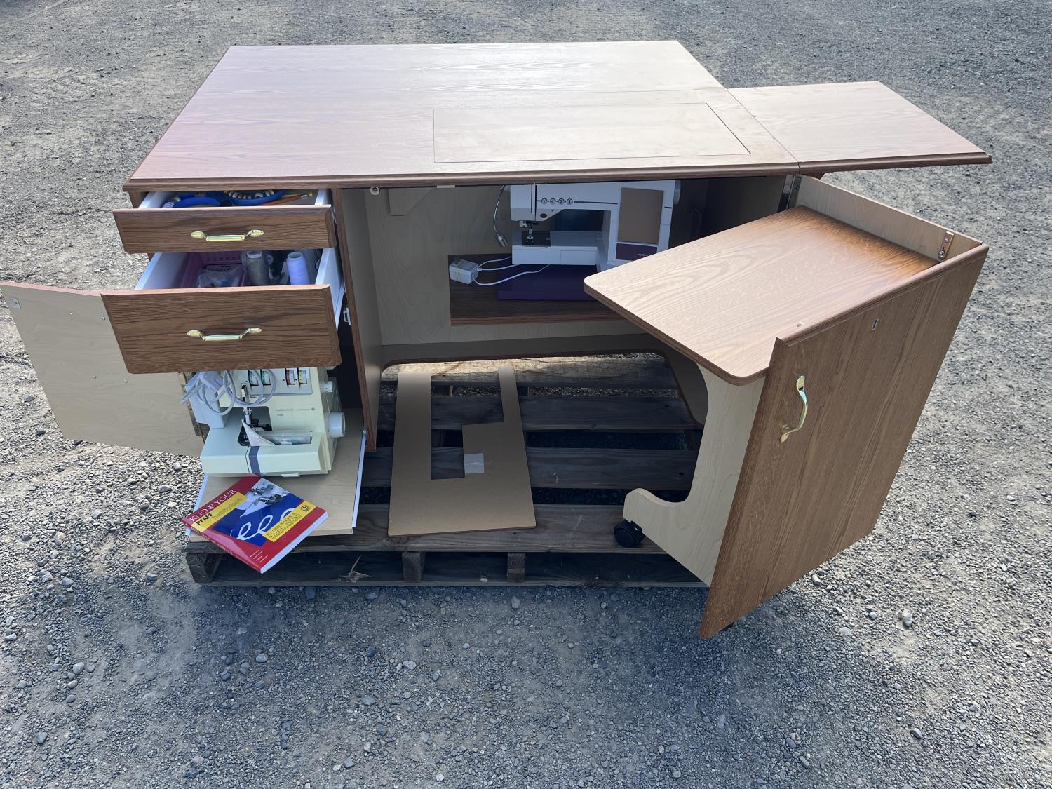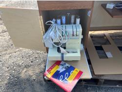 Sewing machine, Serger (Hobbylock), sewing desk, Ottlite x2, assorted tool and accessories, (7) cases various thread colors, rotary matts, pattern books, CD's.