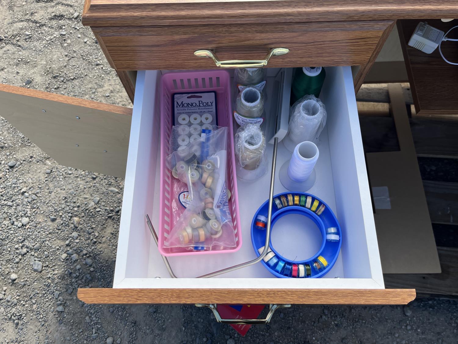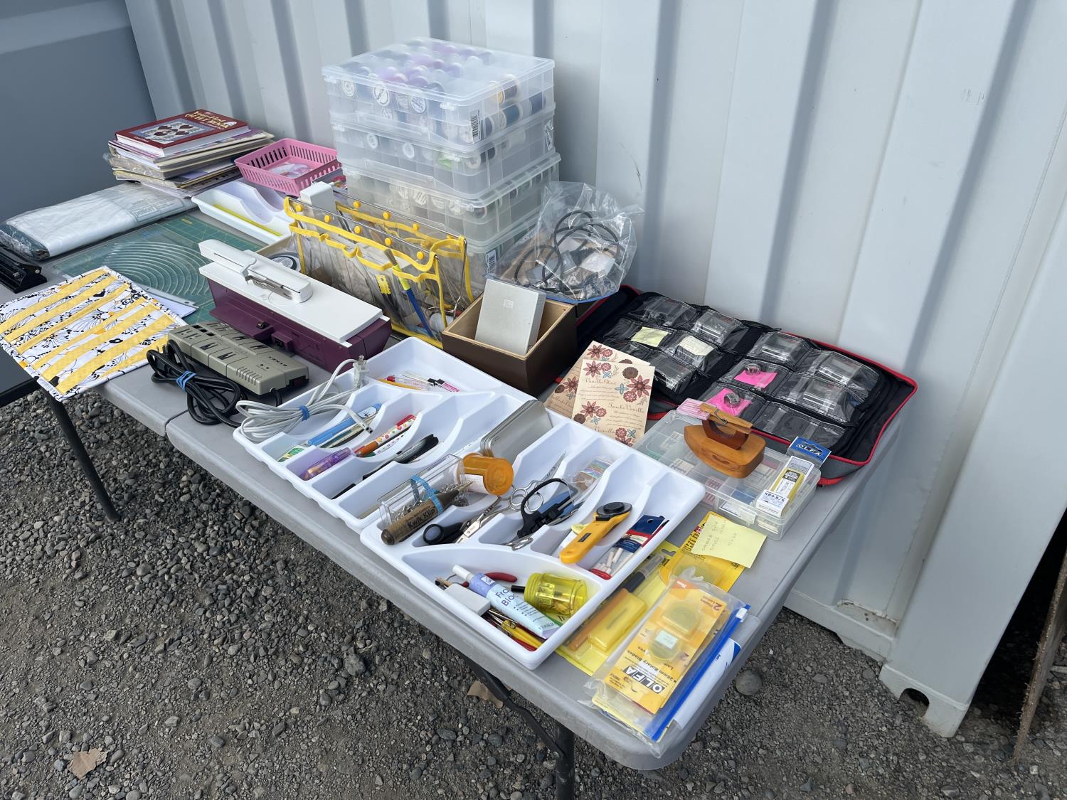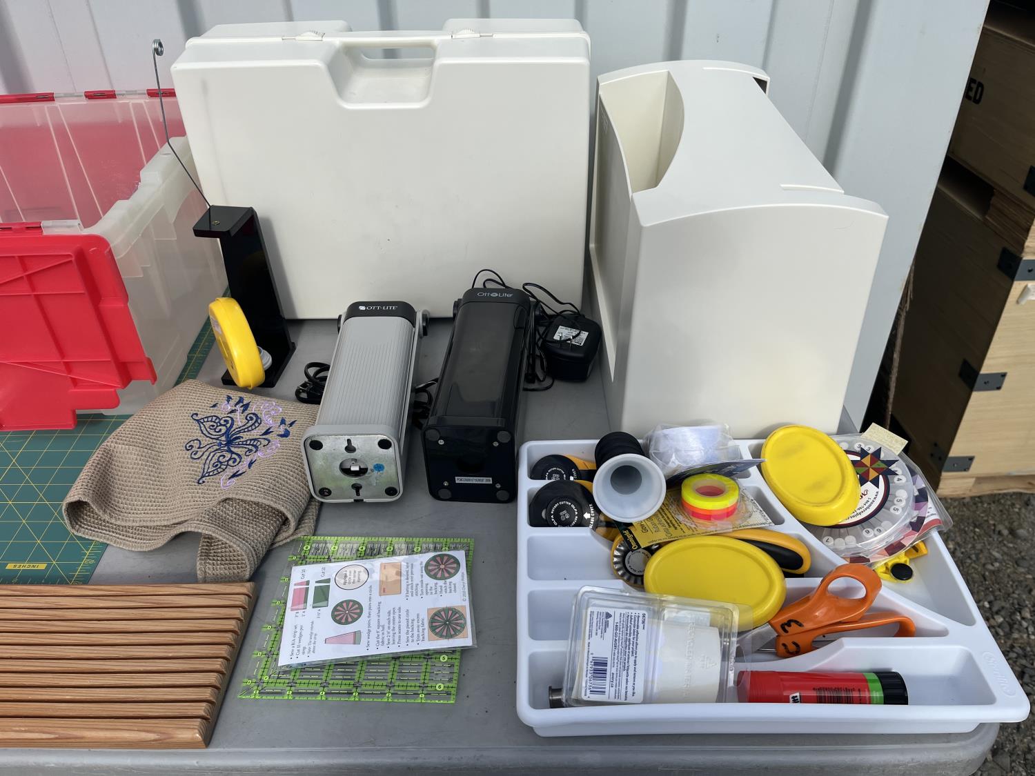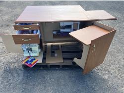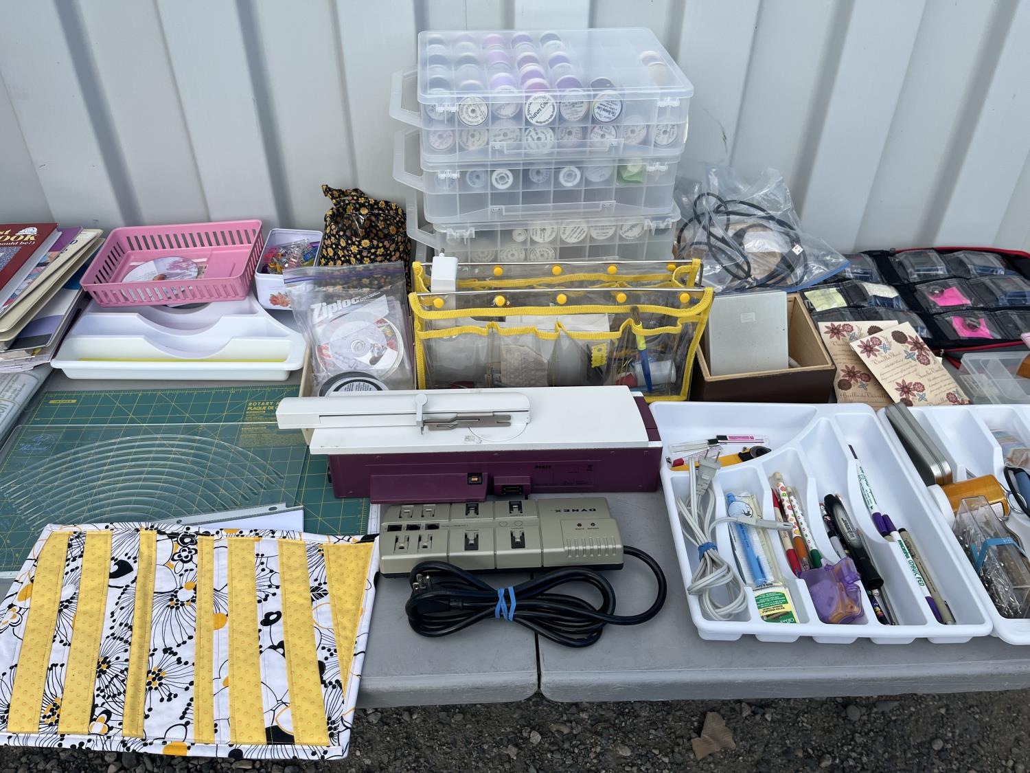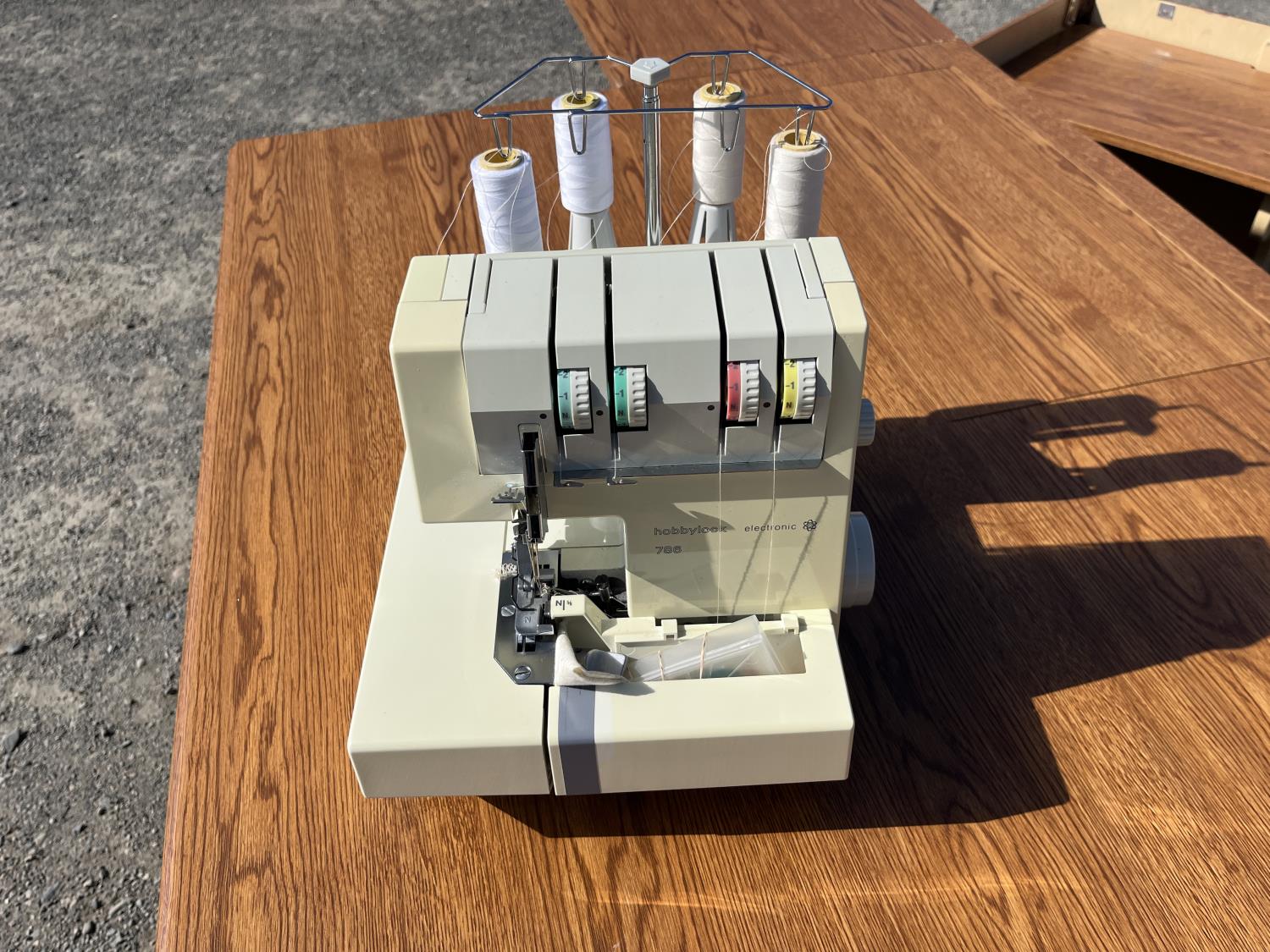 Sewing machine, Serger (Hobbylock), sewing desk, Ottlite x2, assorted tool and accessories, (7) cases various thread colors, rotary matts, pattern books, CD's.