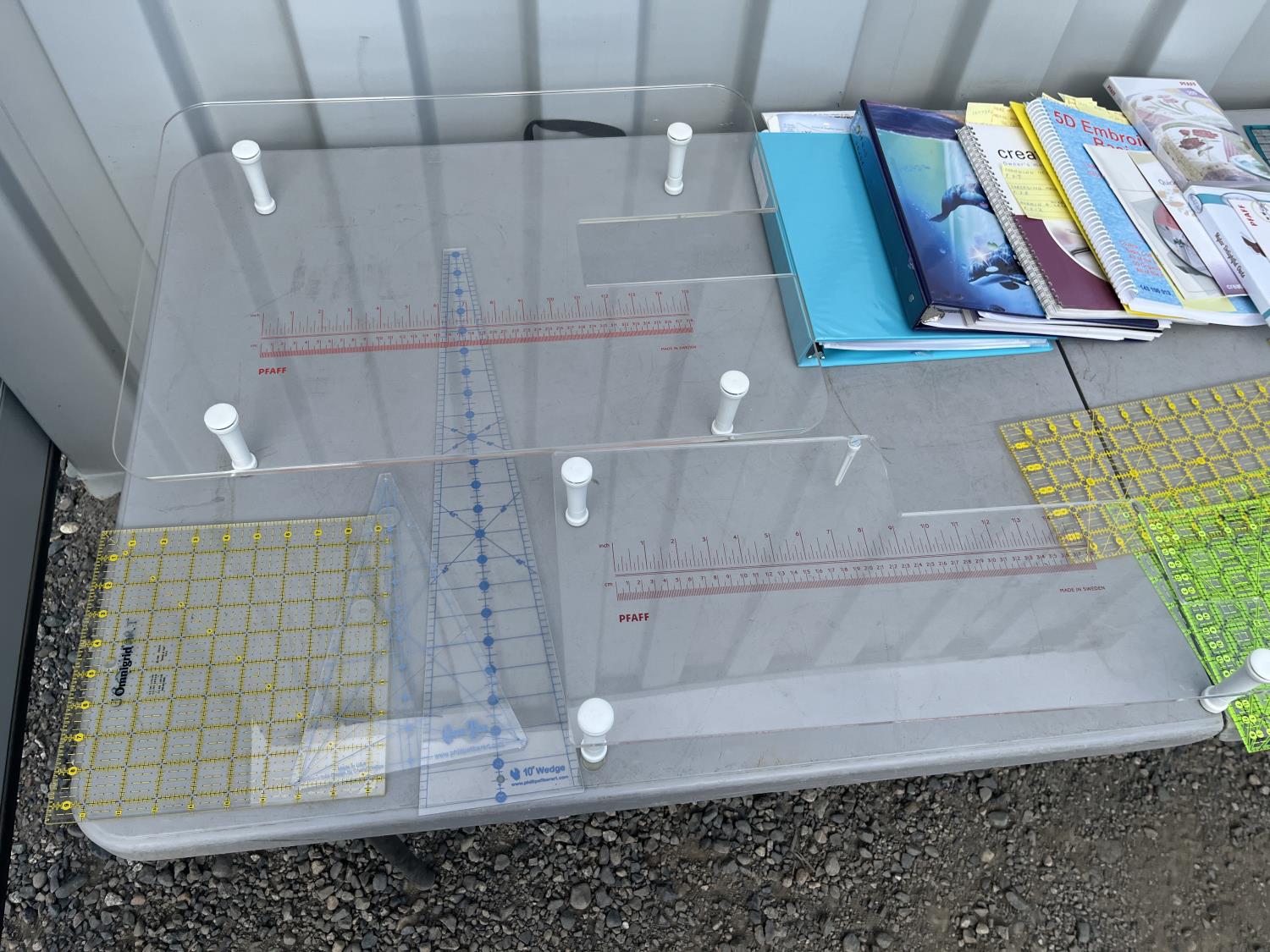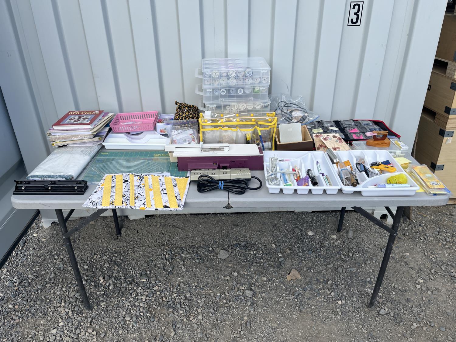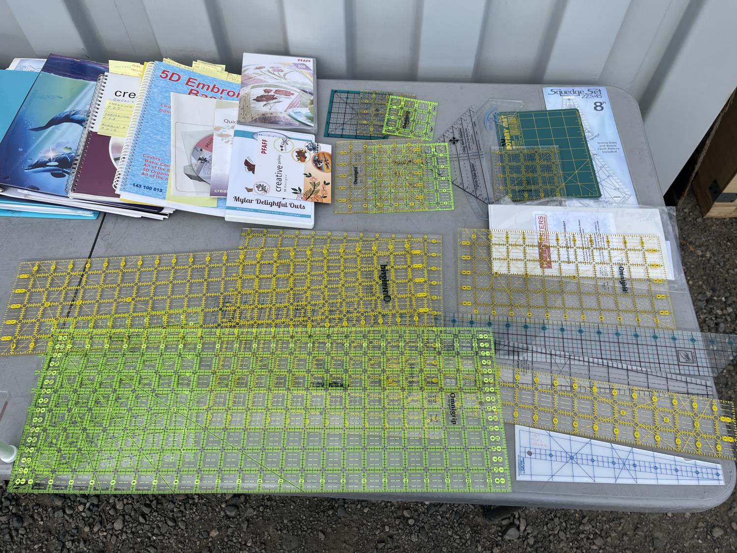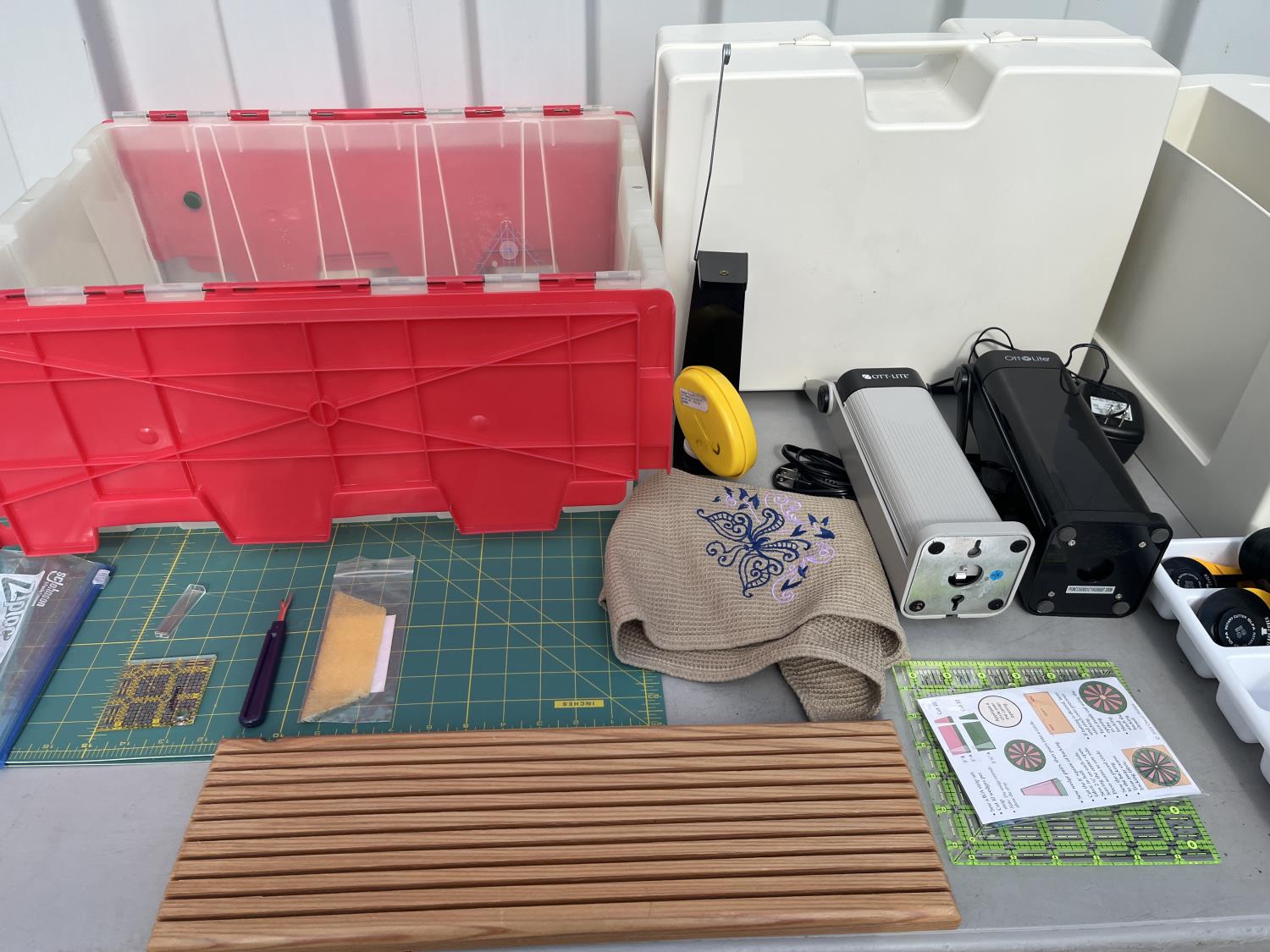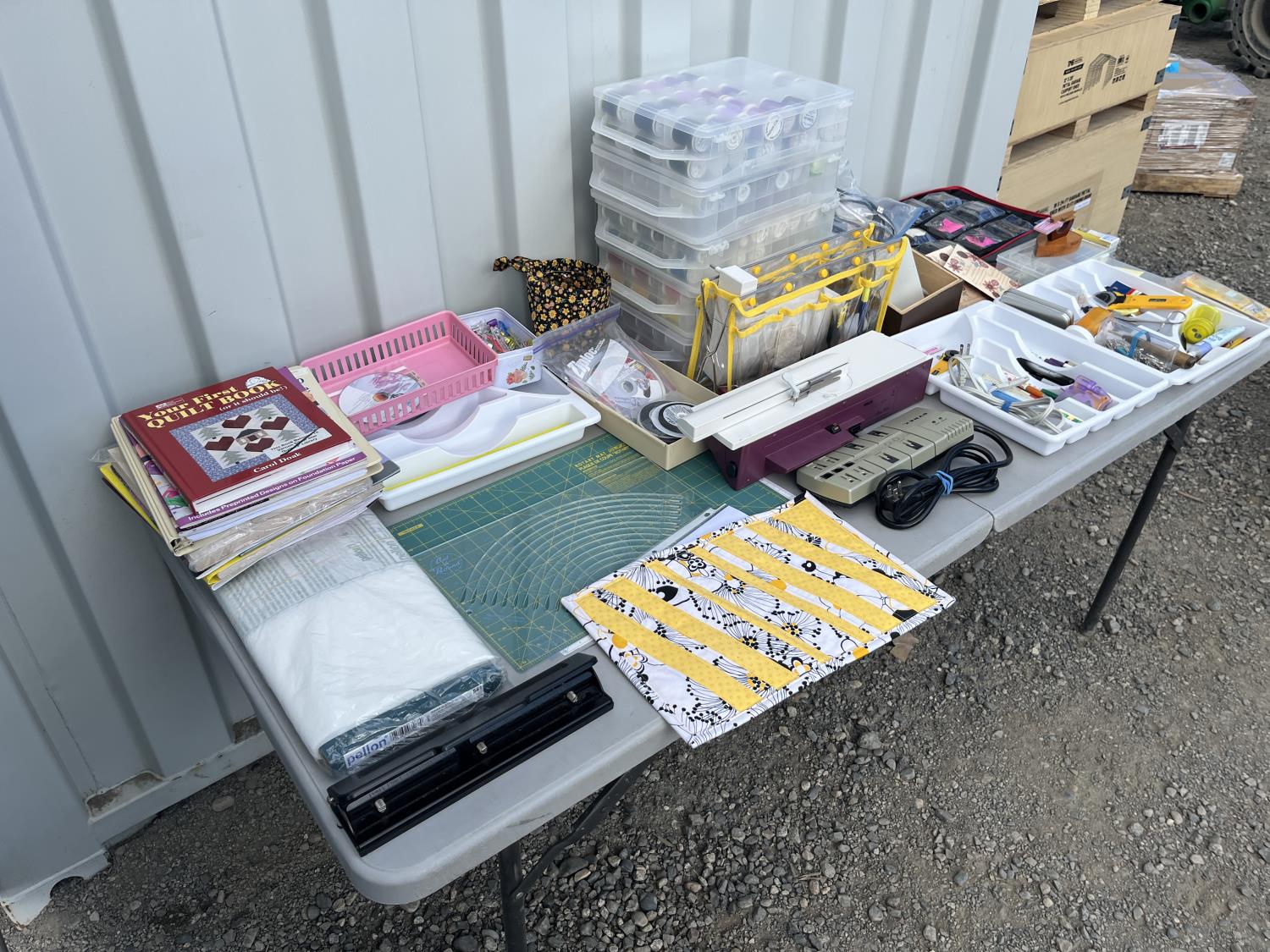 Sewing machine, Serger (Hobbylock), sewing desk, Ottlite x2, assorted tool and accessories, (7) cases various thread colors, rotary matts, pattern books, CD's.