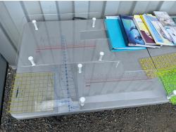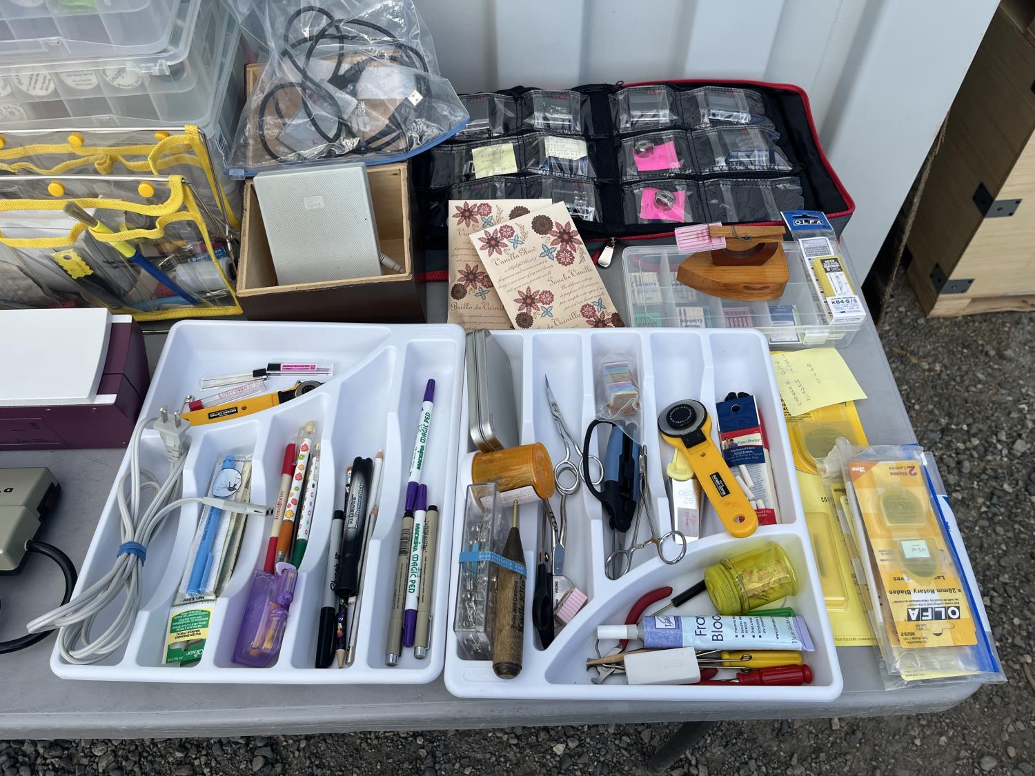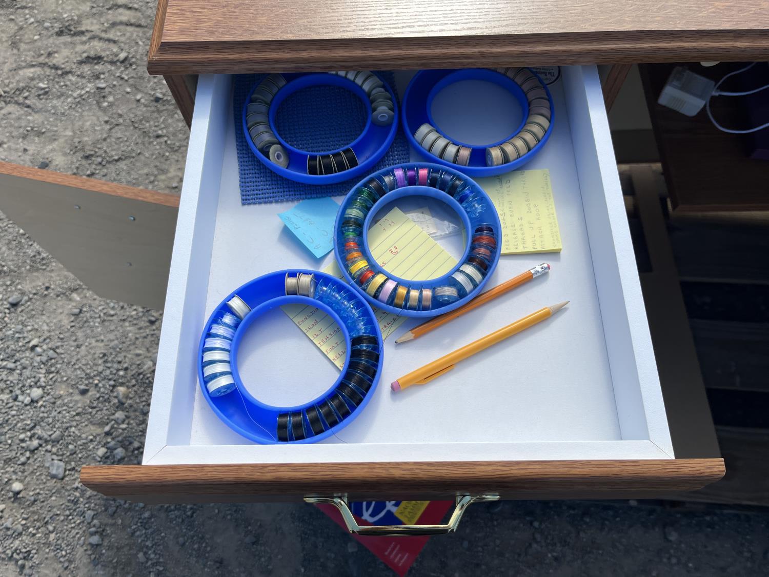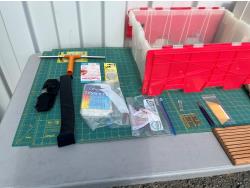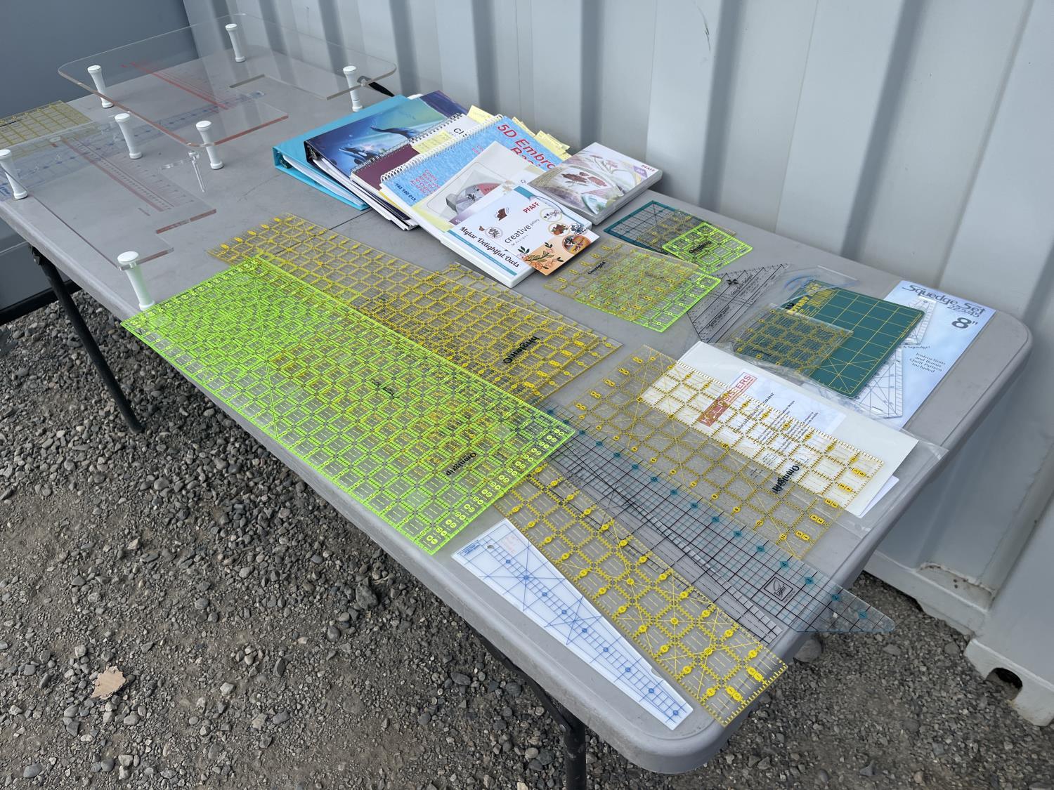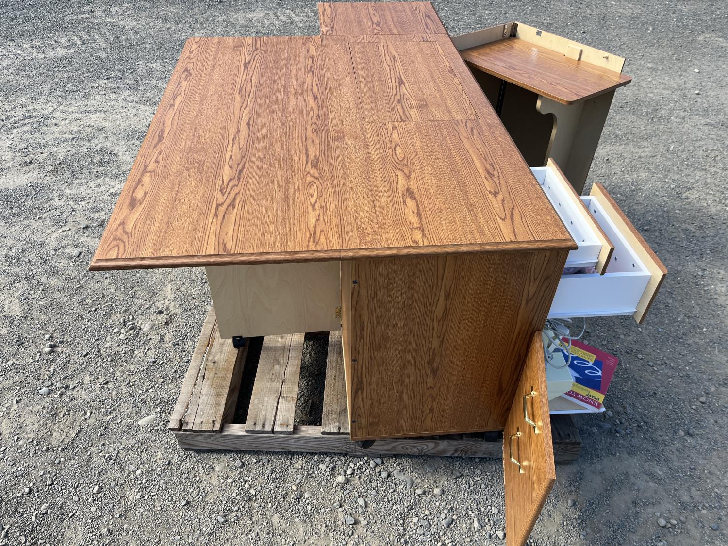 Sewing machine, Serger (Hobbylock), sewing desk, Ottlite x2, assorted tool and accessories, (7) cases various thread colors, rotary matts, pattern books, CD's.