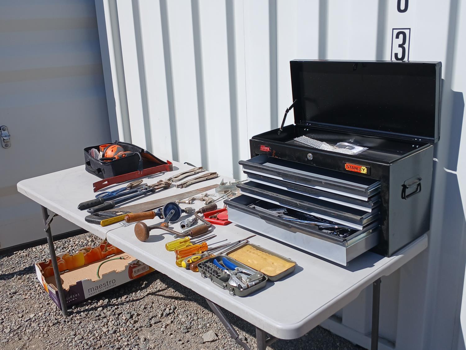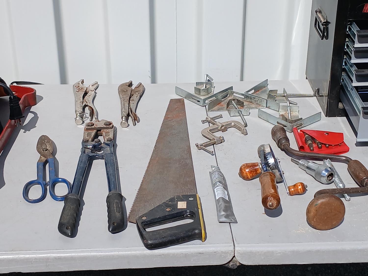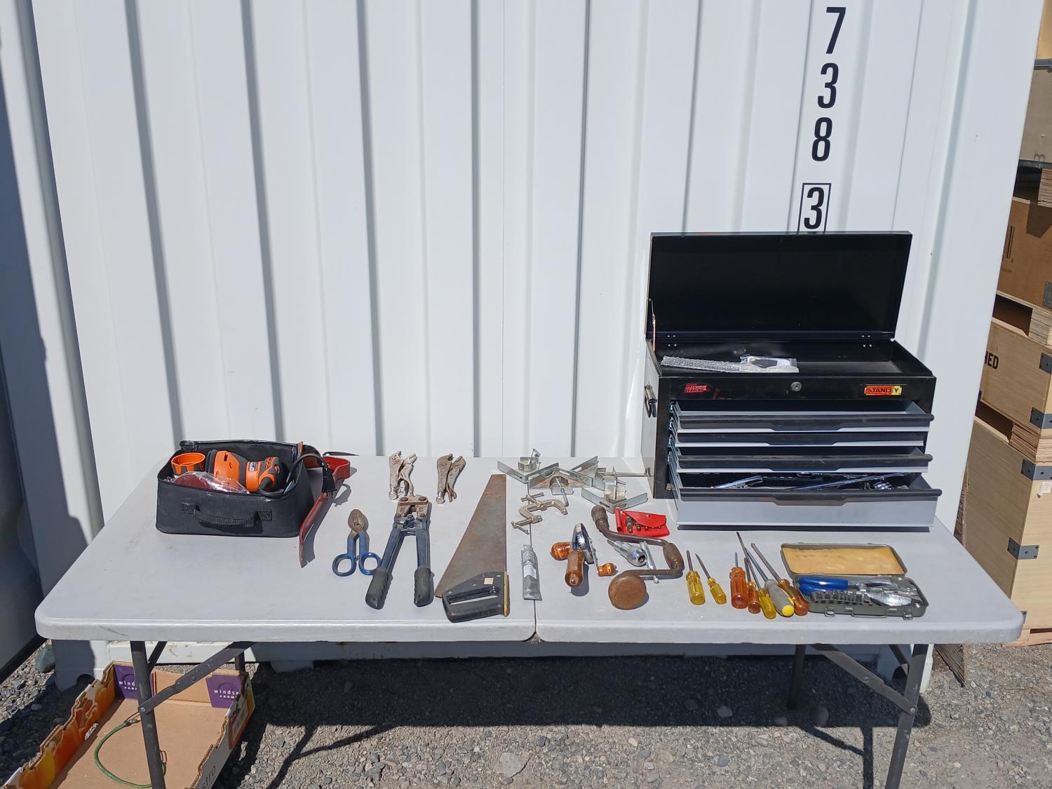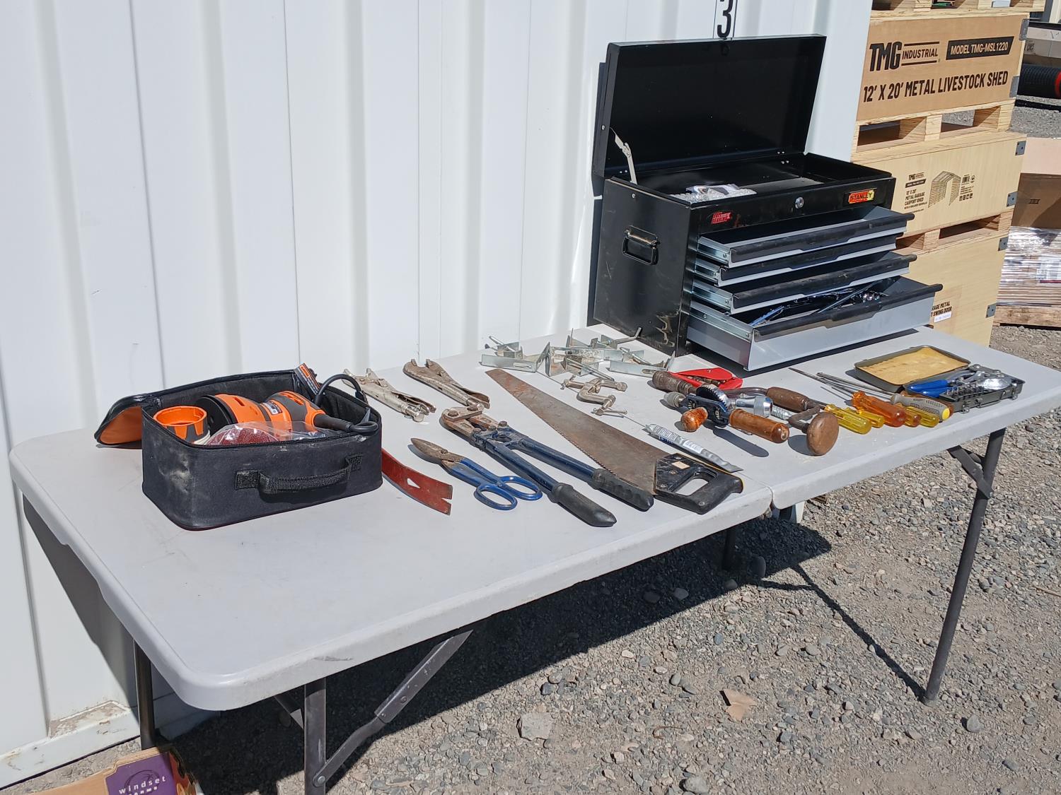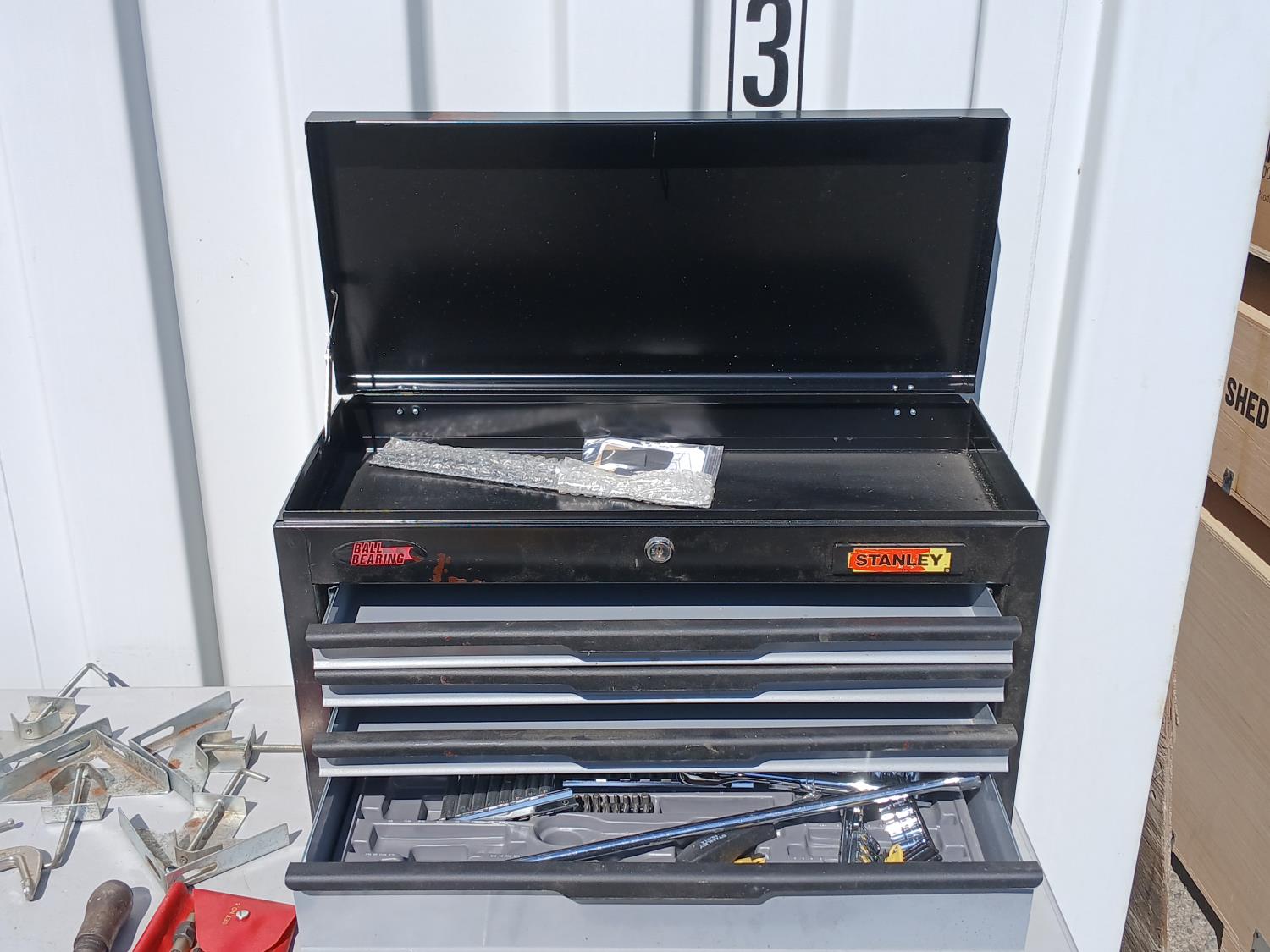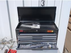 (1) Stanley flip top, 4 drawer tool chest, (1) socket set, miscellaneous. hand tools, (4) corner clamps, (1) C-clamp, (1) Punch kit, (1) Rigid 5 inch disc sander.