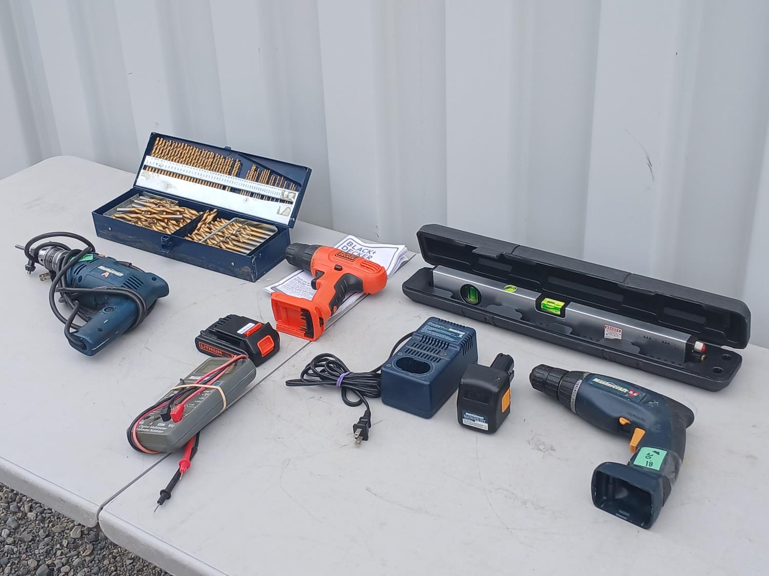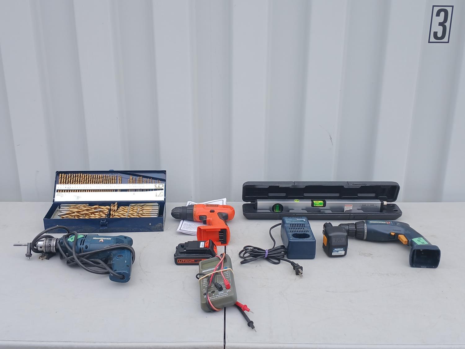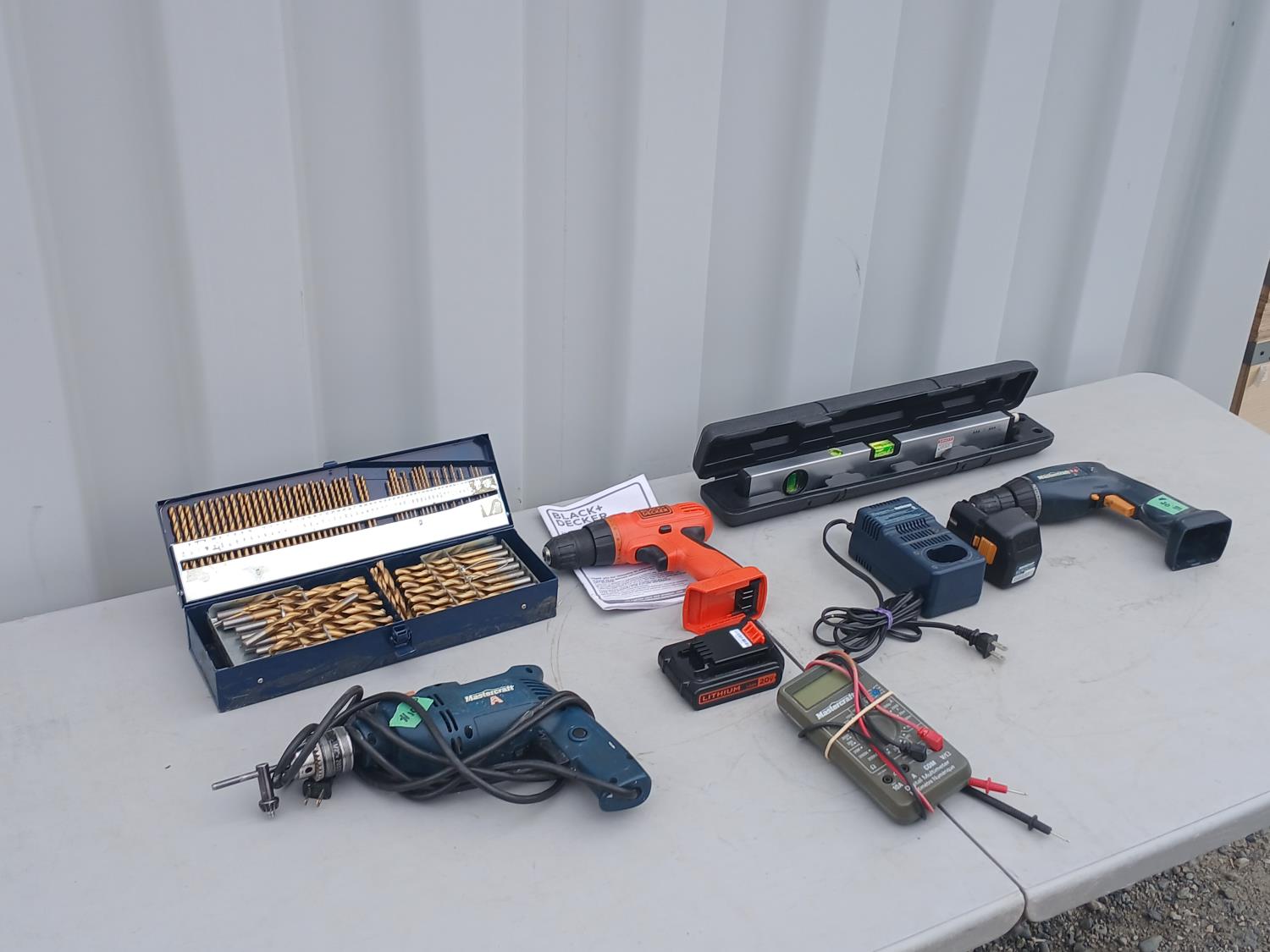 (1) Mastercraft electric drill, (1) Mastercraft large drill bit set, (1) Black and Decker cordless drill with (1) lithium battery, (1) Mastercraft cordless drill with (1) battery and charger, (1) Mastercraft digital multi reader, (1) Johnson level, tool combination in case.