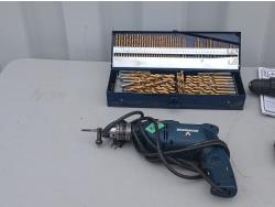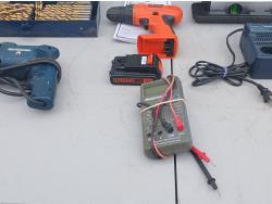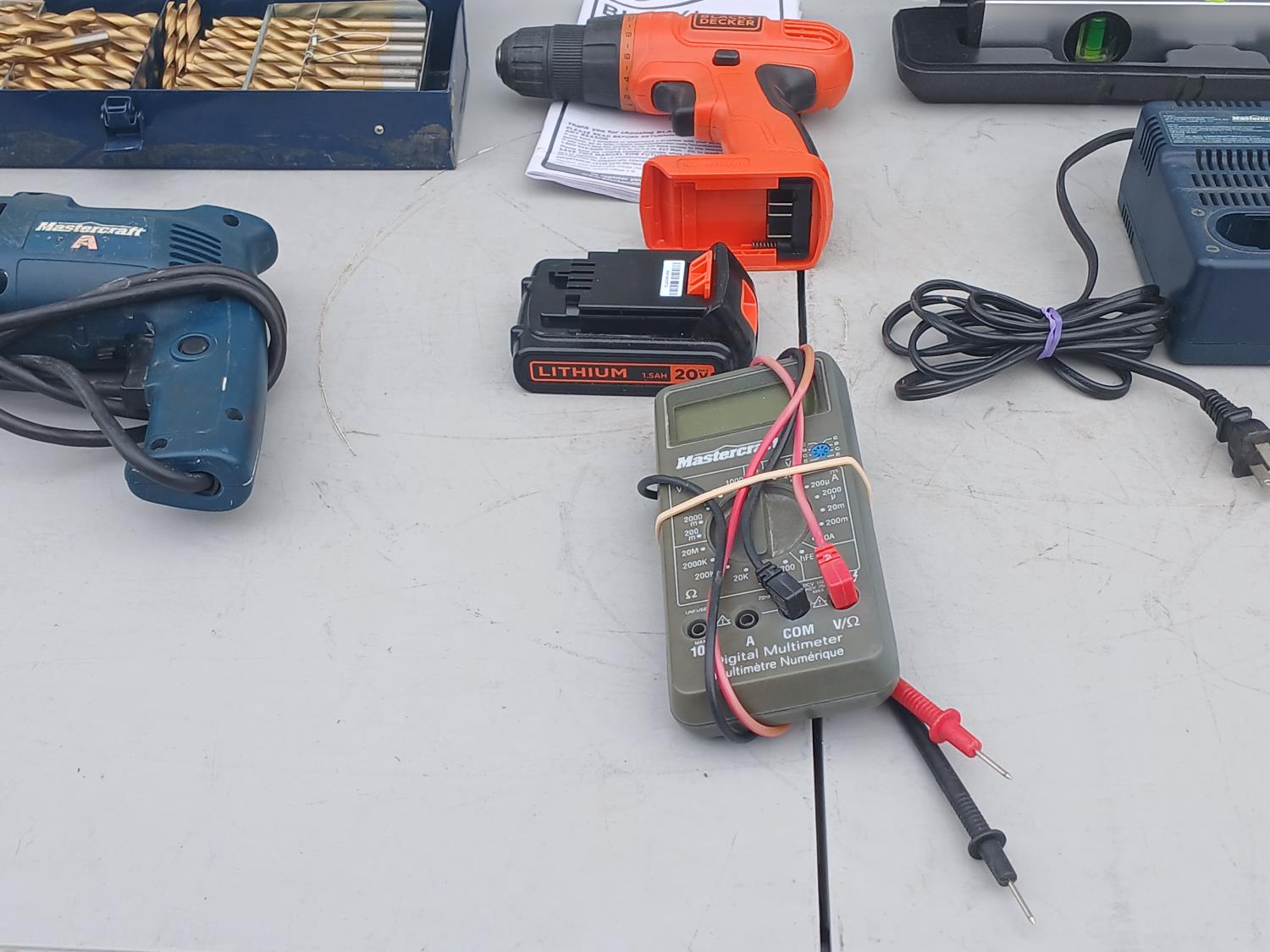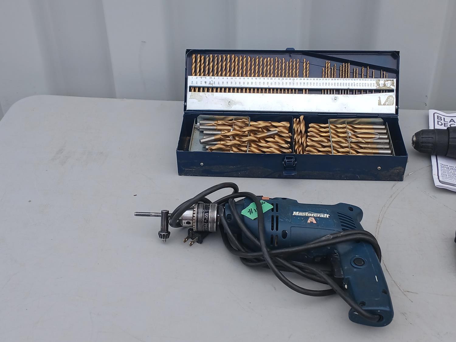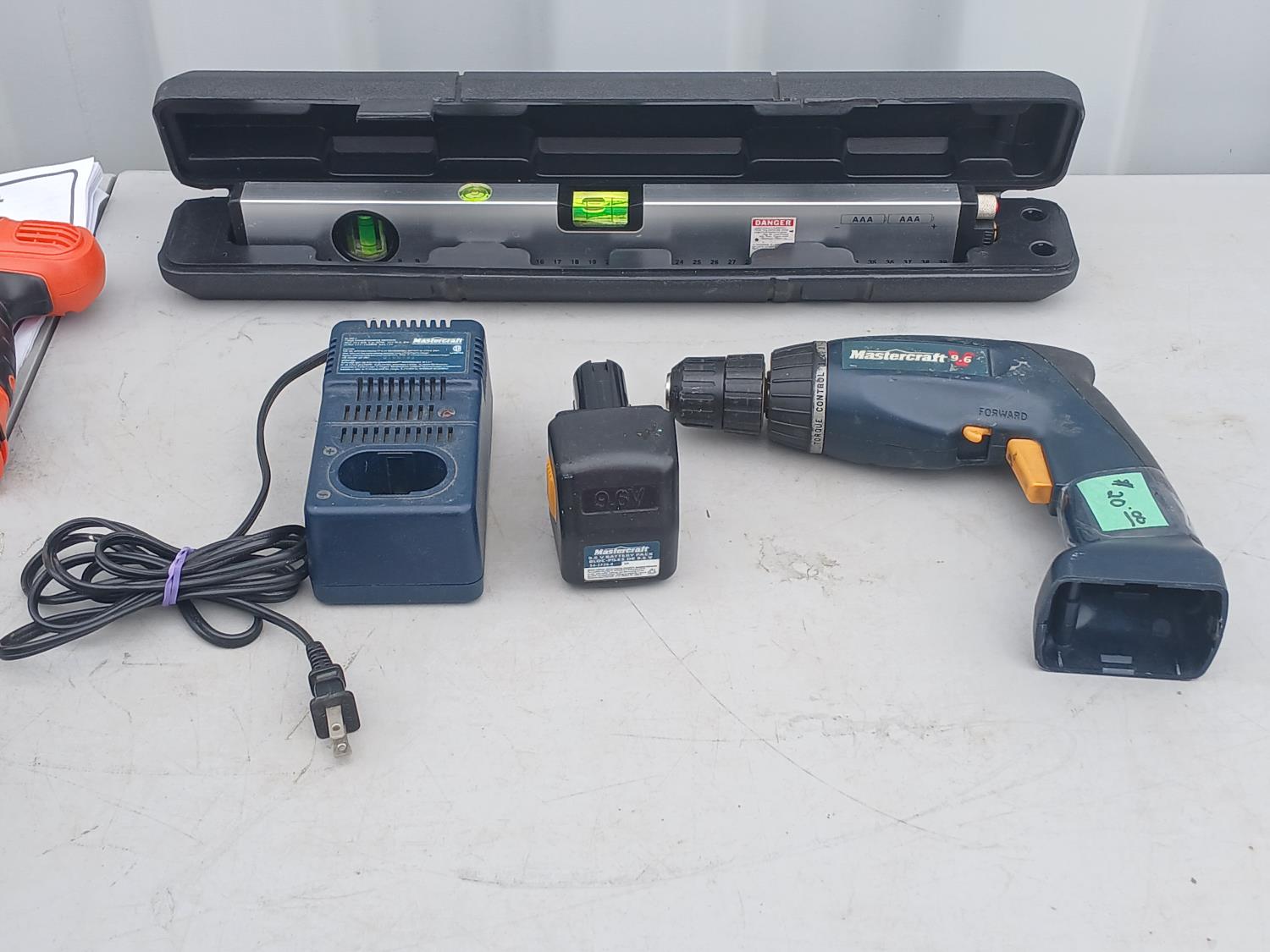 (1) Mastercraft electric drill, (1) Mastercraft large drill bit set, (1) Black and Decker cordless drill with (1) lithium battery, (1) Mastercraft cordless drill with (1) battery and charger, (1) Mastercraft digital multi reader, (1) Johnson level, tool combination in case.