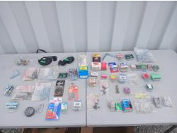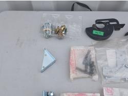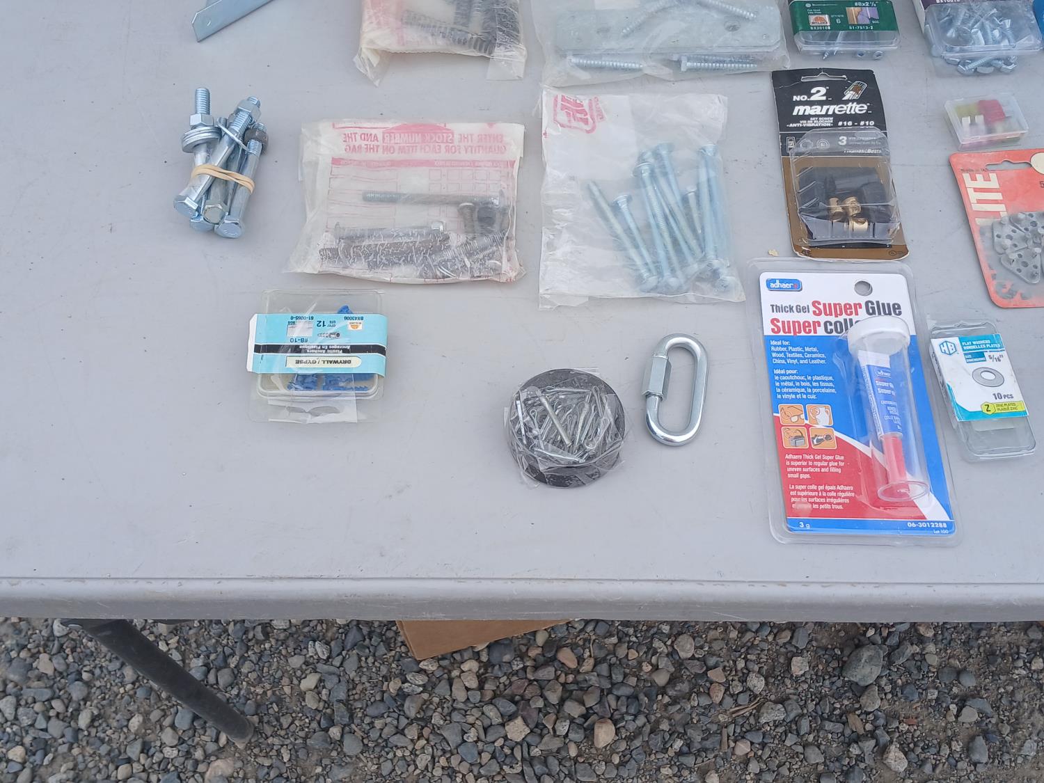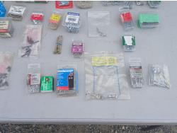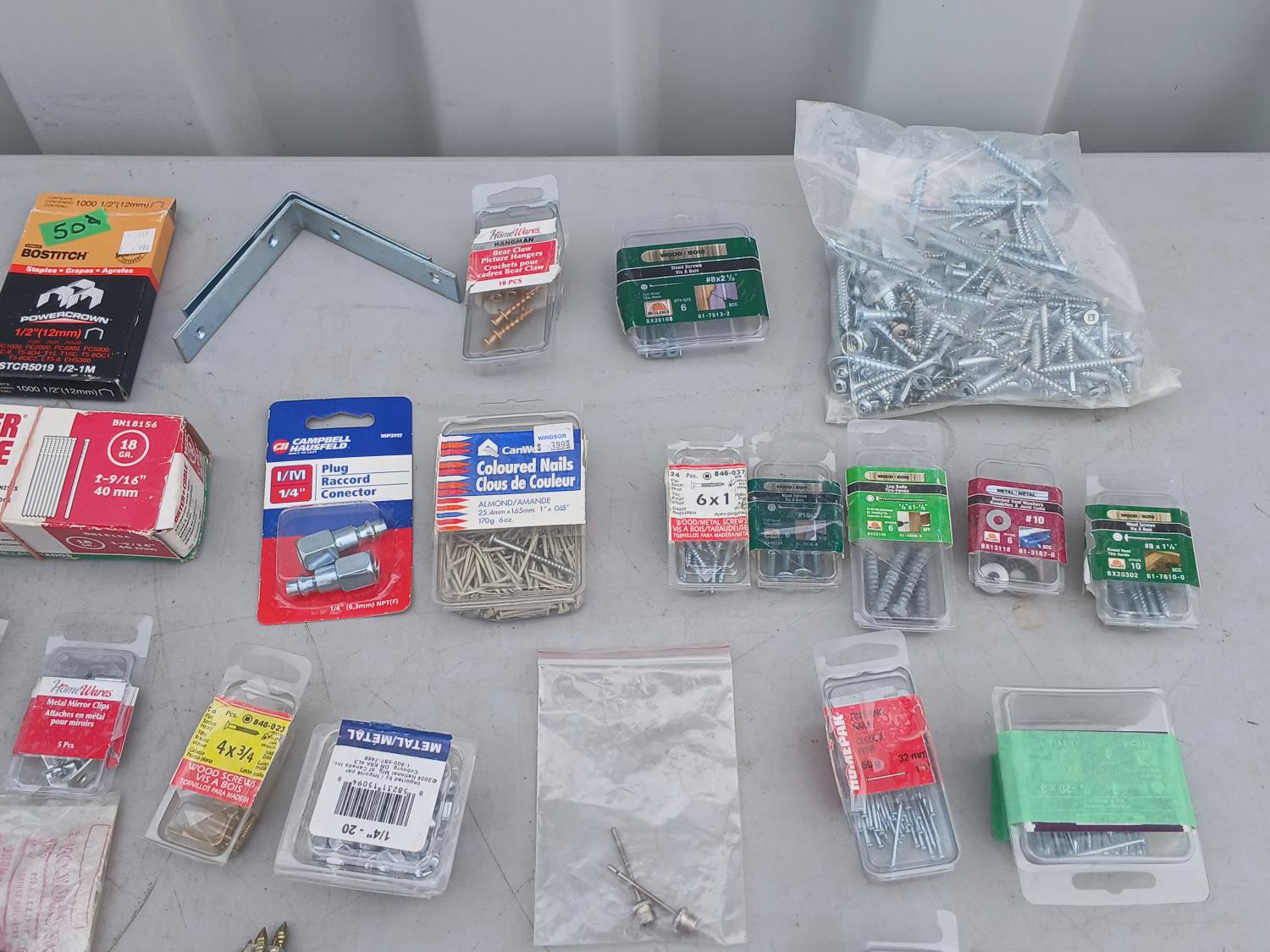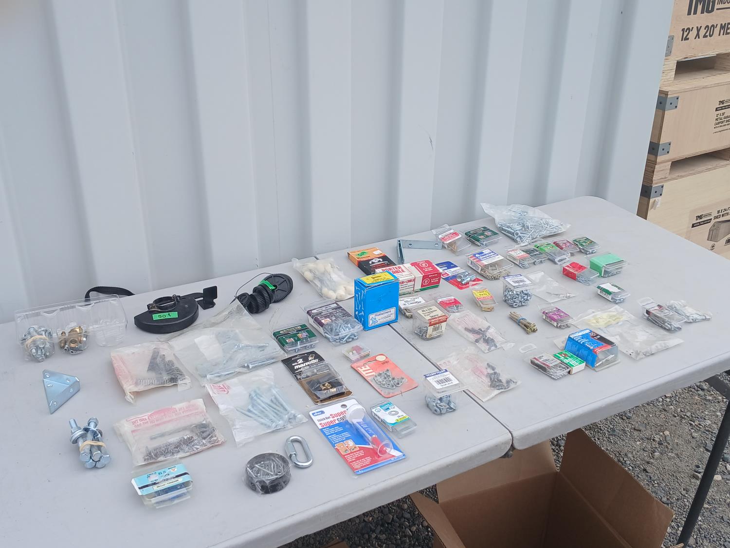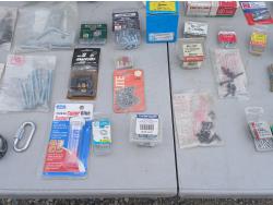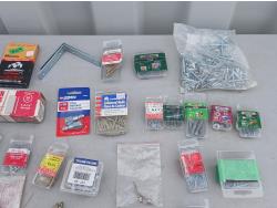 Multiple sized screws, bolts, nuts and washers. Cotter pins, finishing nail, brad nails, plug raccord connectors, L brackets, flat bracket, 4 inch grinder guard, rivets, super glue, marrettes, wall anchors, valves, flints.