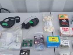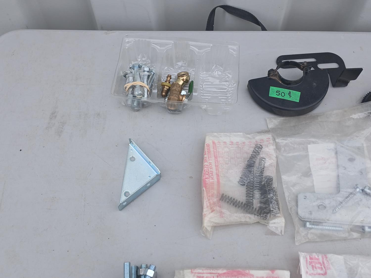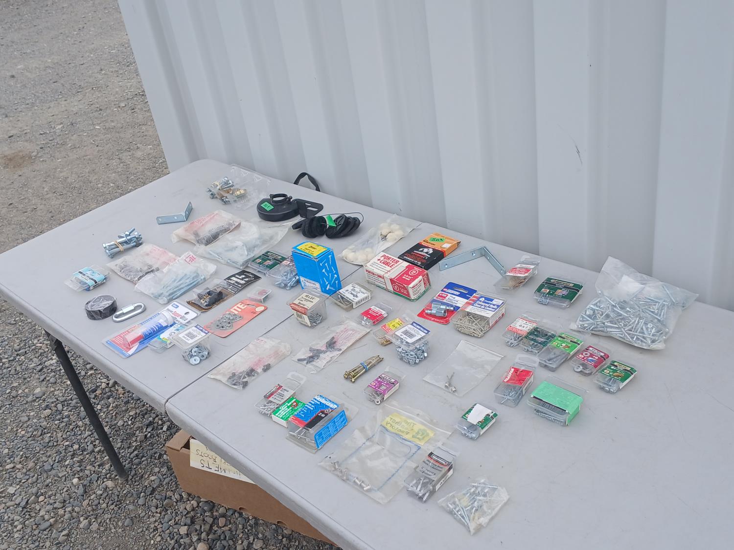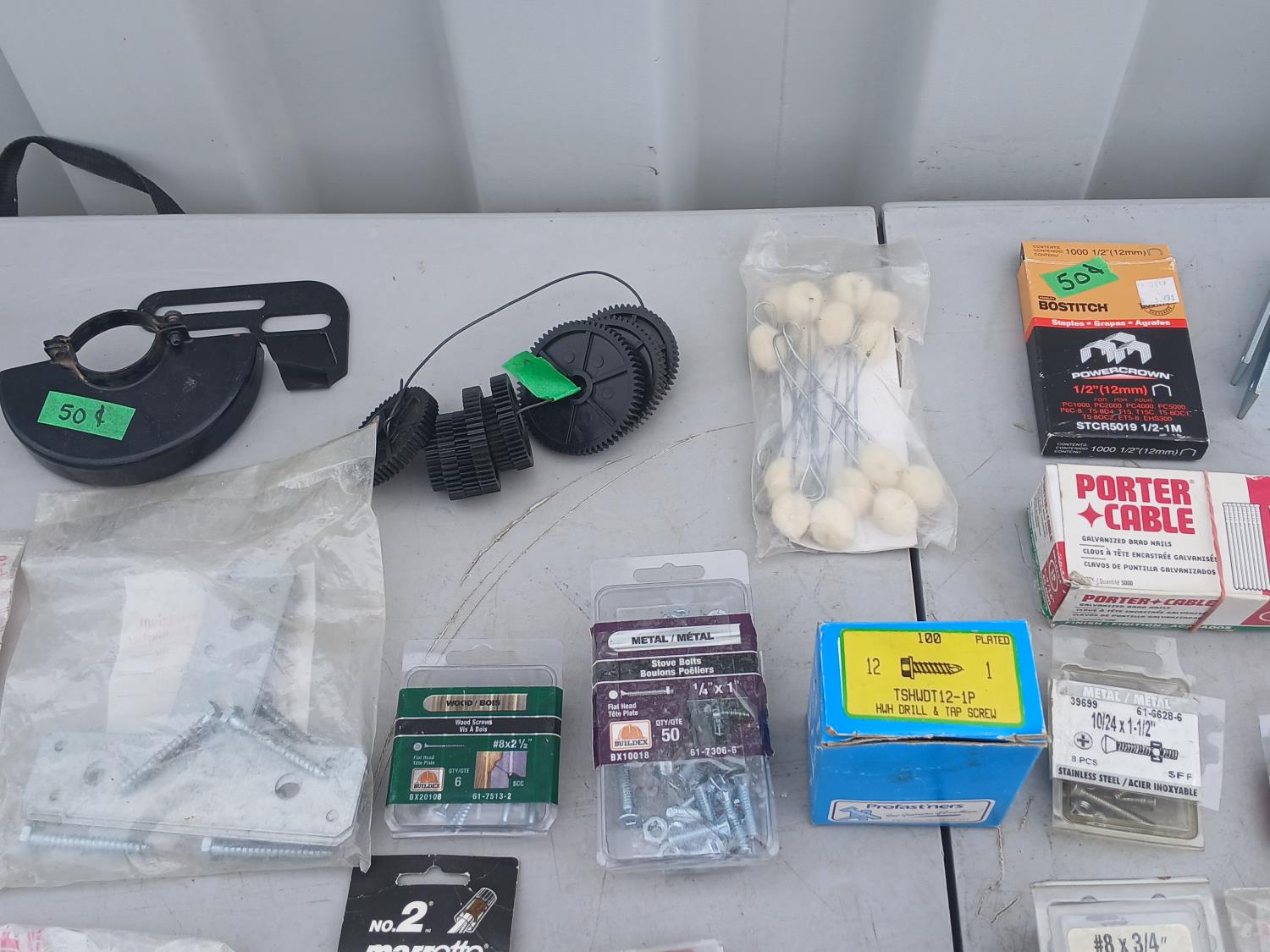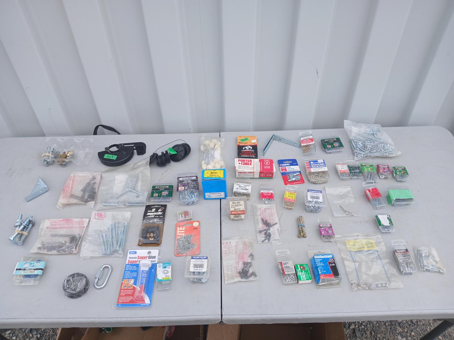 Multiple sized screws, bolts, nuts and washers. Cotter pins, finishing nail, brad nails, plug raccord connectors, L brackets, flat bracket, 4 inch grinder guard, rivets, super glue, marrettes, wall anchors, valves, flints.