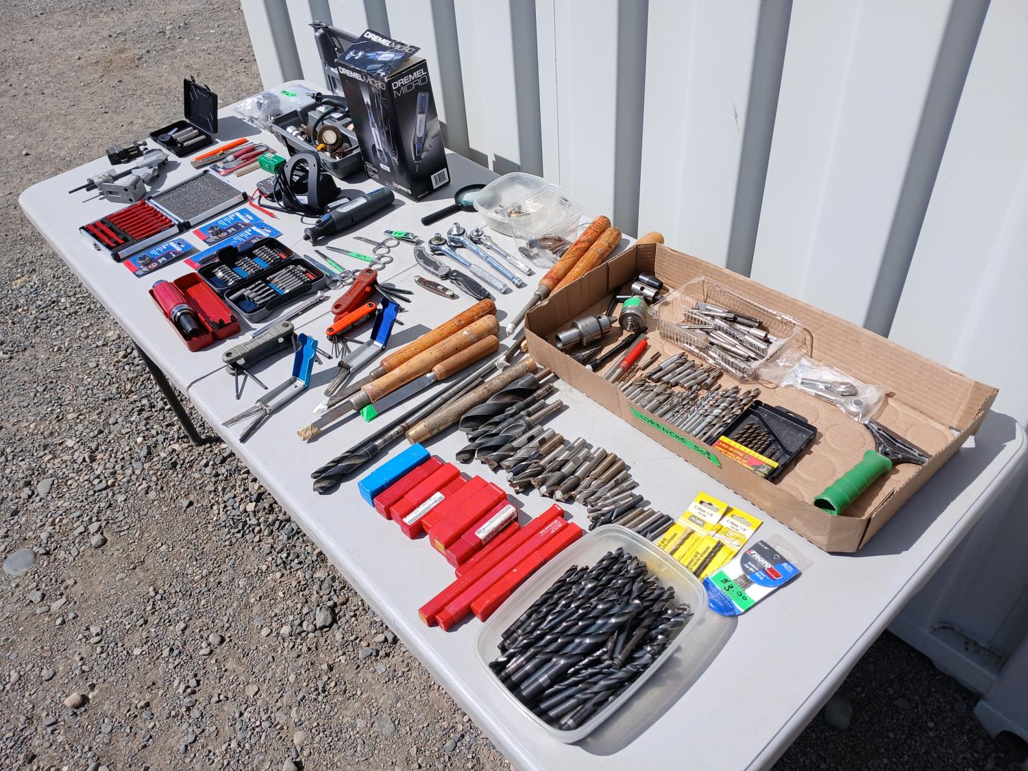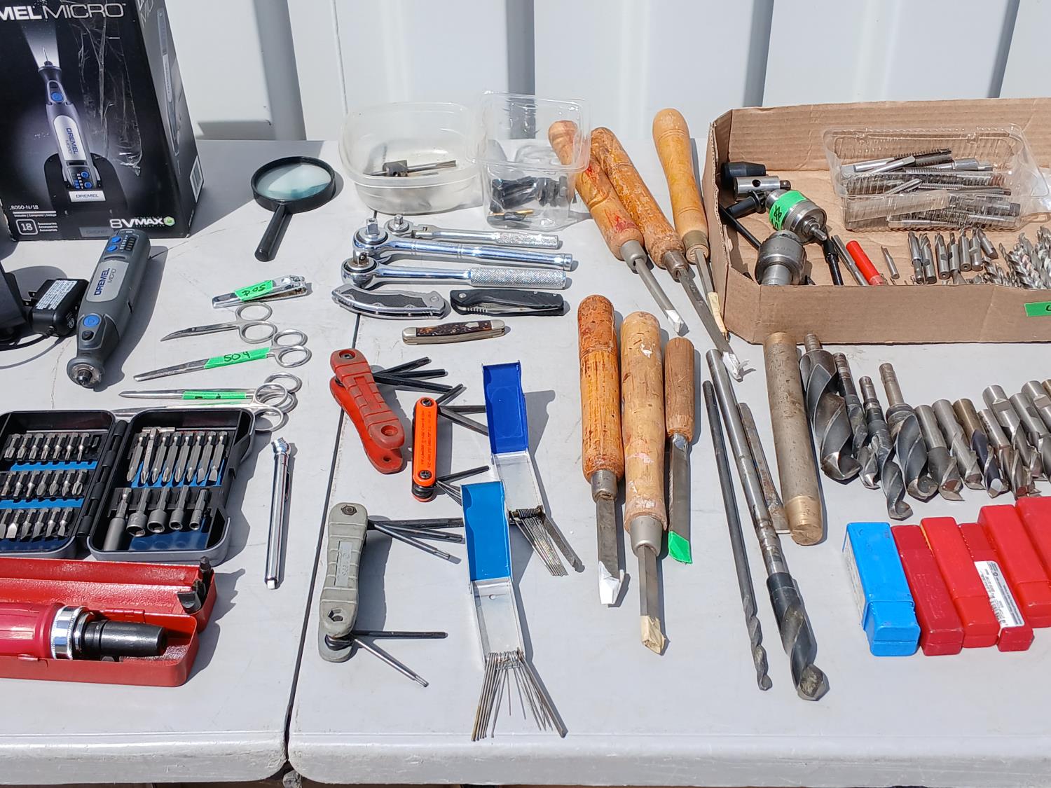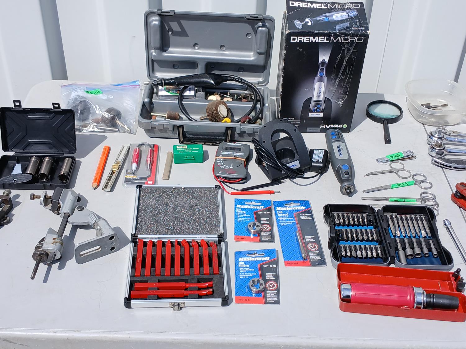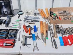 (1) Dremel tool kit with multiple attachments, (1) soap stone marker, (1) carpenters pencil, (1) pocket digital multi reader, (1) cordless micro Dremel tool with charger, (2) Die, (1) Tap, (1) Carbide tipped lathe tool bit set, (1) grinder drill attachment, (1) small multi purpose vise, (1) firearm choke tube set, (4) various trimmers, (1) magnifying glass, various screw driver bits, (3) Allen key hand tools, (2) Carburetor cleaning tools, (3) pocket knives, (6) piece wood handled chisels, large variety of drill bits, (1) heavy duty multi head screw driver with bits, (1) screw driver bit and socket set, (1) air pressure gauge.