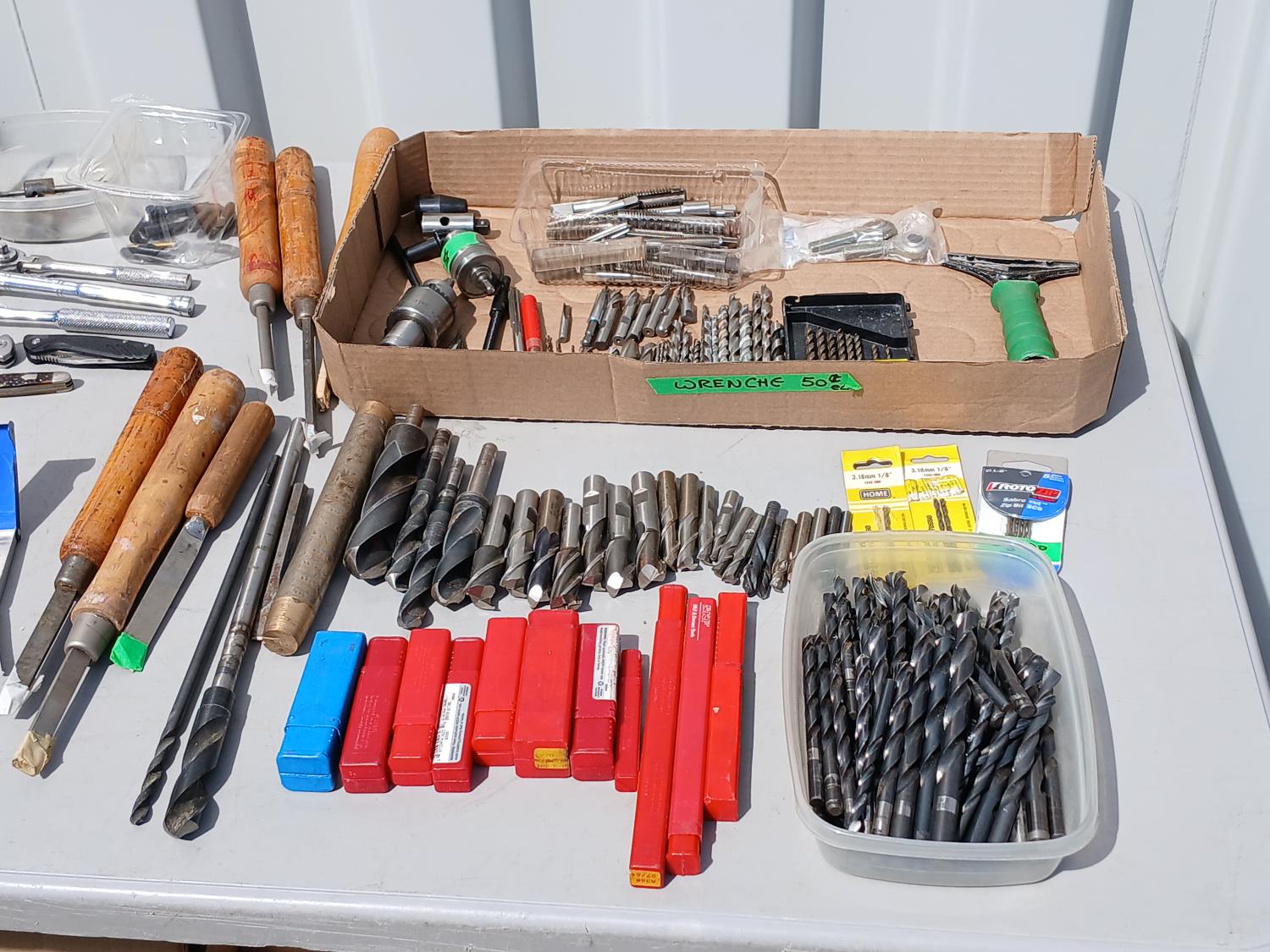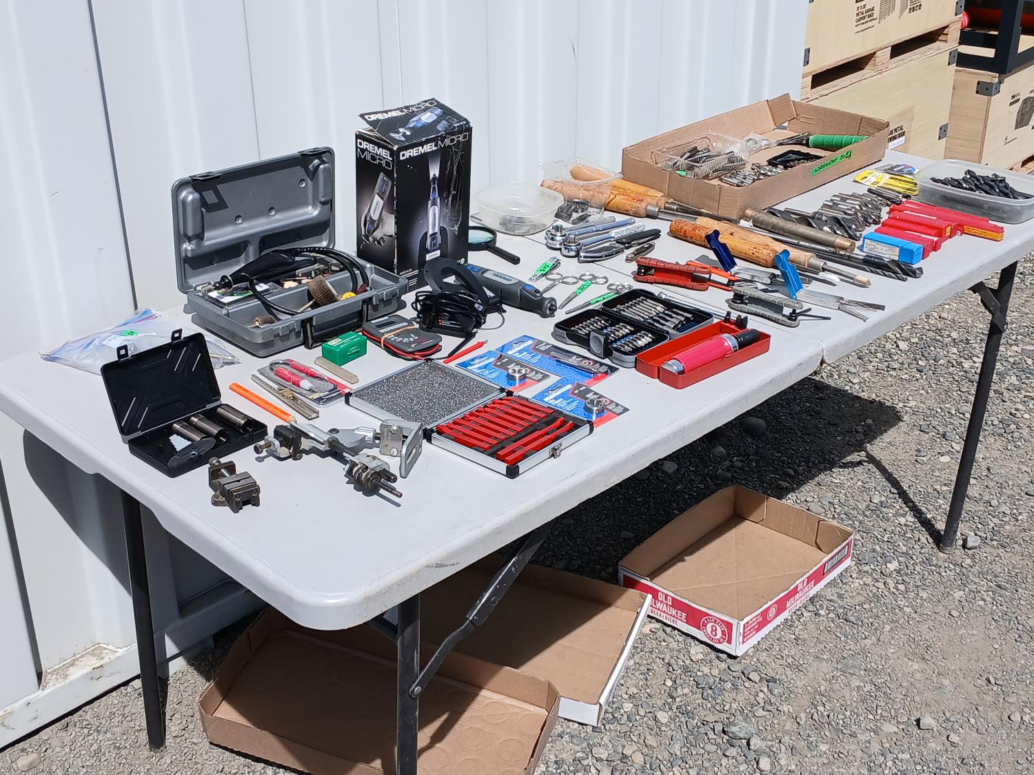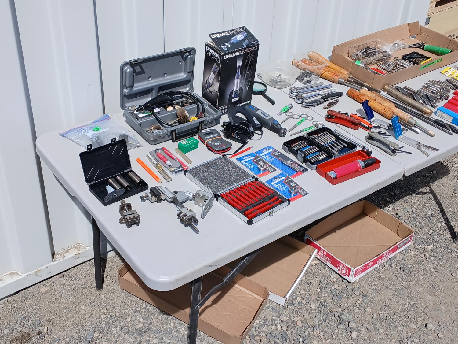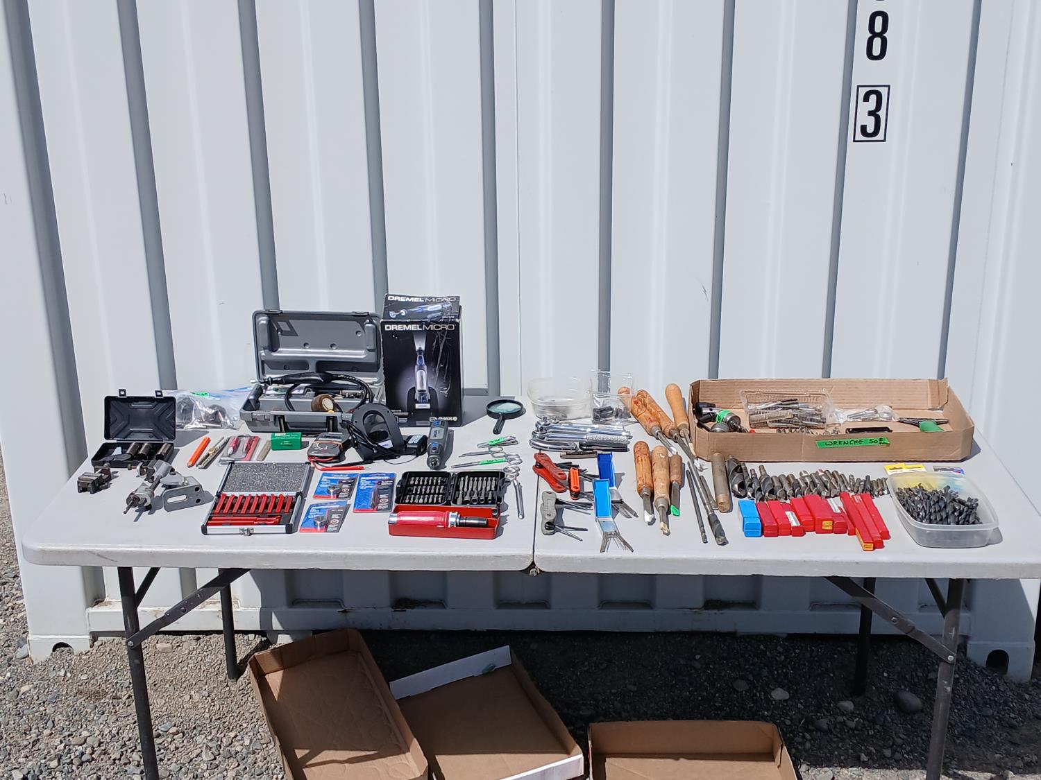 (1) Dremel tool kit with multiple attachments, (1) soap stone marker, (1) carpenters pencil, (1) pocket digital multi reader, (1) cordless micro Dremel tool with charger, (2) Die, (1) Tap, (1) Carbide tipped lathe tool bit set, (1) grinder drill attachment, (1) small multi purpose vise, (1) firearm choke tube set, (4) various trimmers, (1) magnifying glass, various screw driver bits, (3) Allen key hand tools, (2) Carburetor cleaning tools, (3) pocket knives, (6) piece wood handled chisels, large variety of drill bits, (1) heavy duty multi head screw driver with bits, (1) screw driver bit and socket set, (1) air pressure gauge.
