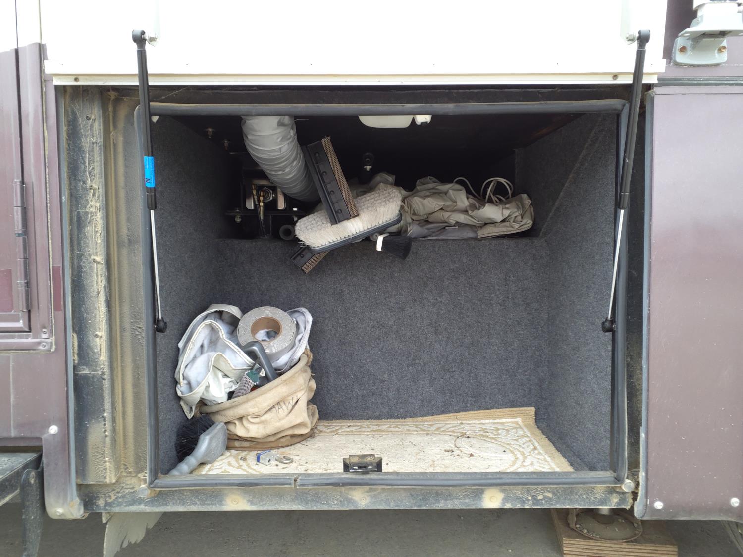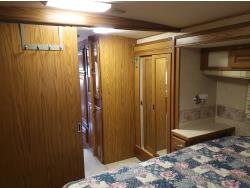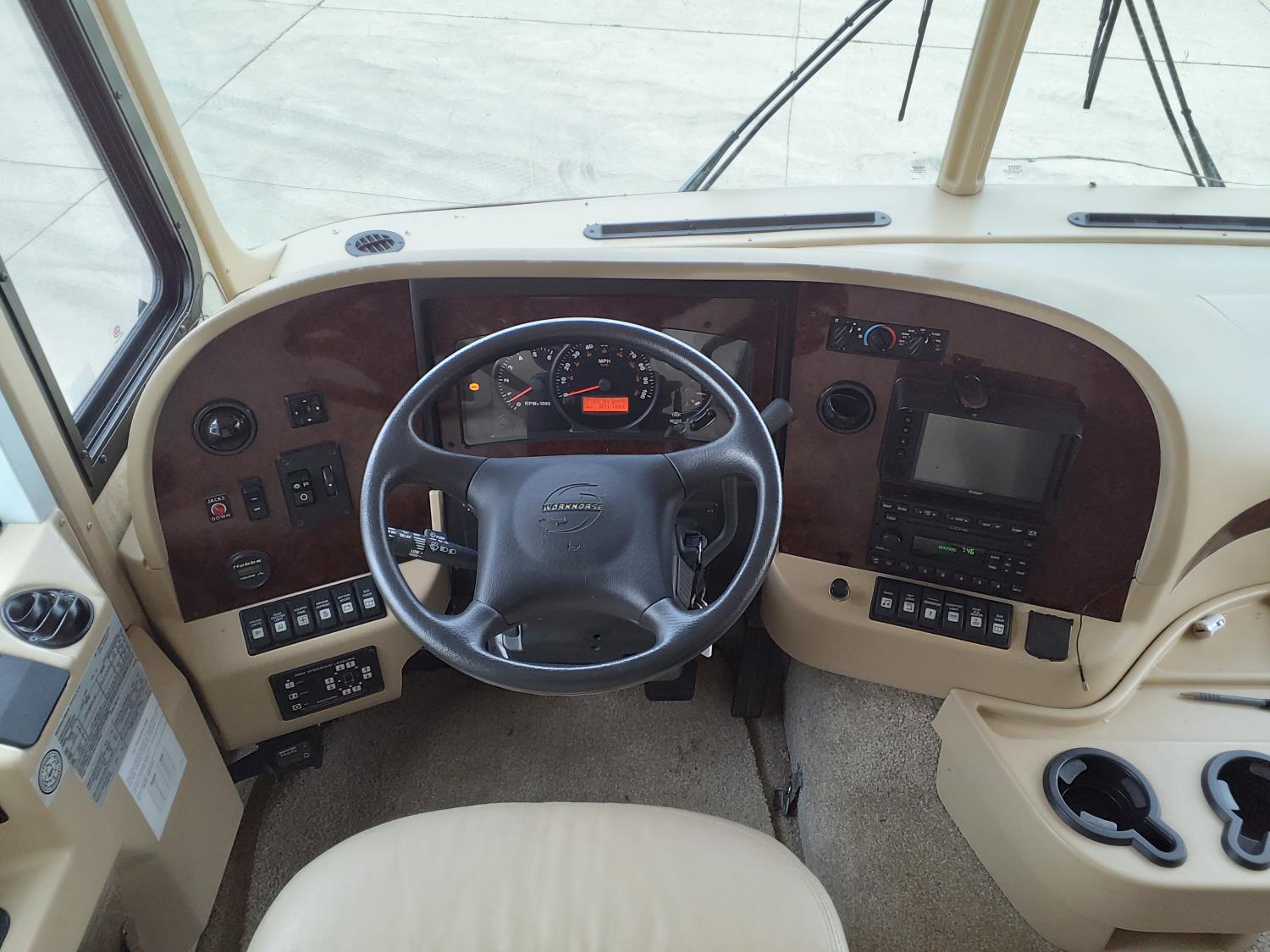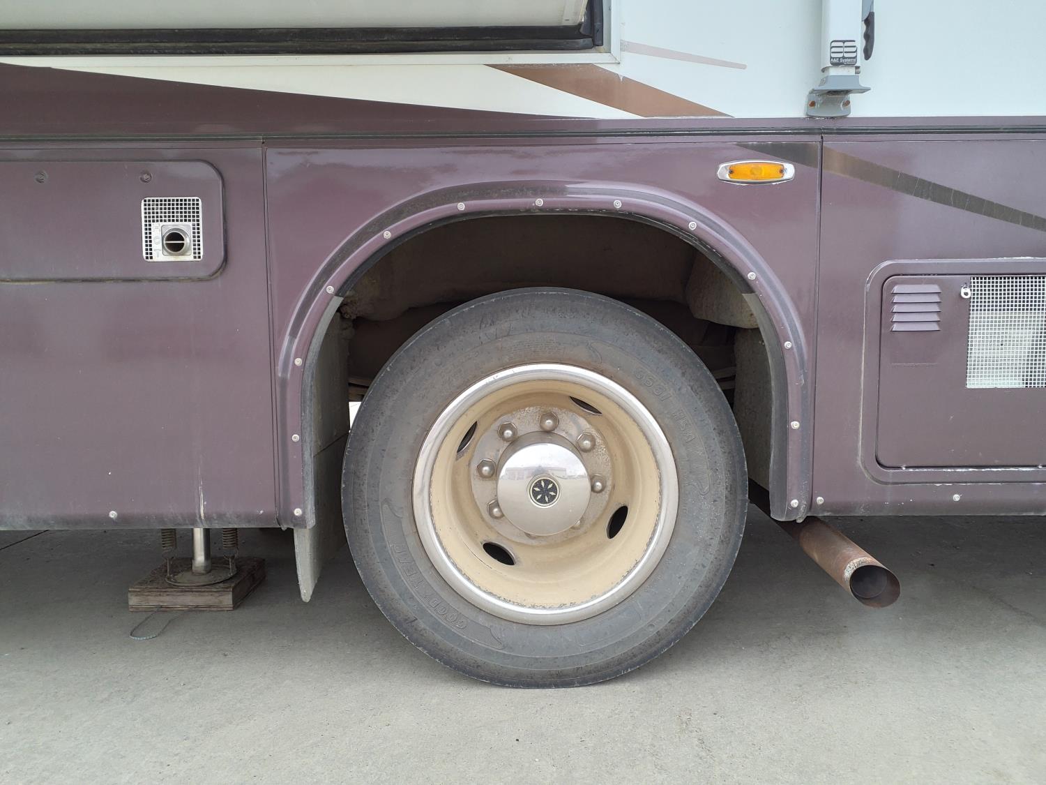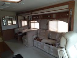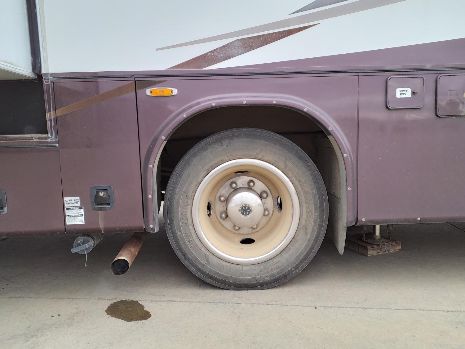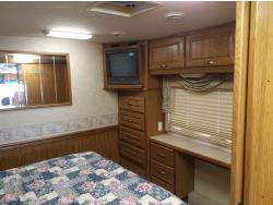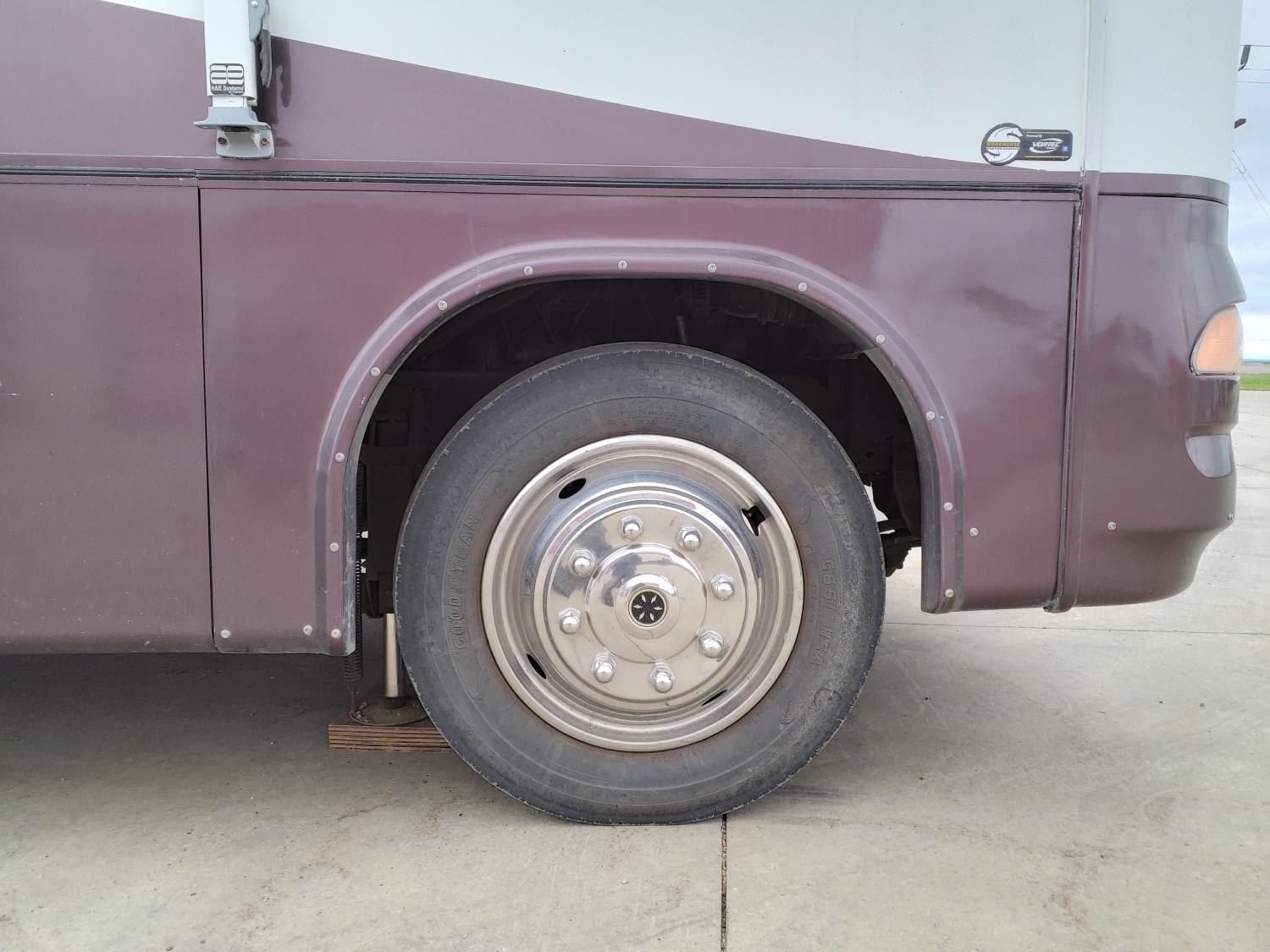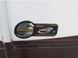 2 slides, 3 awnings, bathroom, hydraulic leveling/stabilizers, kitchen/kitchenette, passenger seats, roof A/C, CD Player, GVWR 22000 lb. fresh water capacity 74 gallon, hot water capacity 10 gallon, Queen bed, central vac with attachments, engine 8.1 L Vortec, transmission automatic drive, rear wheel drive, color white with maroon, Onan gas generator