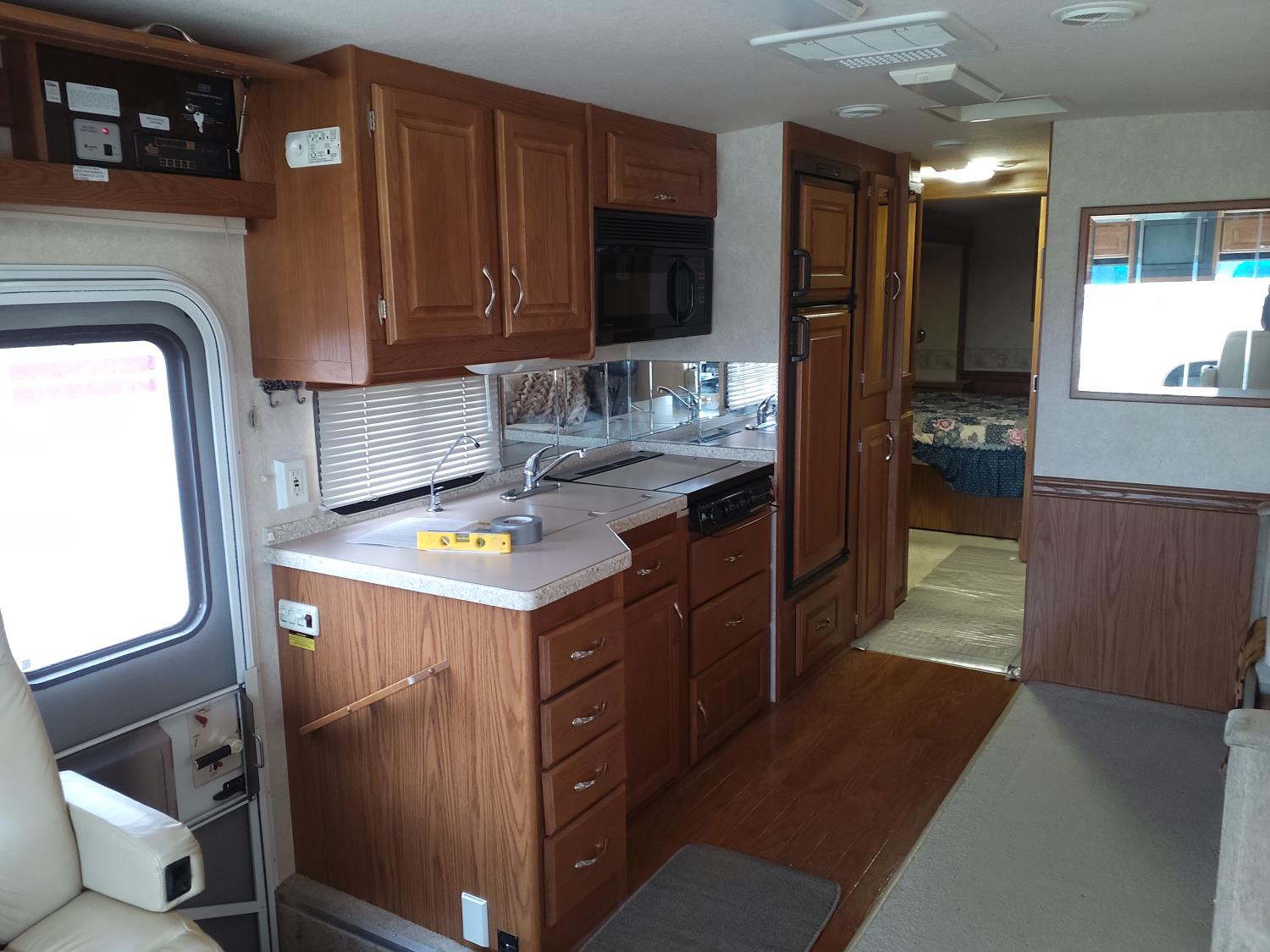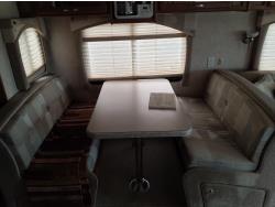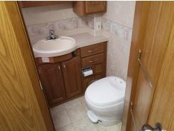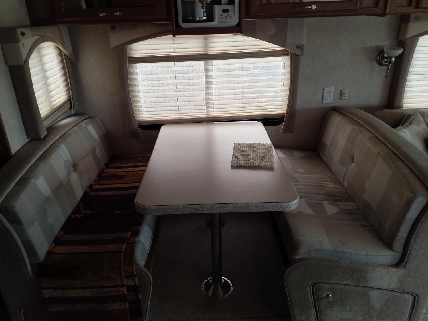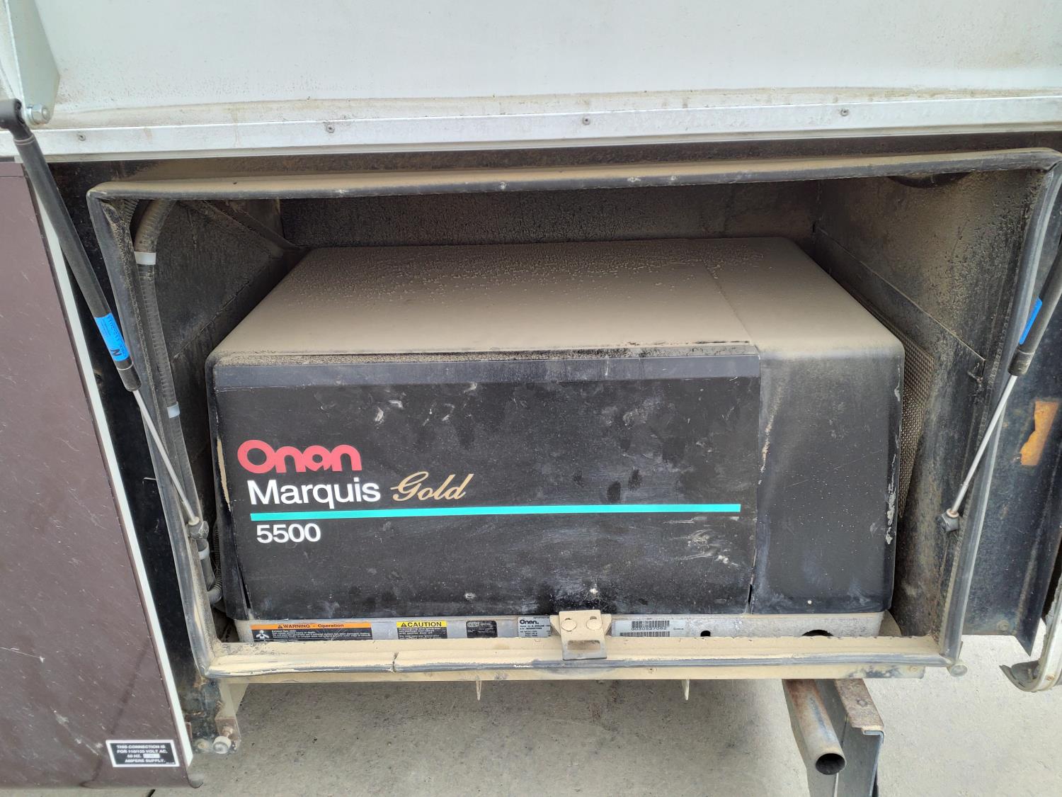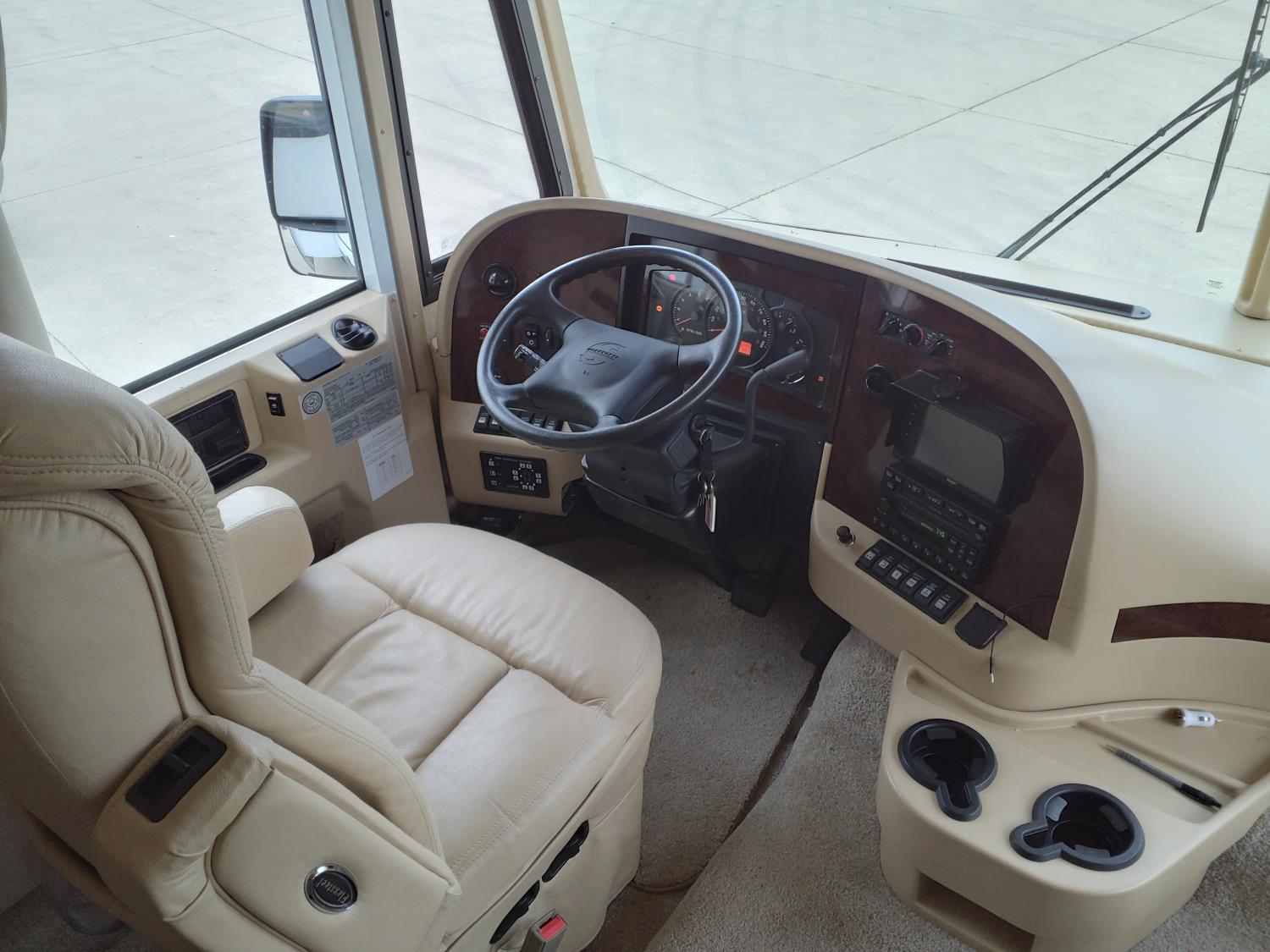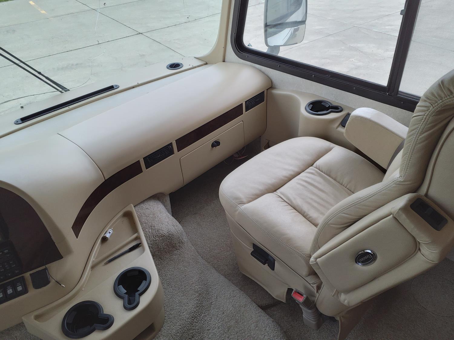 2 slides, 3 awnings, bathroom, hydraulic leveling/stabilizers, kitchen/kitchenette, passenger seats, roof A/C, CD Player, GVWR 22000 lb. fresh water capacity 74 gallon, hot water capacity 10 gallon, Queen bed, central vac with attachments, engine 8.1 L Vortec, transmission automatic drive, rear wheel drive, color white with maroon, Onan gas generator