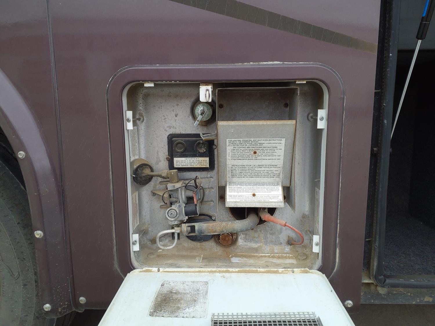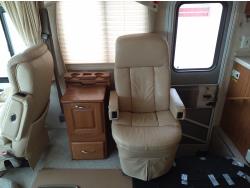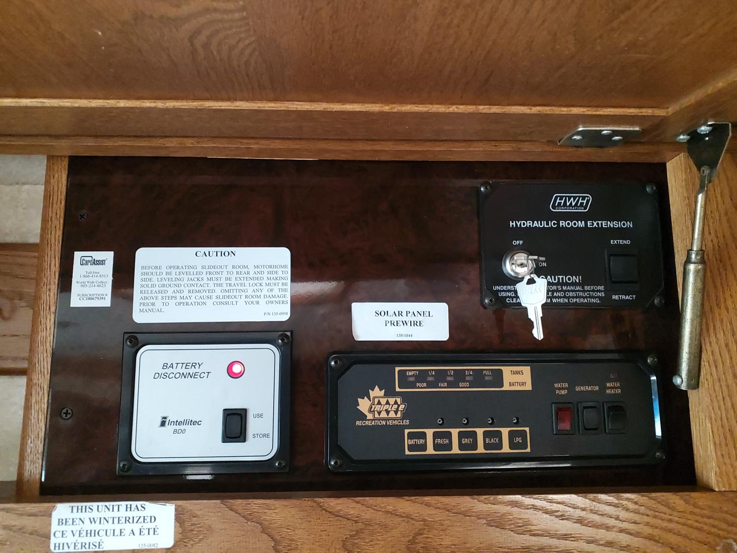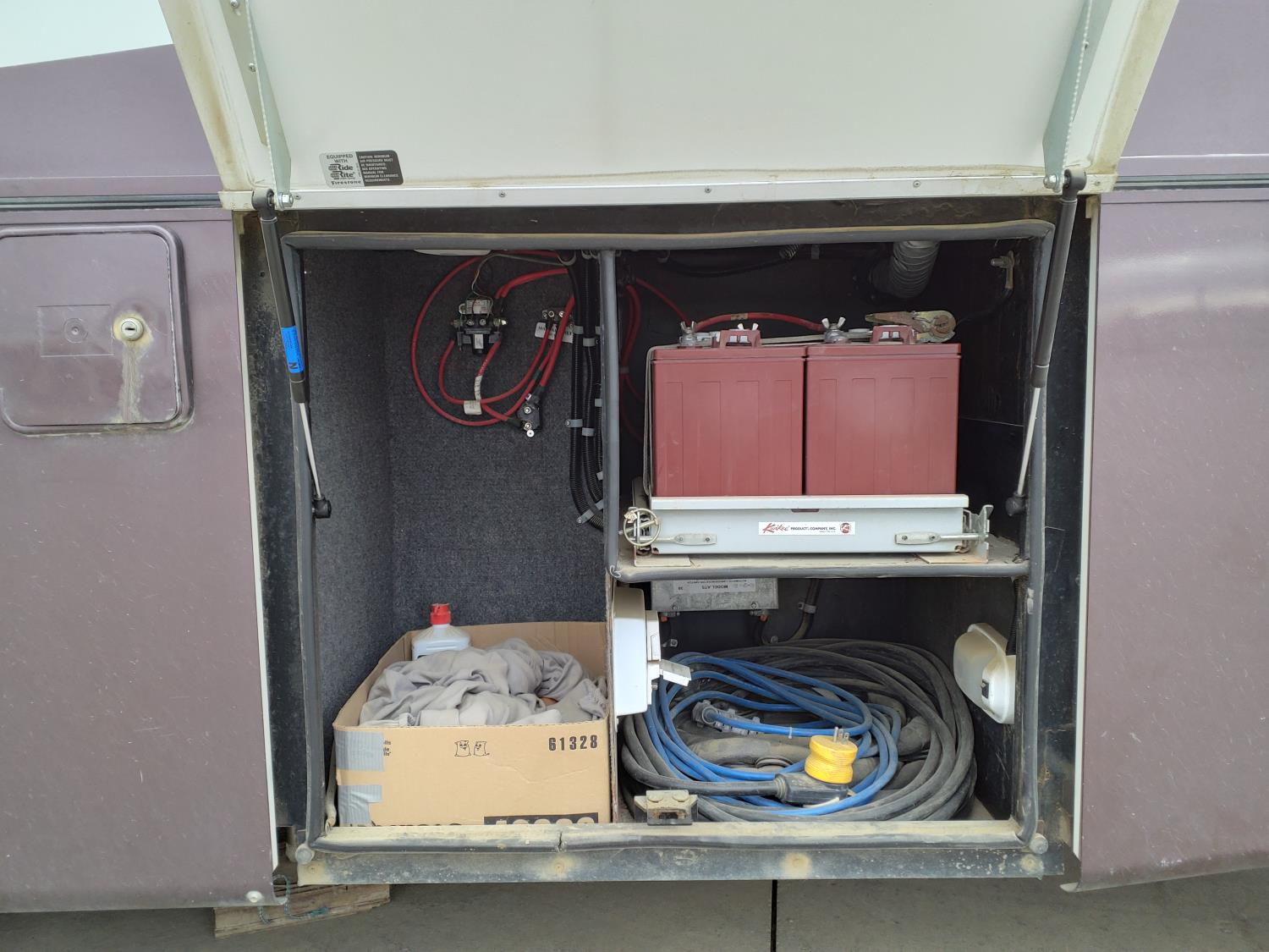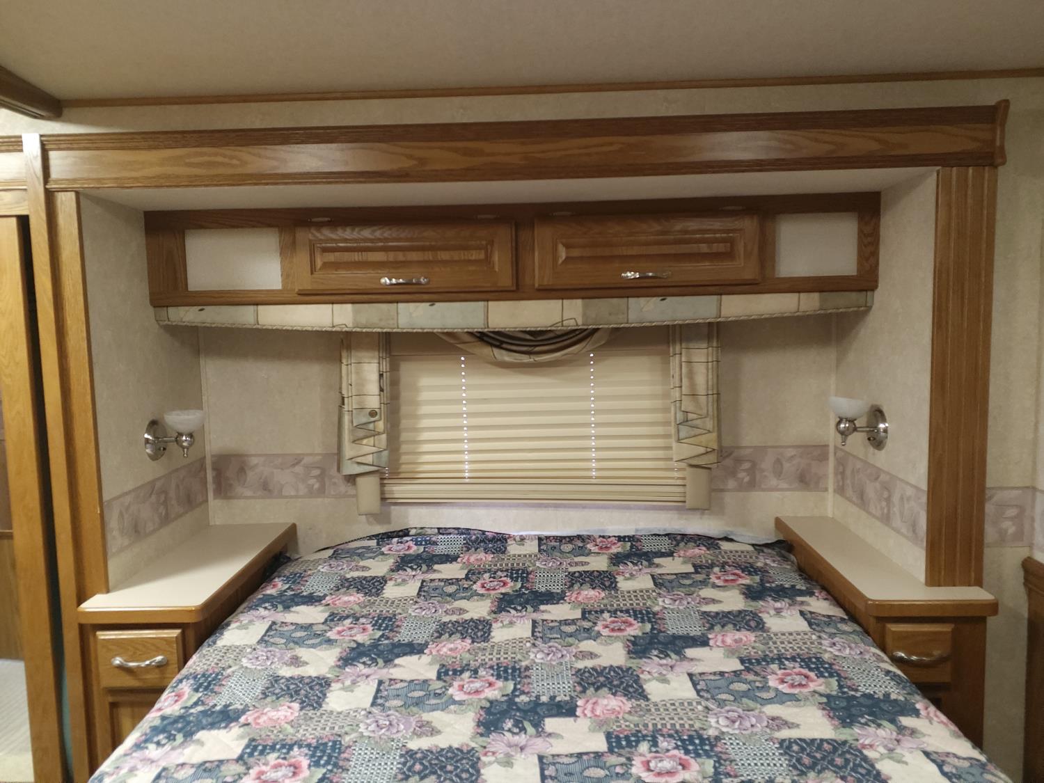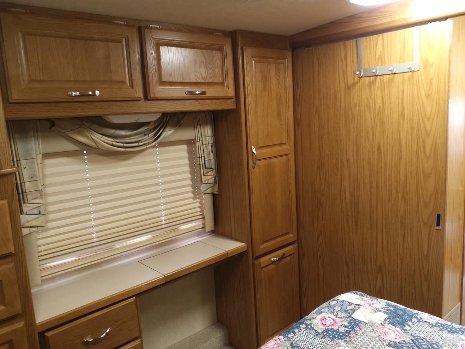 2 slides, 3 awnings, bathroom, hydraulic leveling/stabilizers, kitchen/kitchenette, passenger seats, roof A/C, CD Player, GVWR 22000 lb. fresh water capacity 74 gallon, hot water capacity 10 gallon, Queen bed, central vac with attachments, engine 8.1 L Vortec, transmission automatic drive, rear wheel drive, color white with maroon, Onan gas generator