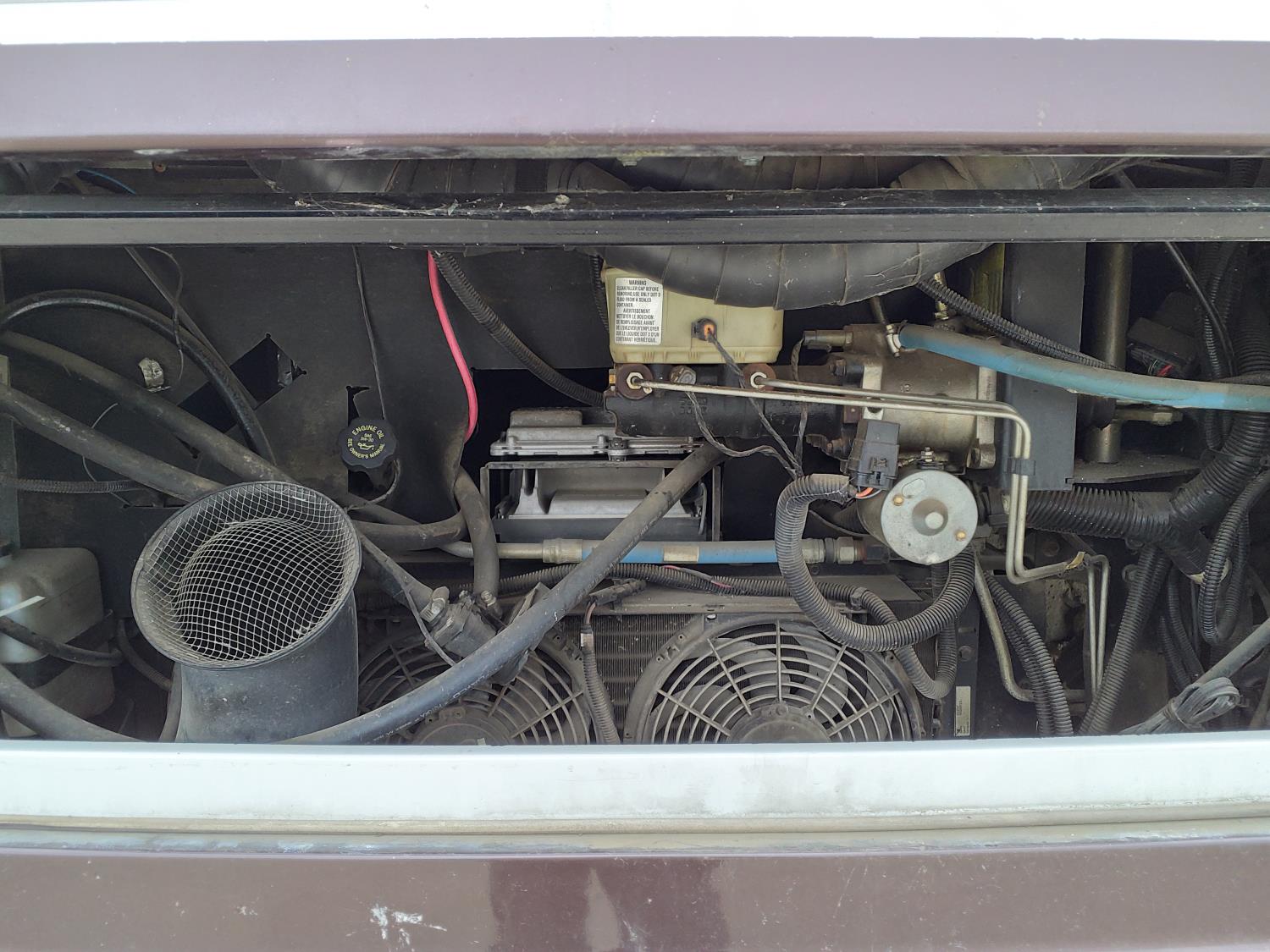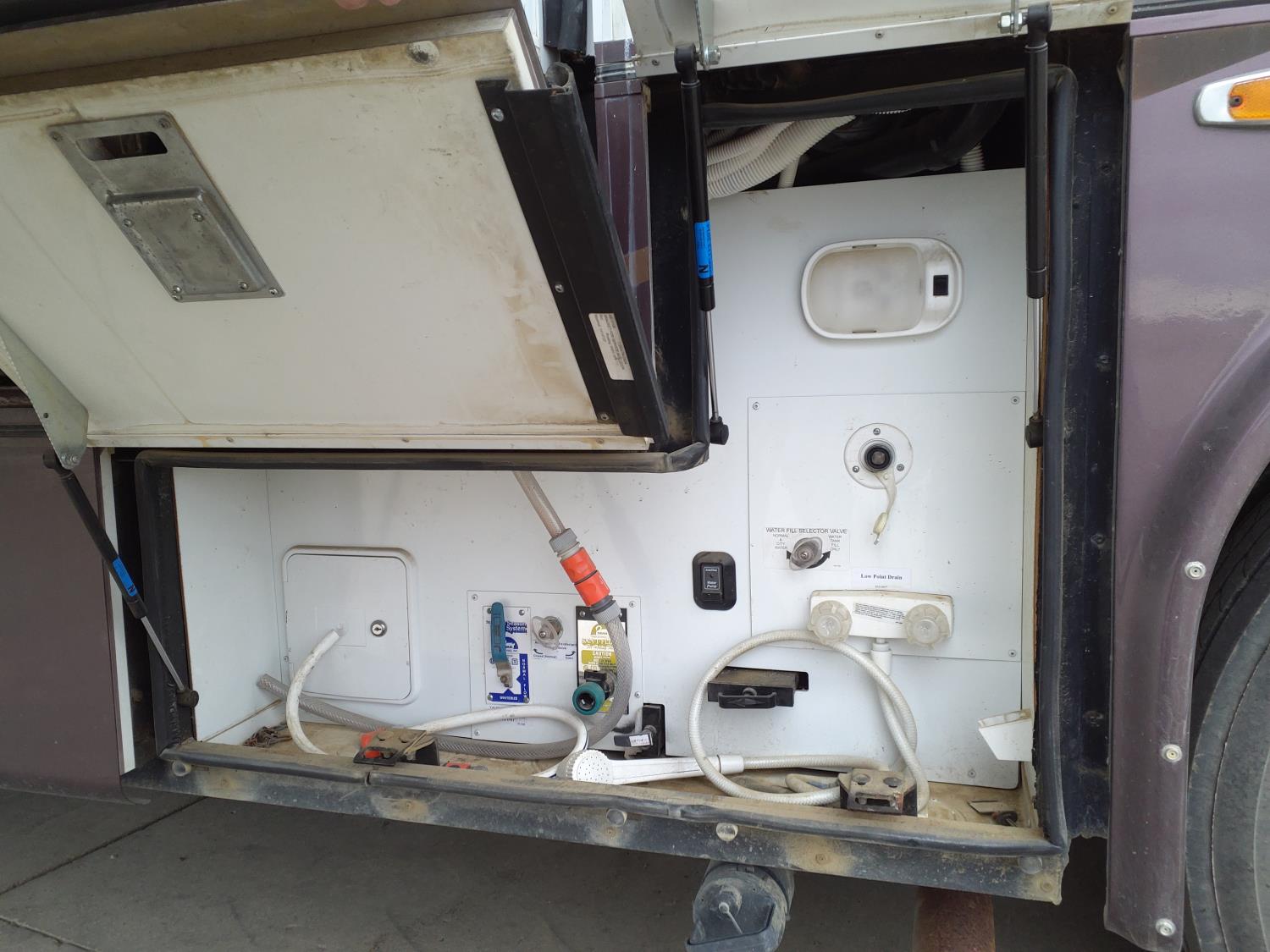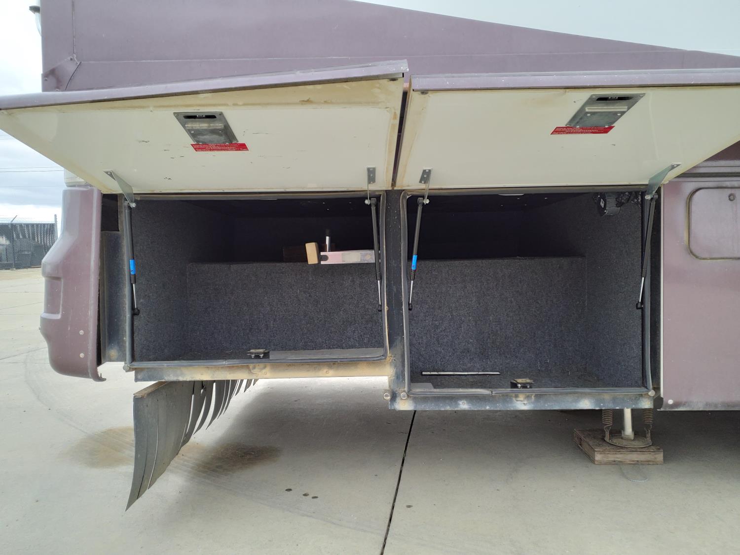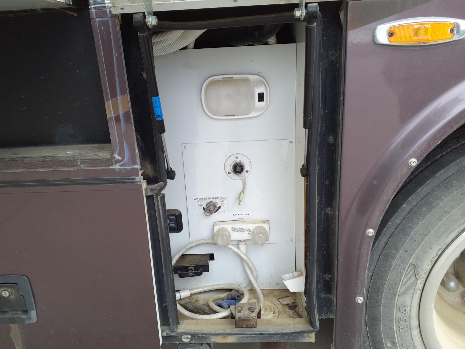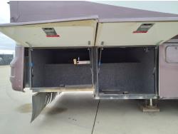2 slides, 3 awnings, bathroom, hydraulic leveling/stabilizers, kitchen/kitchenette, passenger seats, roof A/C, CD Player, GVWR 22000 lb. fresh water capacity 74 gallon, hot water capacity 10 gallon, Queen bed, central vac with attachments, engine 8.1 L Vortec, transmission automatic drive, rear wheel drive, color white with maroon, Onan gas generator