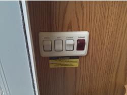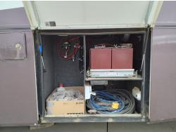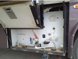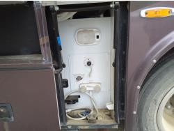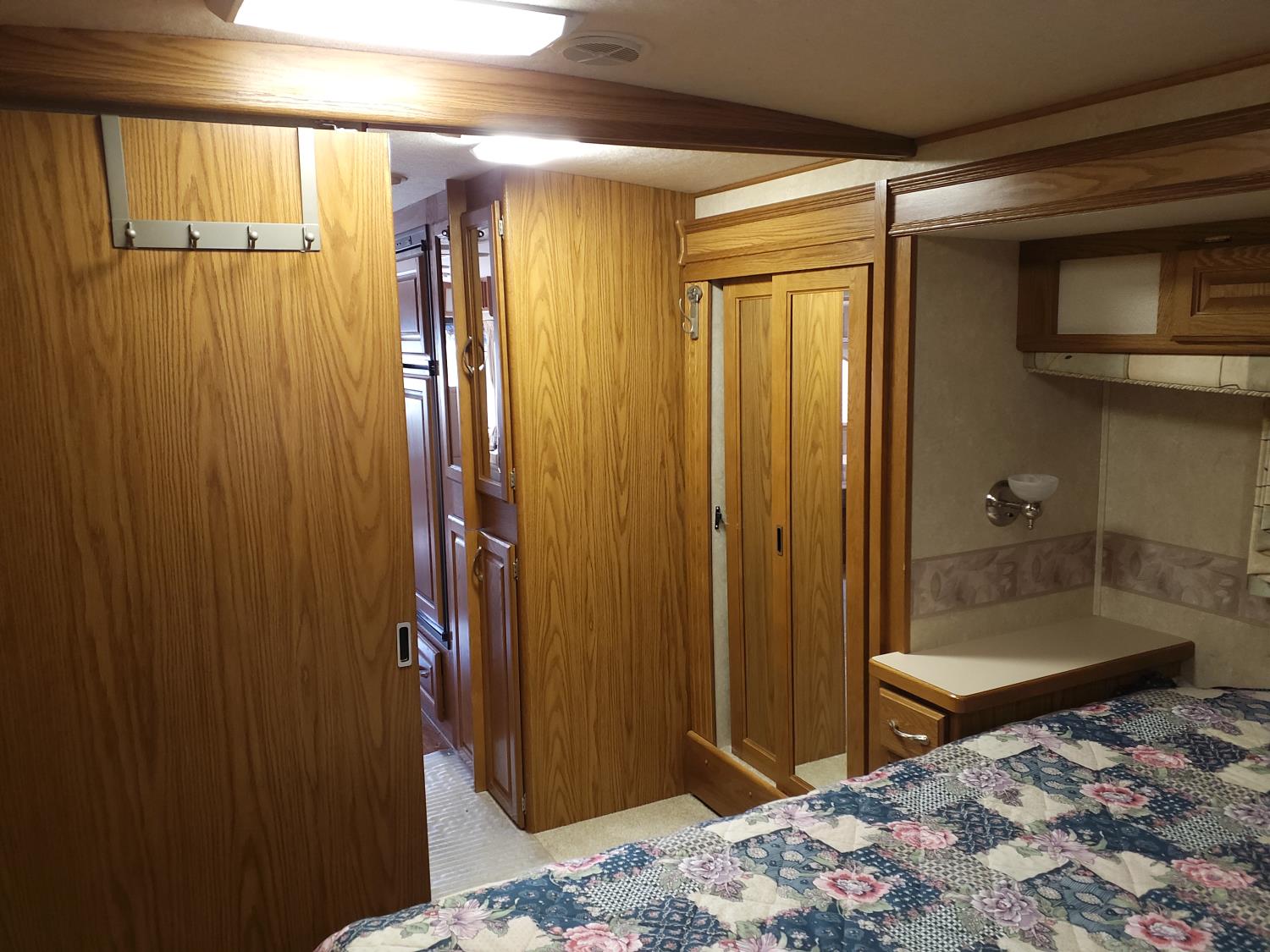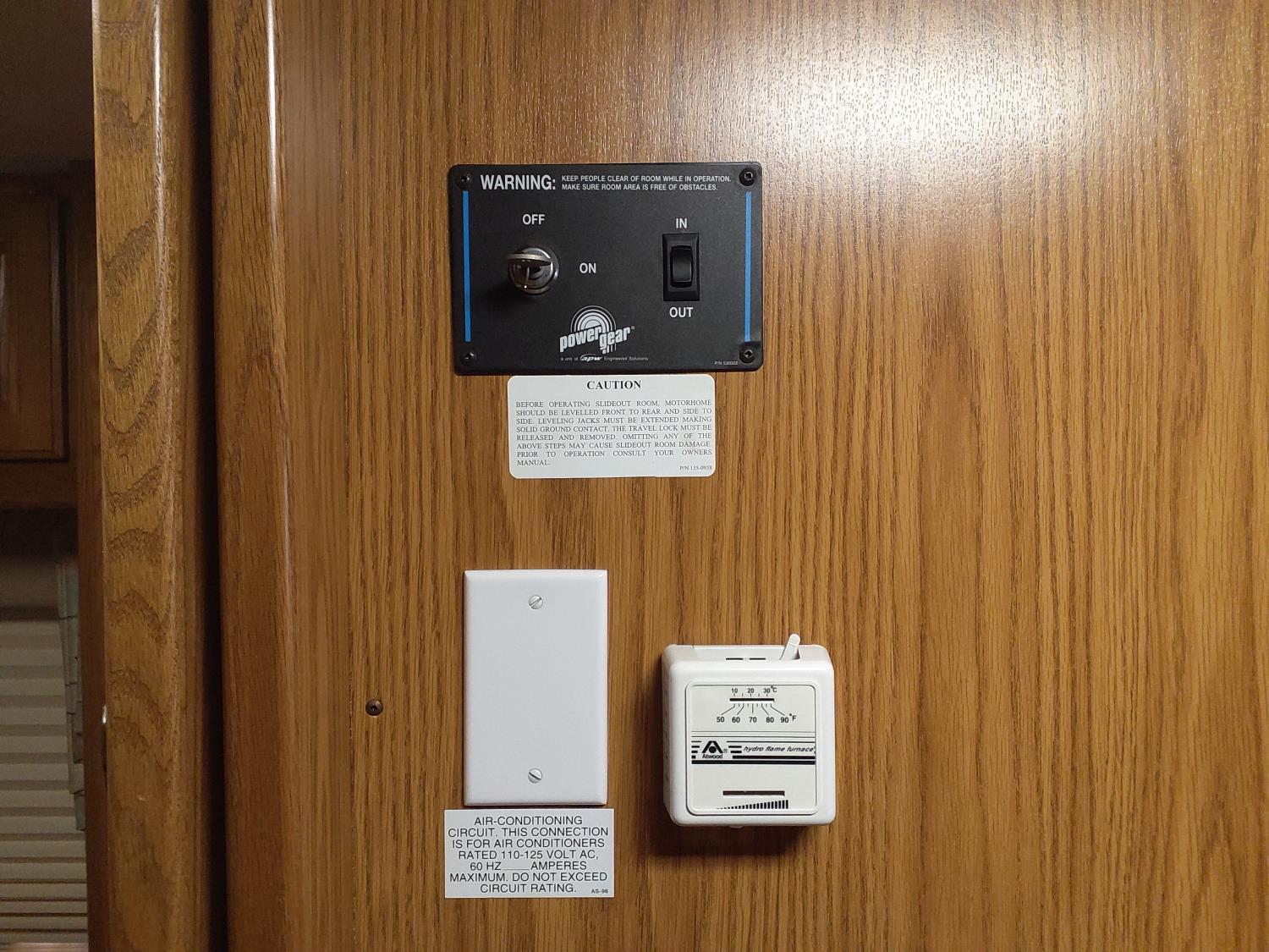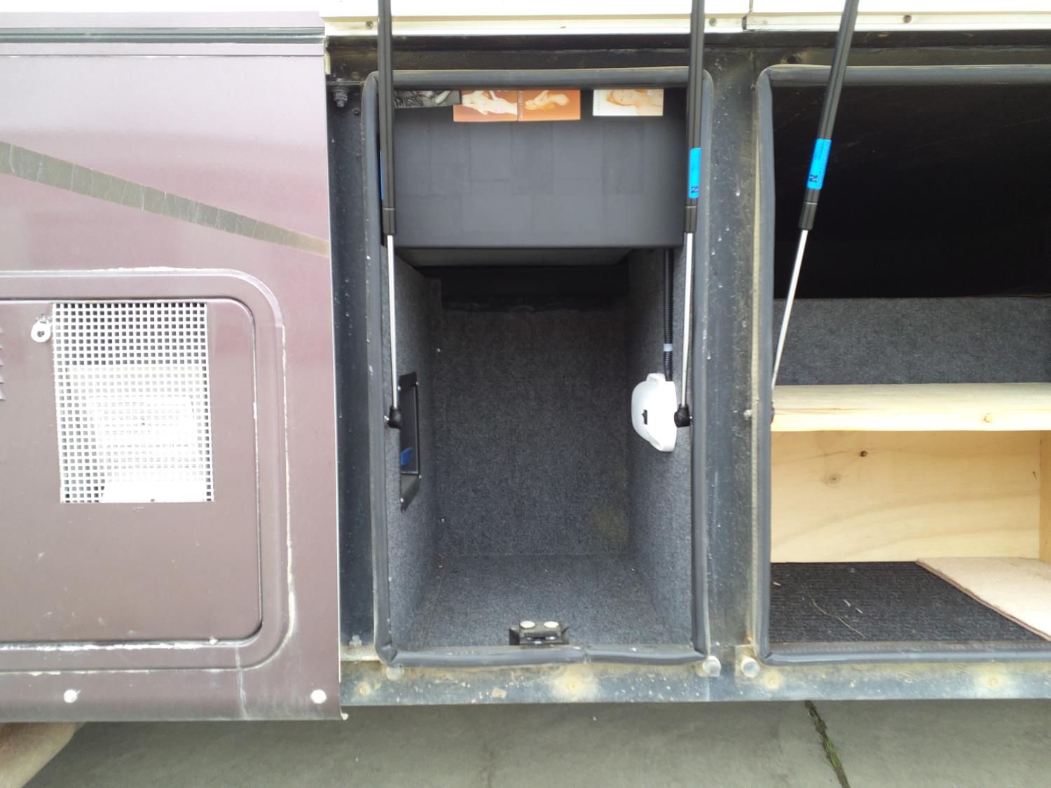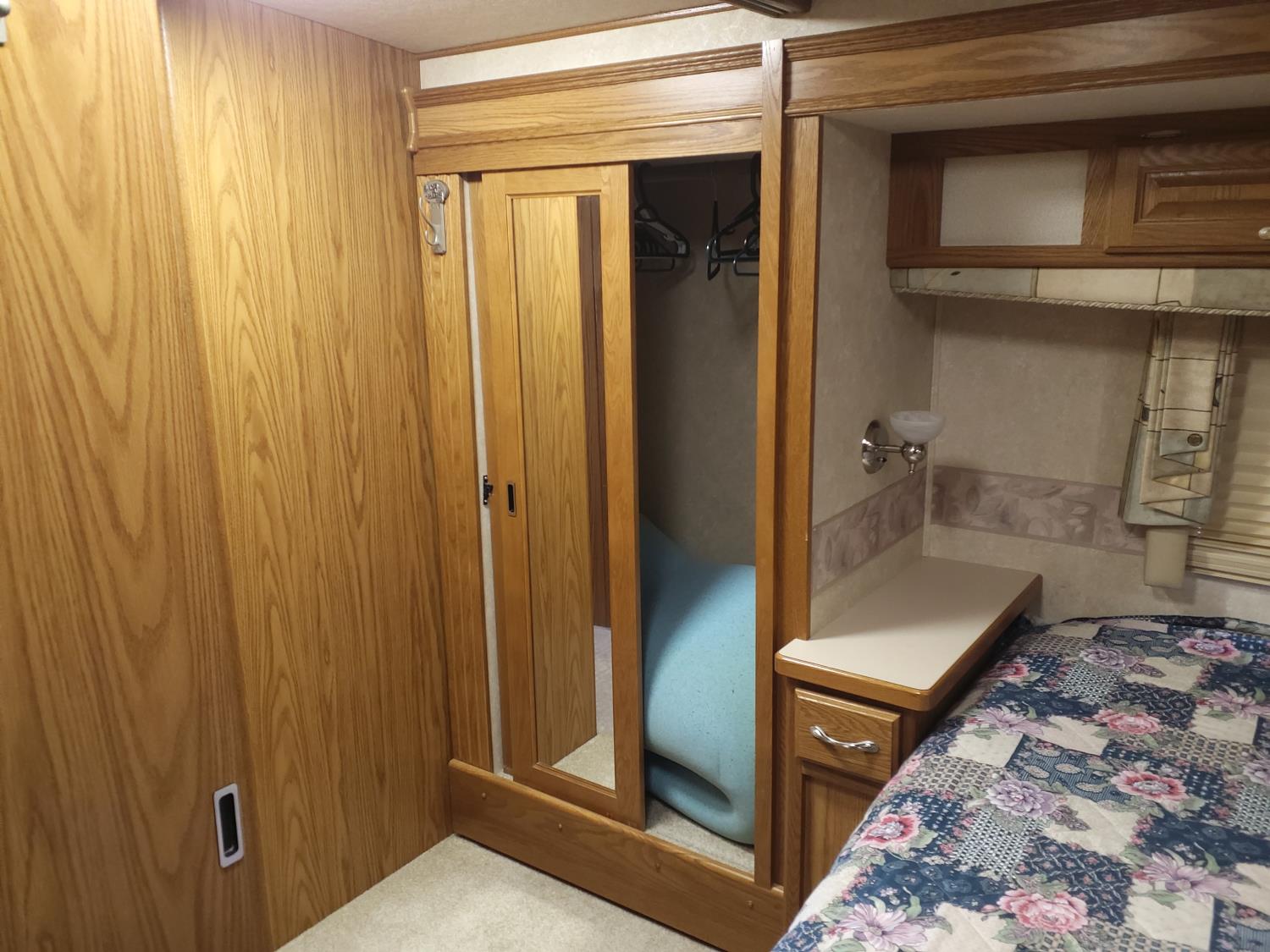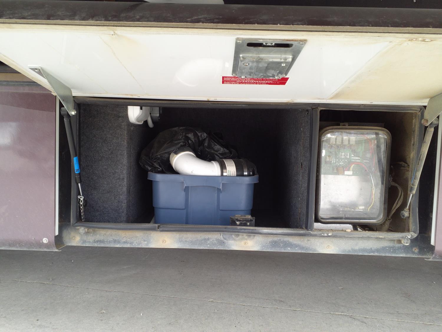 2 slides, 3 awnings, bathroom, hydraulic leveling/stabilizers, kitchen/kitchenette, passenger seats, roof A/C, CD Player, GVWR 22000 lb. fresh water capacity 74 gallon, hot water capacity 10 gallon, Queen bed, central vac with attachments, engine 8.1 L Vortec, transmission automatic drive, rear wheel drive, color white with maroon, Onan gas generator