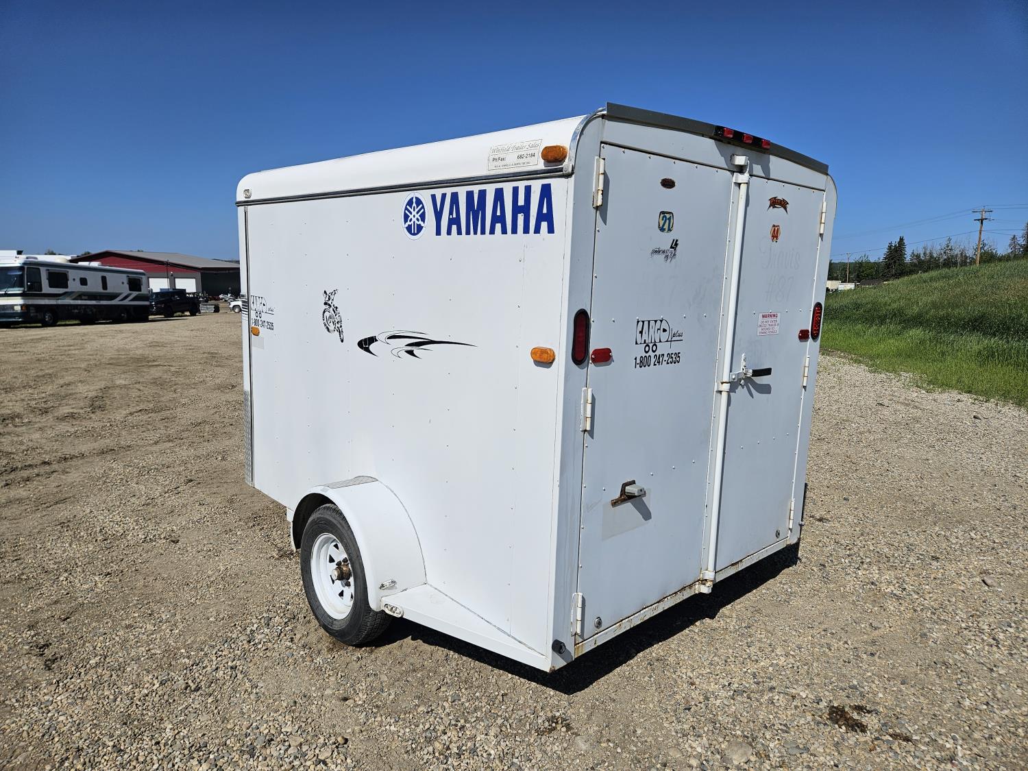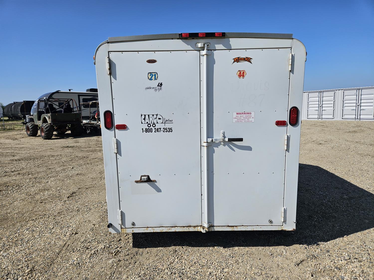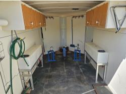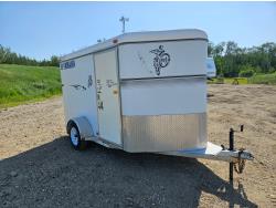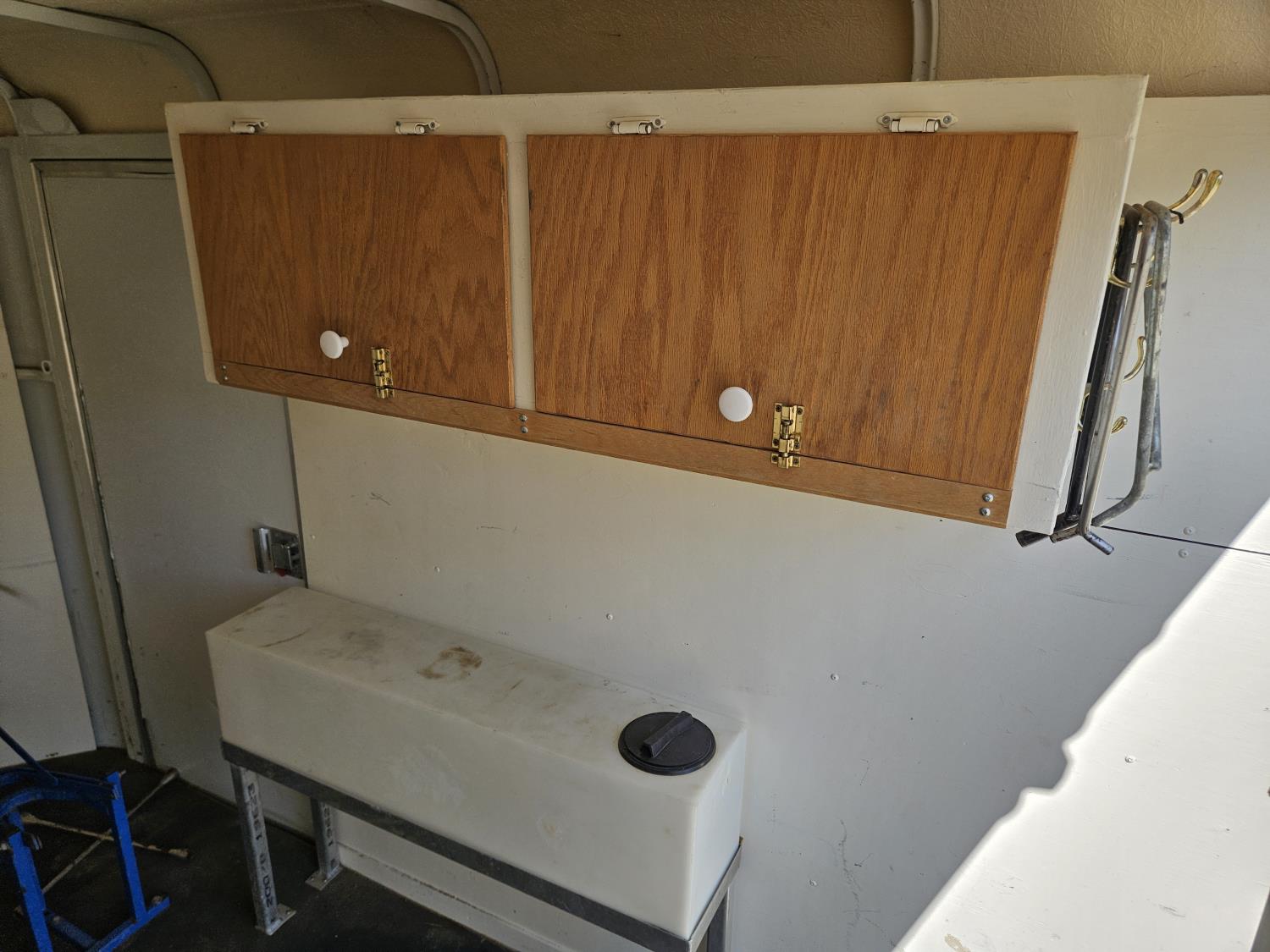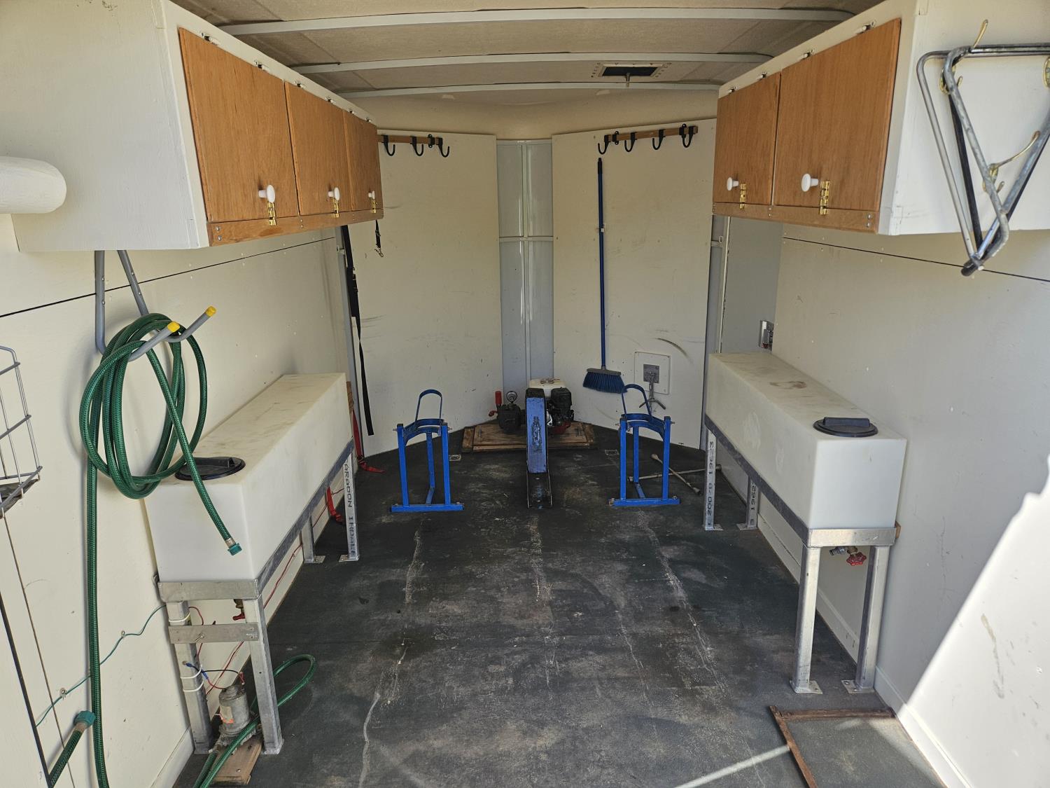 74 inch interior width, 75 inch interior height, ball hitch, side door, barn doors, spring suspension, set up for hauling motorbikes, shelving, pressure washer, tanks, wheel chocks, new tires and rims, 205/75R14 tires