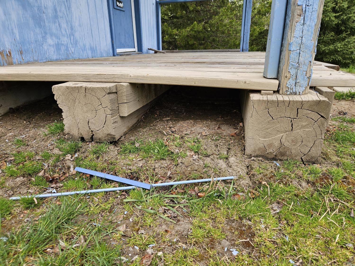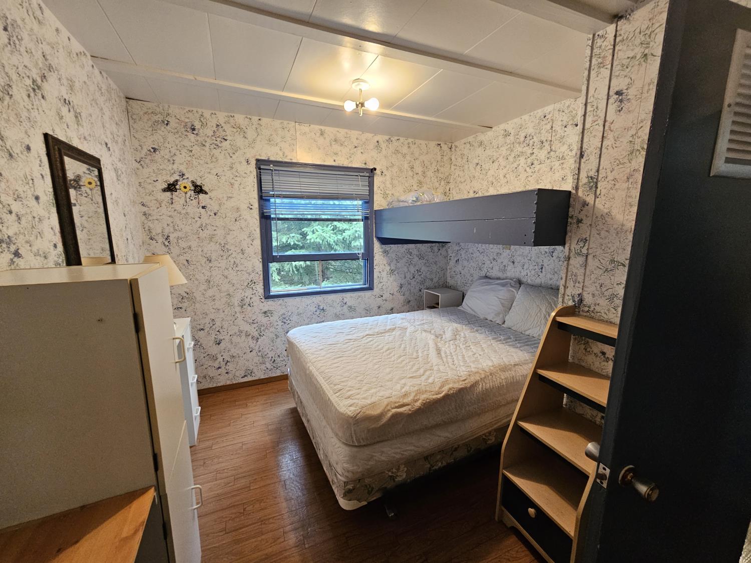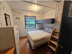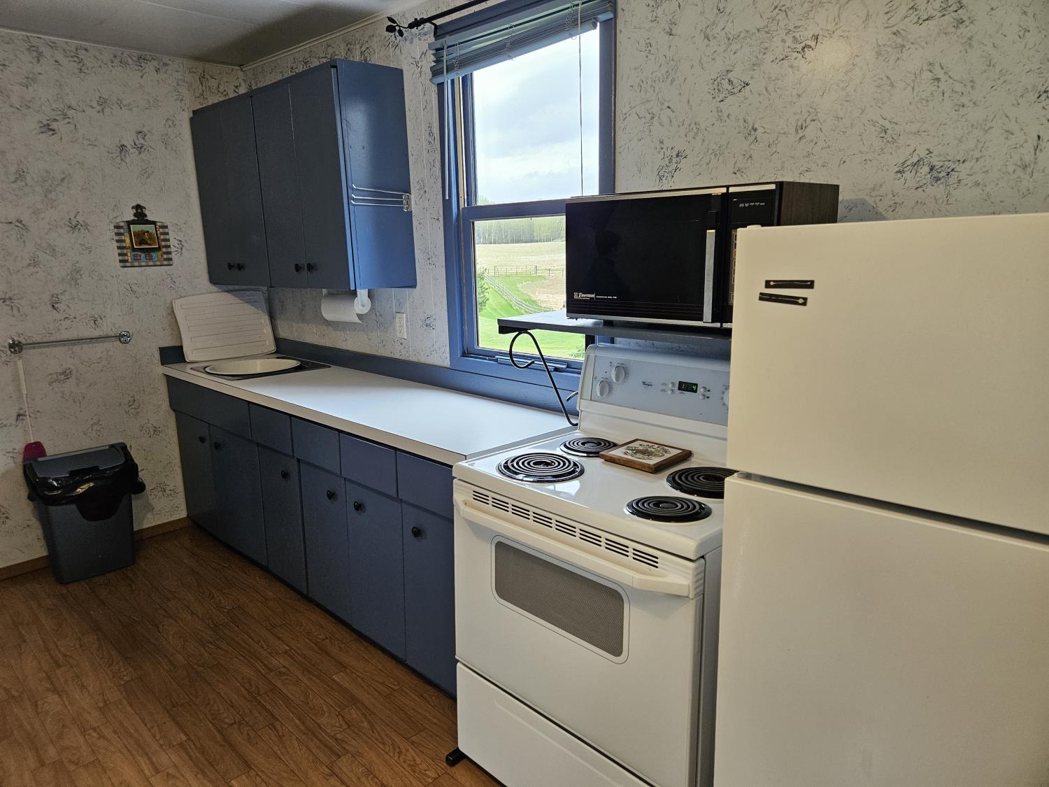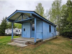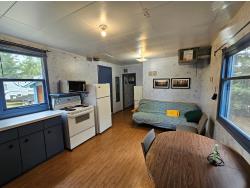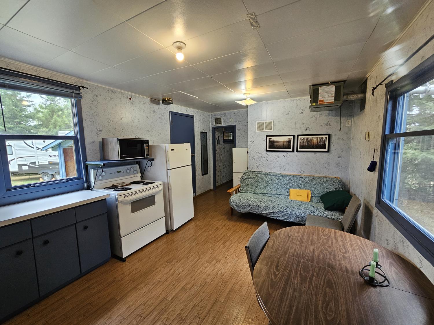 On 12 inch x 12 inch skids, fully wired, sleeps 5, appliances & furniture come with cabin, fridge is excluded.