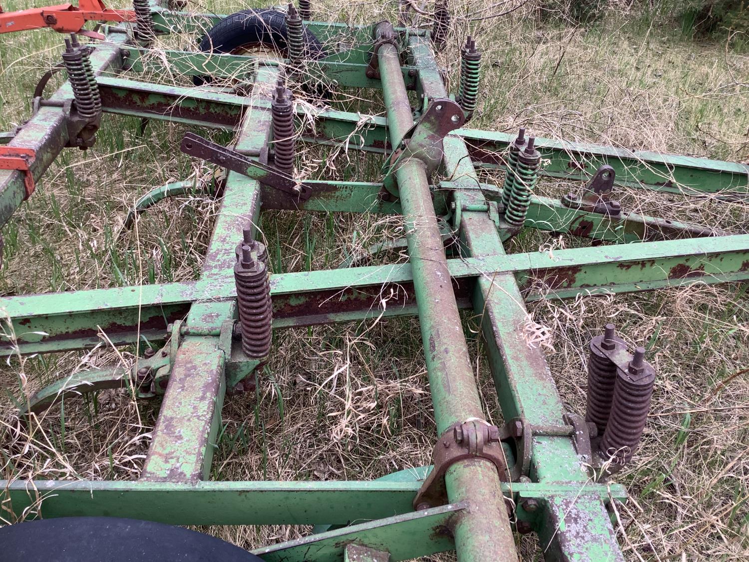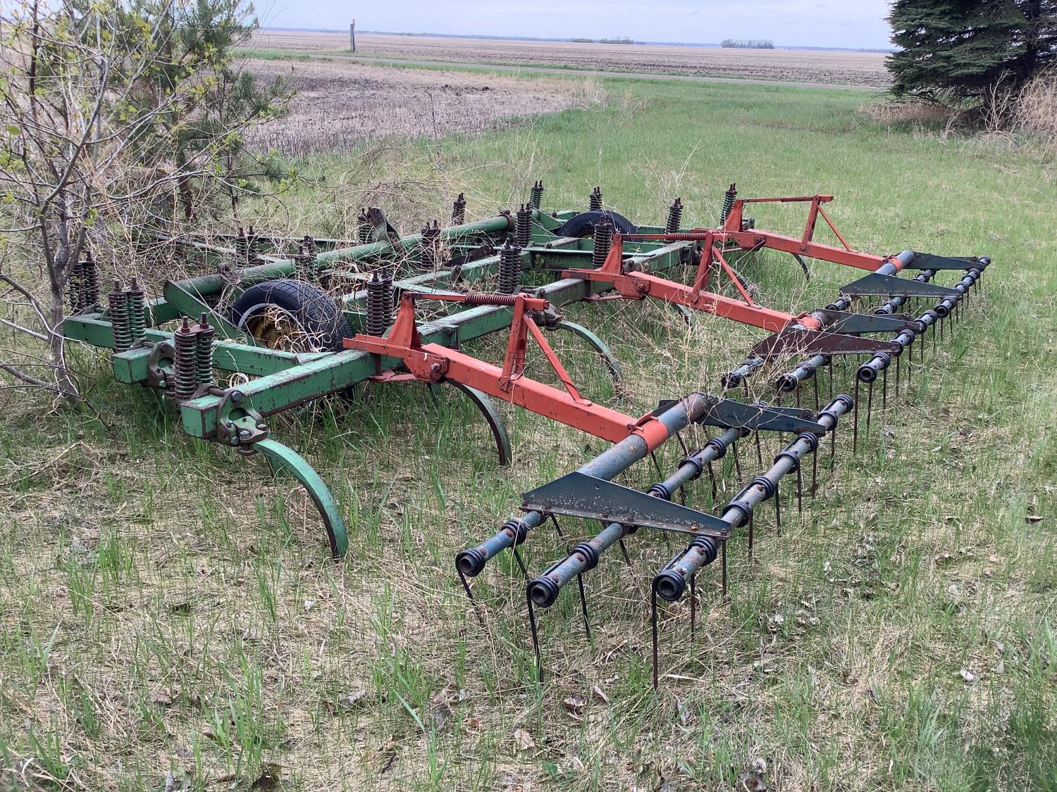 The cultivator will be moved and locked in transport before the sale. Note tires are old. This deep tillage cultivator is in good shape.