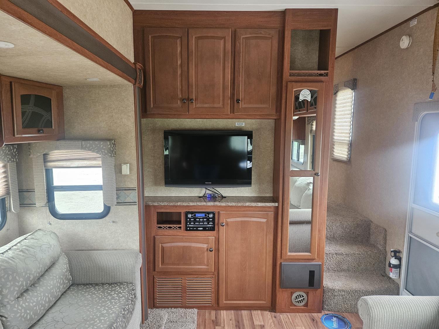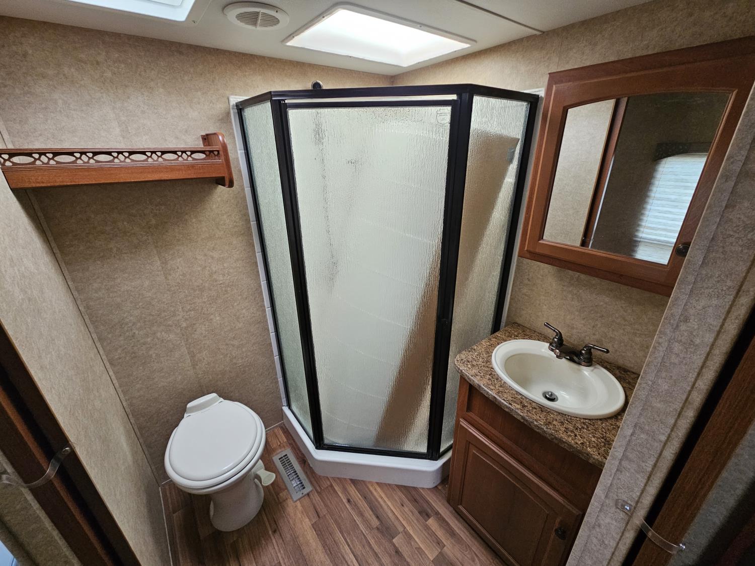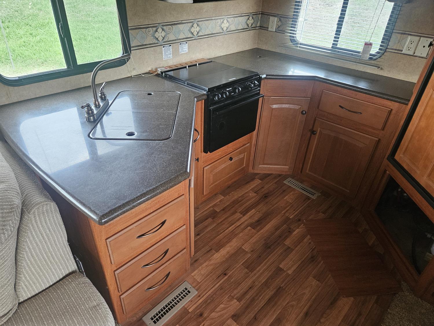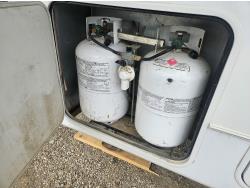 Sleeps 4, stove, fridge, microwave, full bath, master bedroom, A/C, outdoor shower, 2 slides, power awning, spring suspension, electric brakes, rear kitchen, dinette w/ extension, L shaped sofa, love seat w/bed, washer dryer compatible, new decals, new awning and arms, new seals around slide outs, one owner, storage compartments, queen size bed, rear hitch, rear cargo rack, extra shower surround, winterized