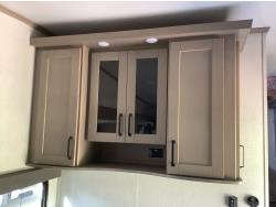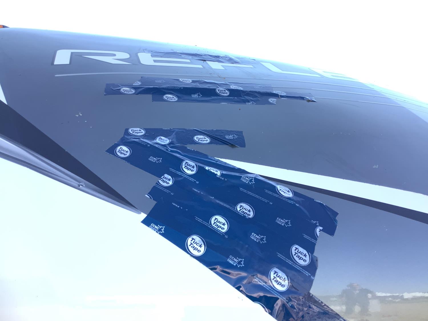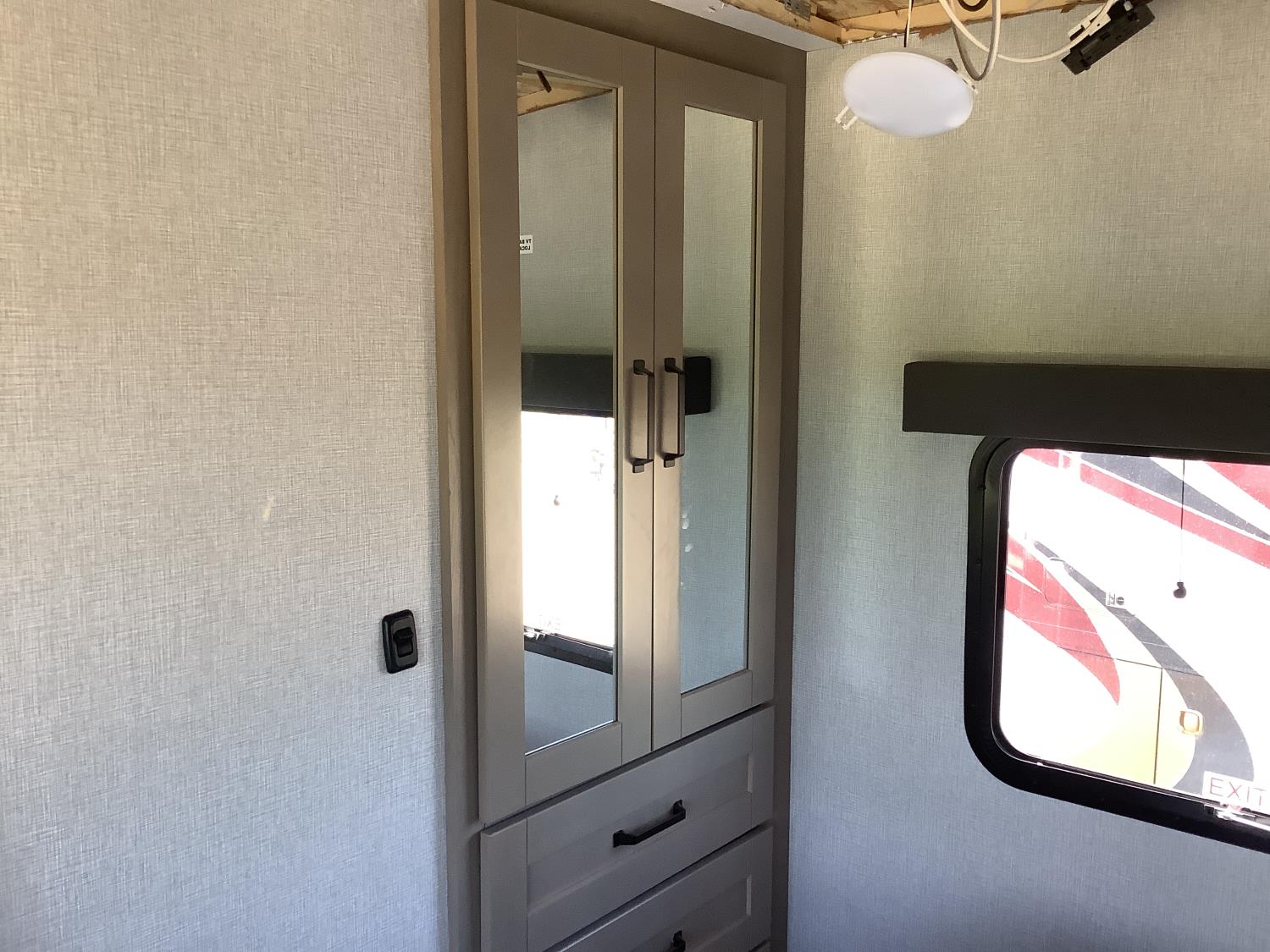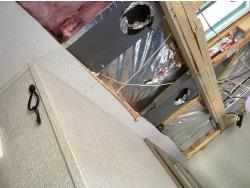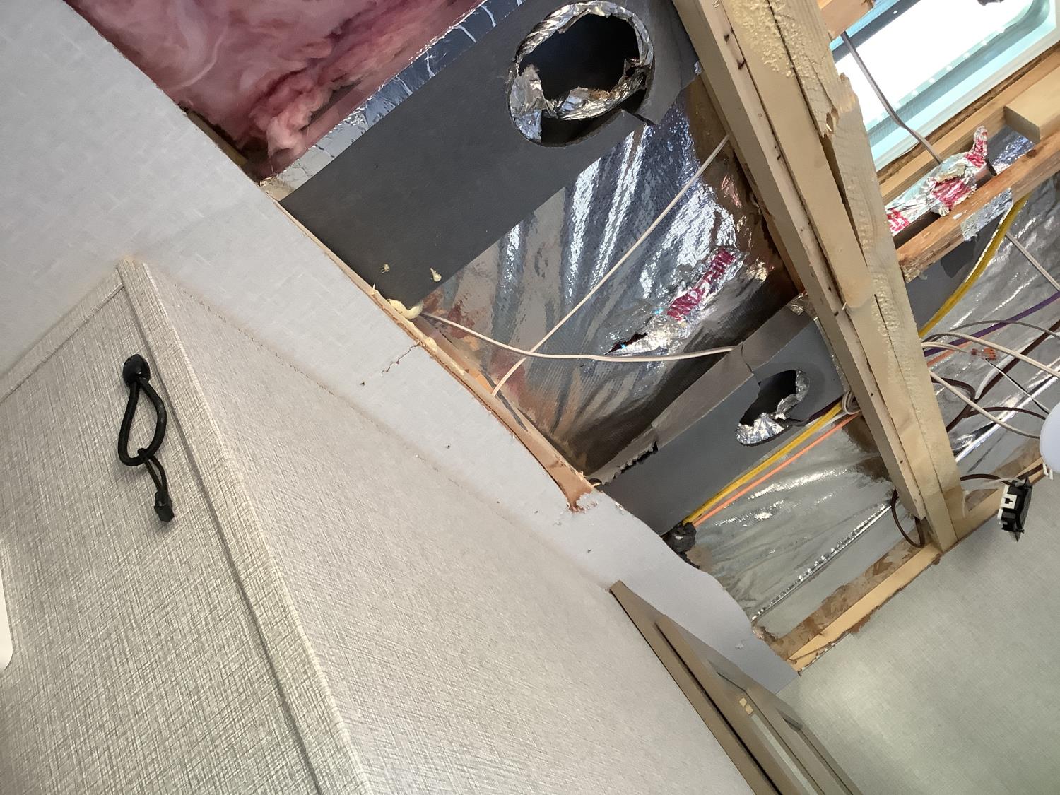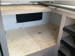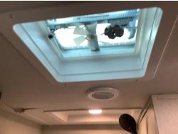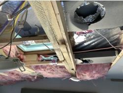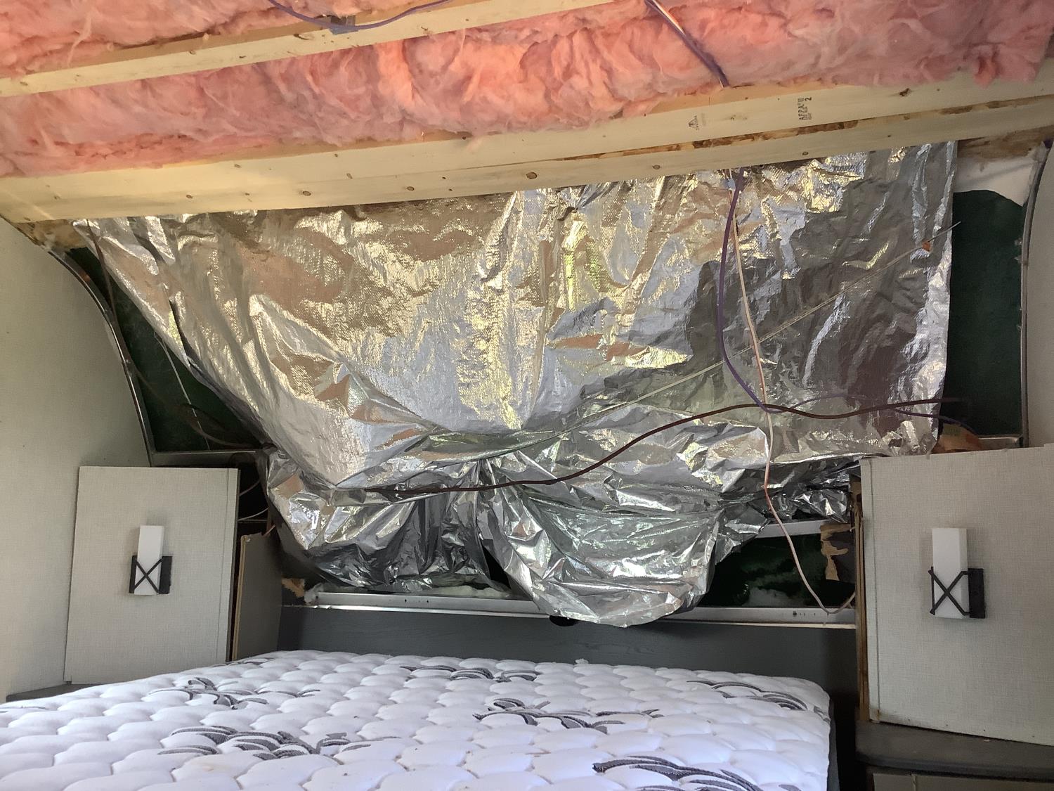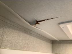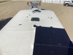 Here is the story on the front roof damage. Customer bought the trailer brand new. Took it to a RV camp ground that was very well treed set it up and left it to return on the weekend. A storm came and a tree broke and fell on the roof at the front of the trailer. There are a few fine cracks that you can see are taped up, the ceiling was removed as you can see some of the wood rafters are broken. This is a perfect trailer for the handy man to fix up. It was never used. A new one we priced is around $90,000 today.